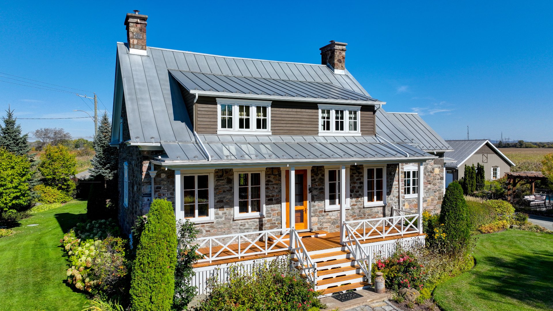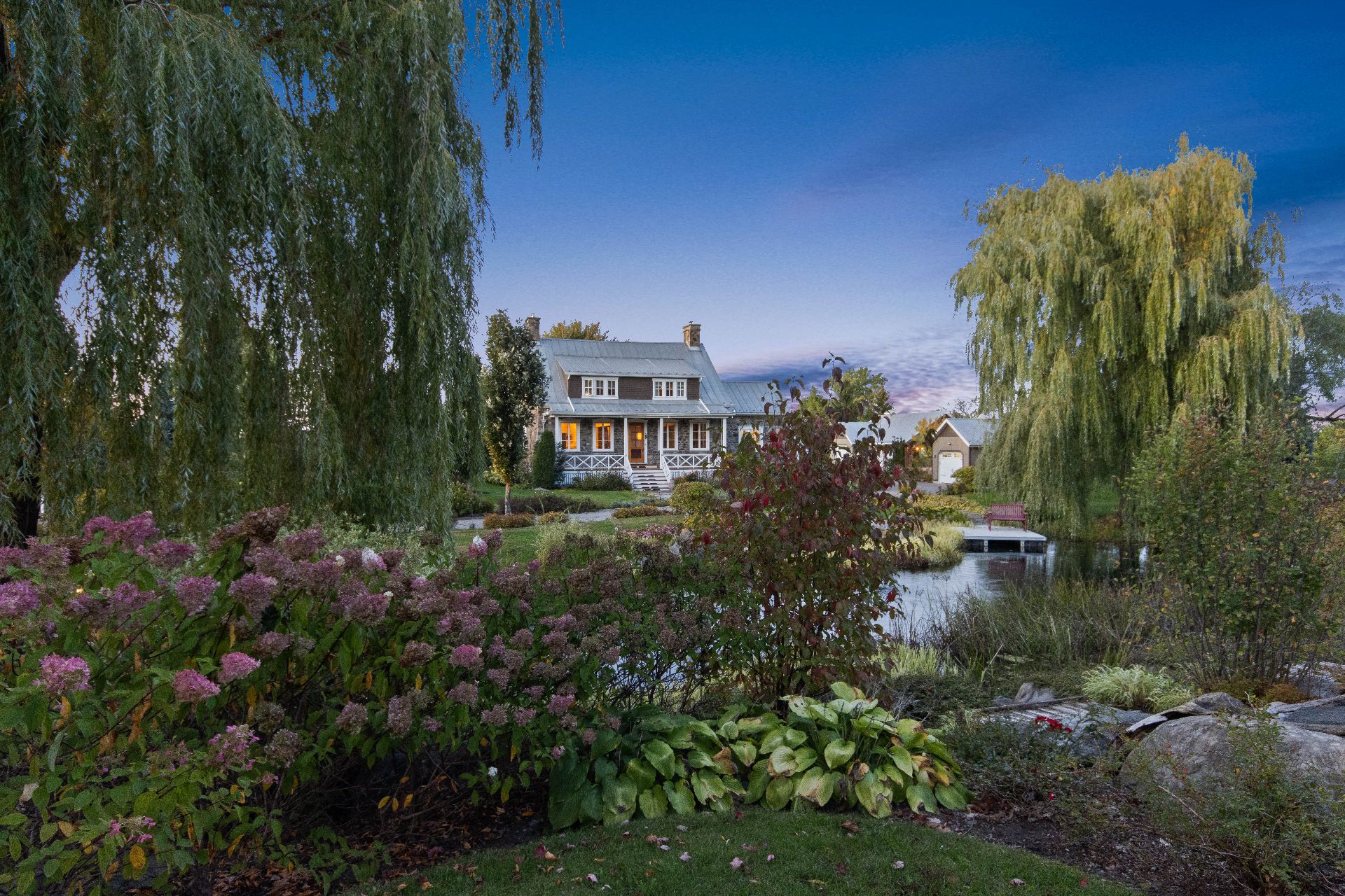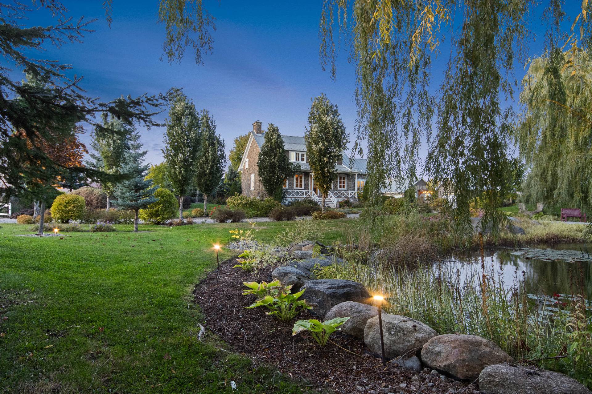 À l'extérieur, le terrain est muni d'un aménagement professionnel et bien pensé. Plusieurs bâtiments accessoires (garage, bureaux et remise). La piscine creusée et chauffée s'étend, entourée d'une invitante terrasse en bois. L'étang, bordé de végétation naturelle, complète ce tableau paysager en reflétant des jeux de lumière changeants.