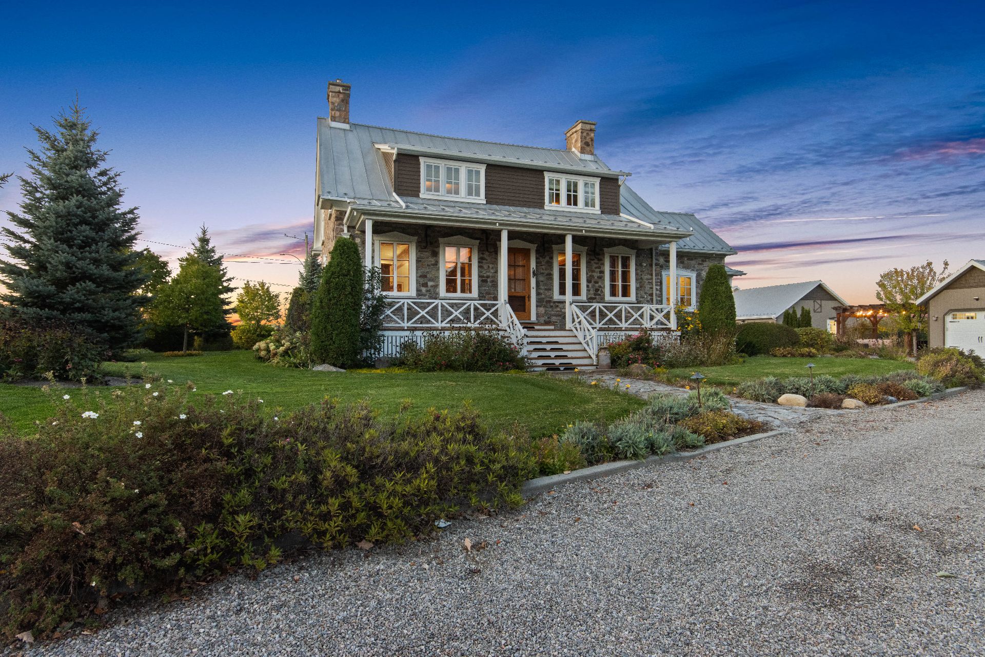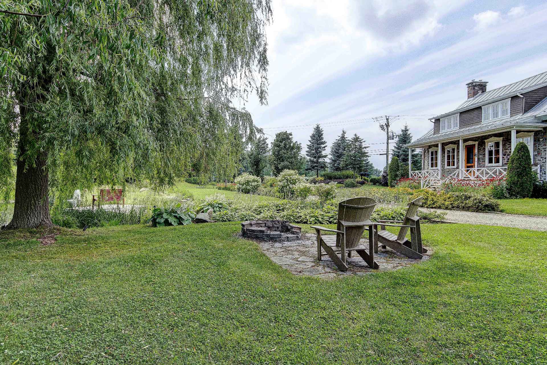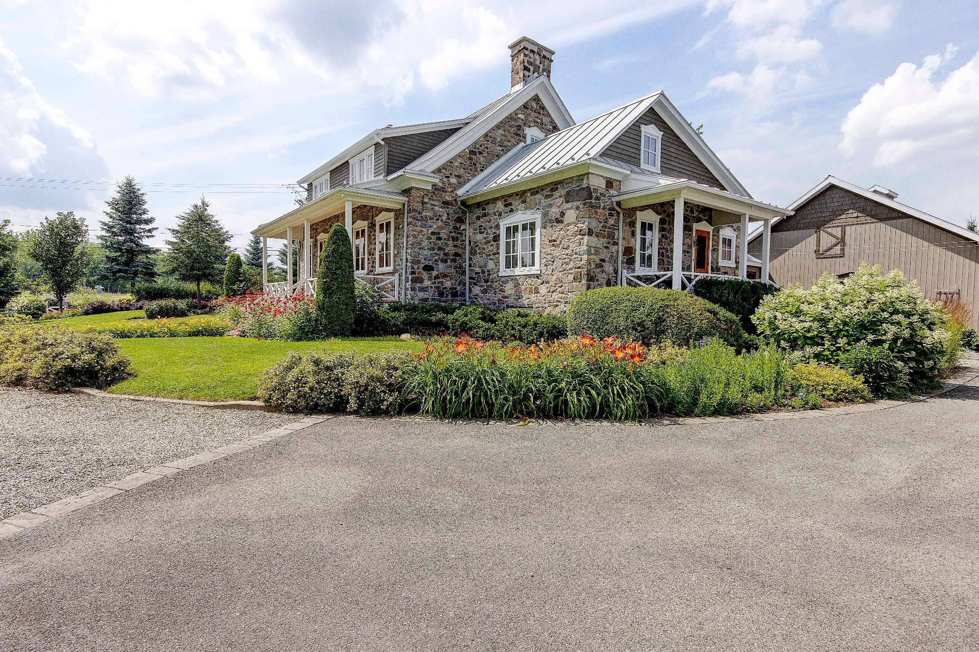 À l'extérieur, le terrain est muni d'un aménagement professionnel et bien pensé. Plusieurs bâtiments accessoires (garage, bureaux et remise). La piscine creusée et chauffée s'étend, entourée d'une invitante terrasse en bois. L'étang, bordé de végétation naturelle, complète ce tableau paysager en reflétant des jeux de lumière changeants.