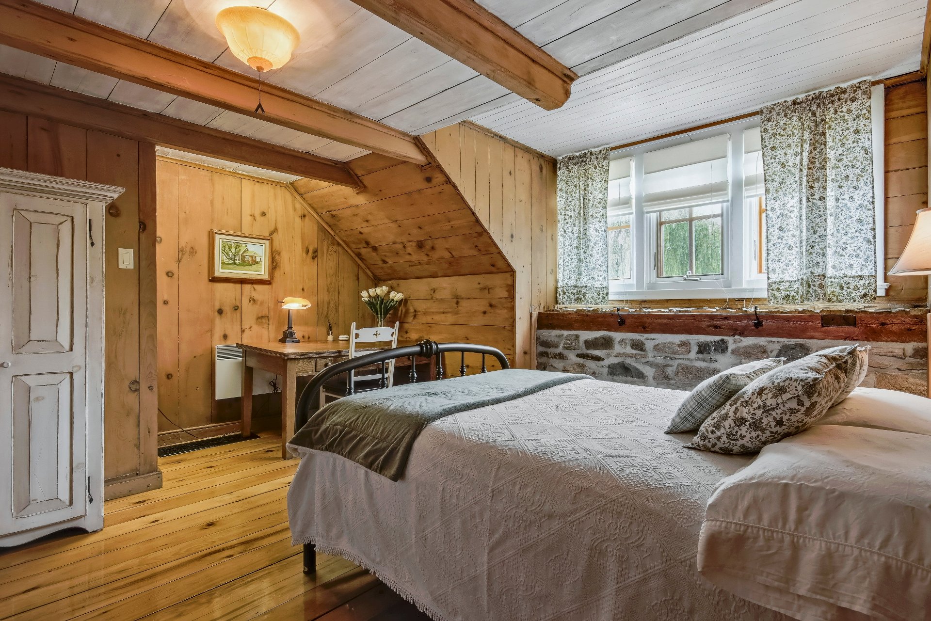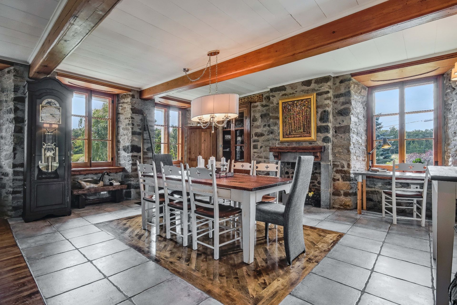 À l'intérieur, les détails se dévoilent à travers la qualité des travaux de préservation : le bois centenaire des planchers et les moulures ornementales soulignent la finesse architecturale. Le plafond à caissons, revisité avec subtilité, structure les espaces sans jamais les alourdir. Le salon s'ouvre généreusement sur l'extérieur grâce à de larges baies vitrées, harmonisant lumière naturelle et panorama sur le jardin.