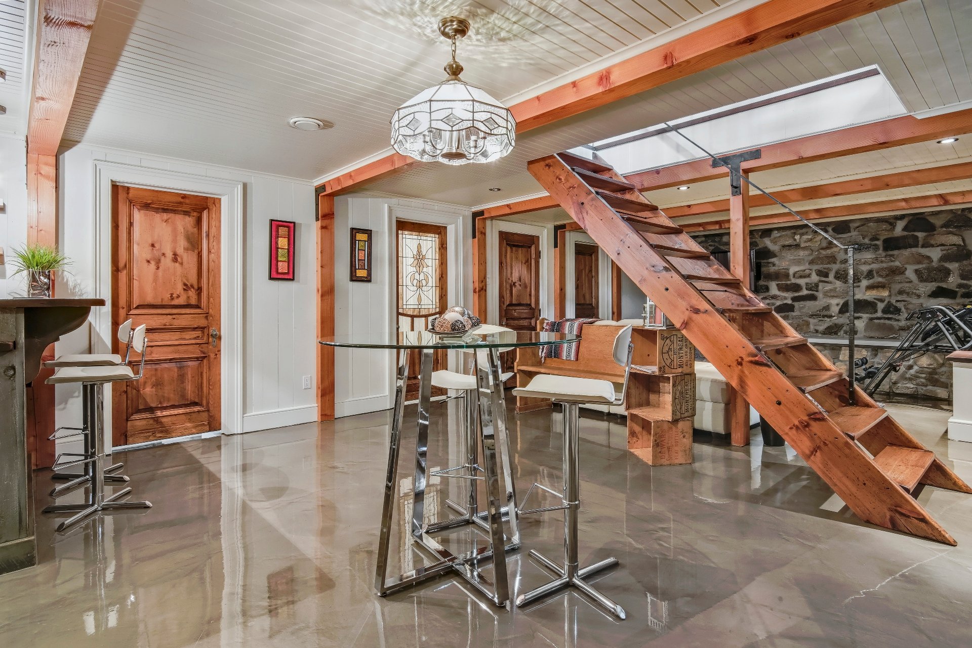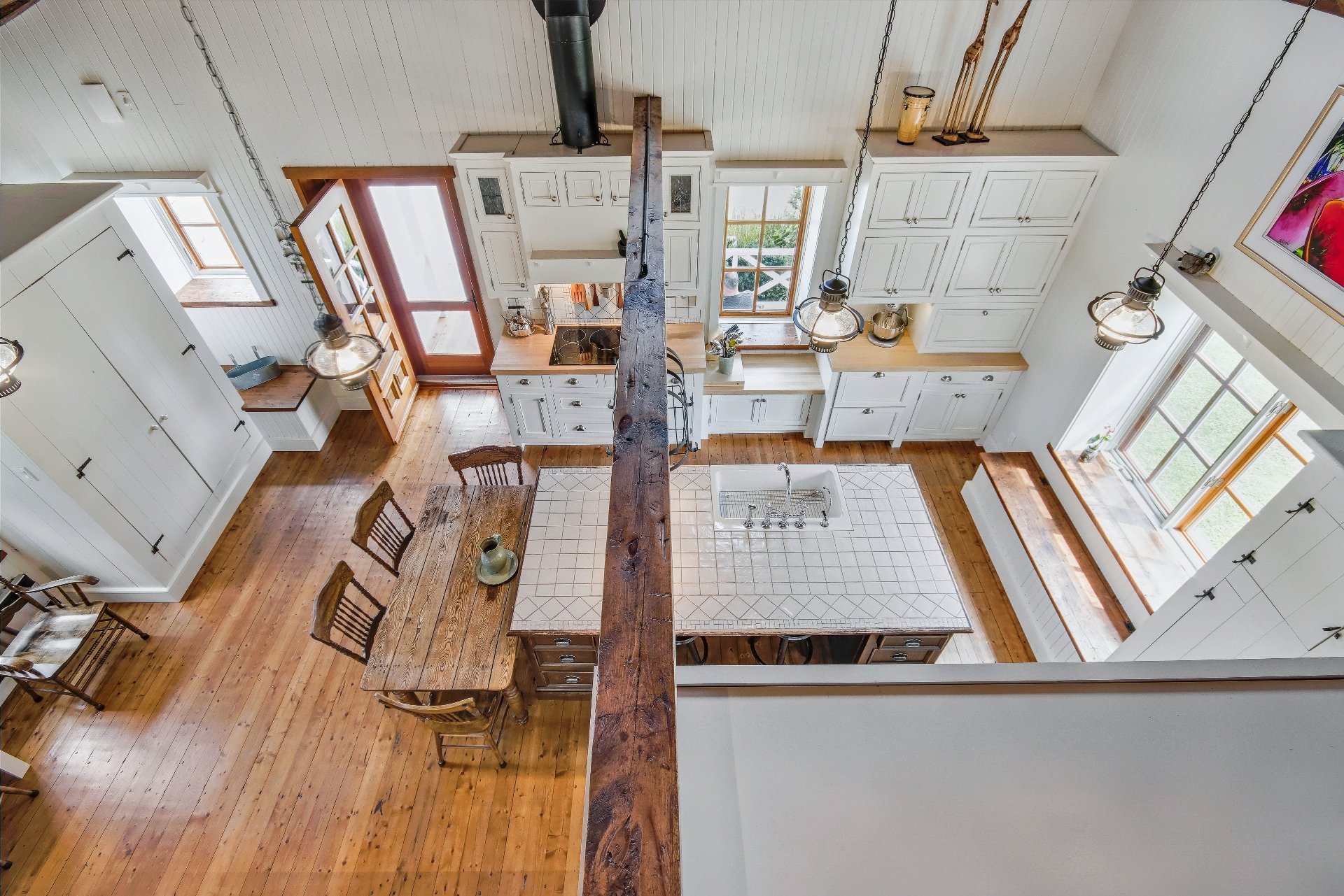 La cuisine, au design épuré, s'intègre avec élégance dans le décor ancien grâce à des touches de tradition : garde-corps ouvragés, luminaires en laiton patiné et comptoir en quartz posé au coeur d'un îlot accueillant. Chaque détail -- poignées, robinetterie, rangements discrets -- témoigne d'un souci d'esthétique et de fonctionnalité.