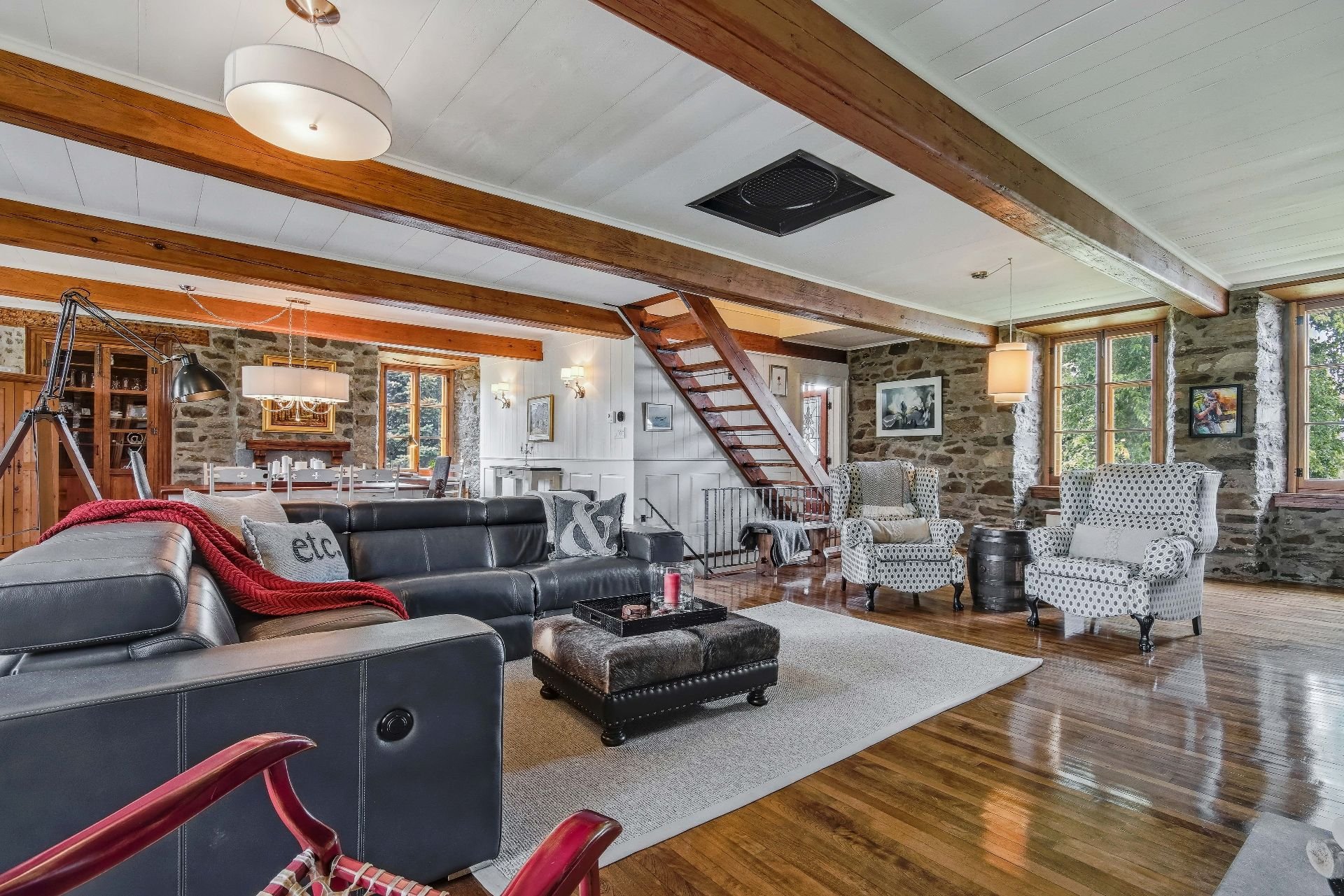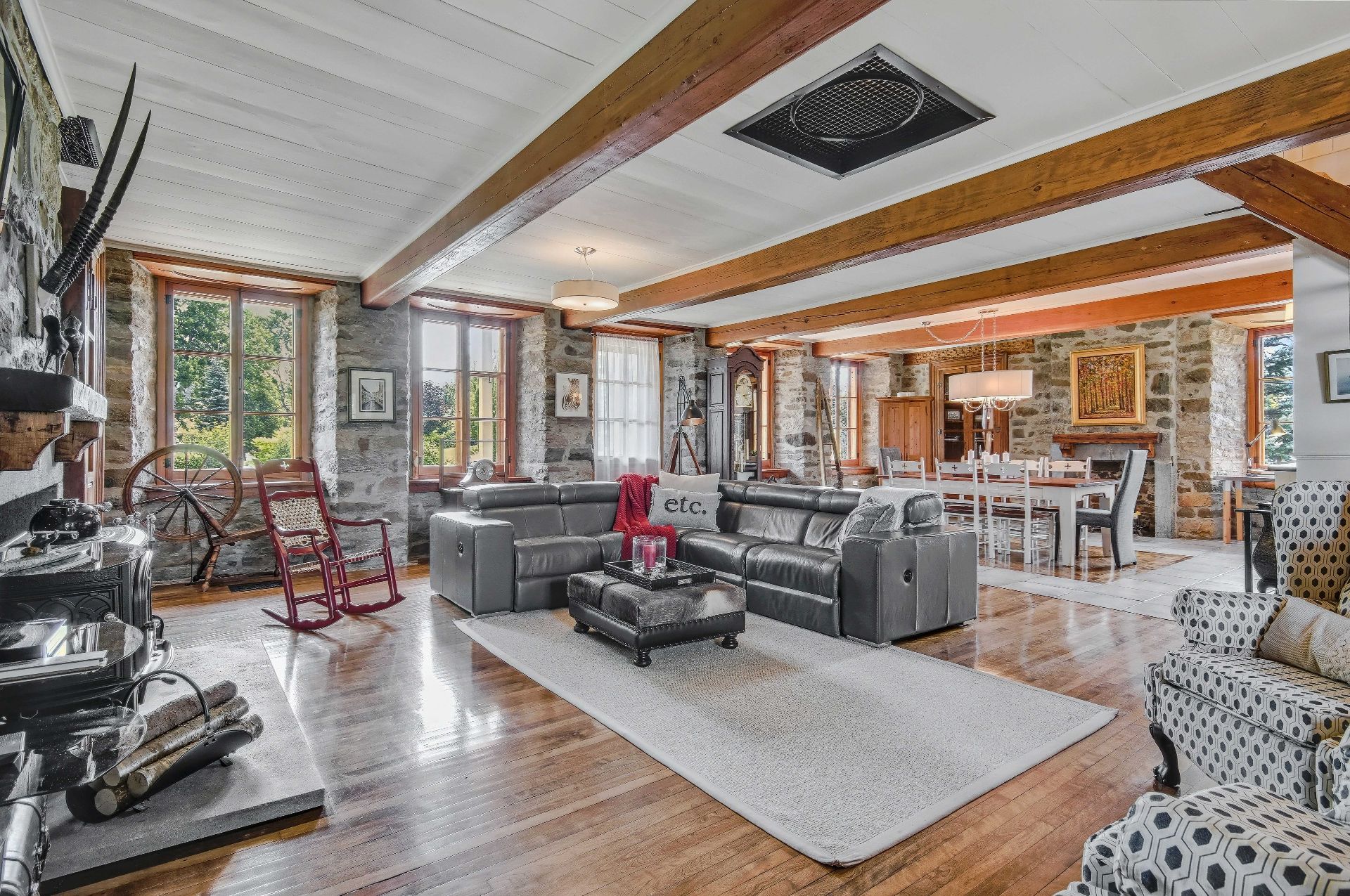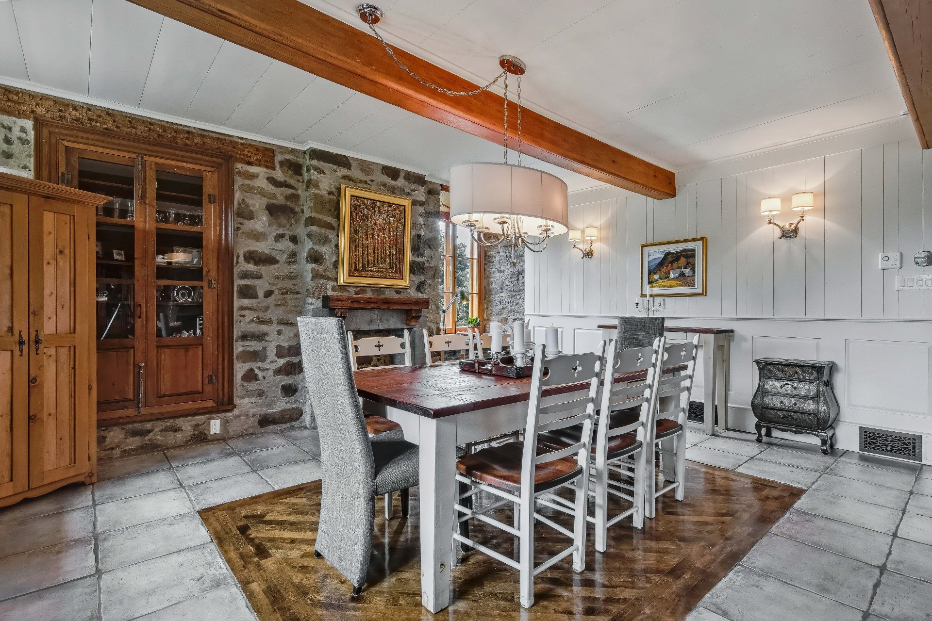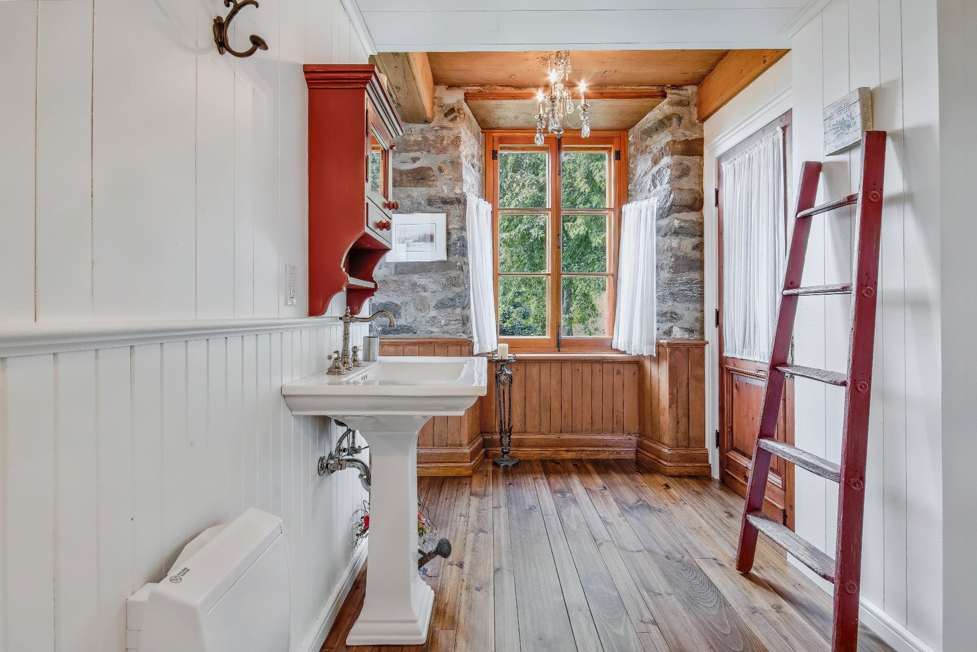 À l'intérieur, les détails se dévoilent à travers la qualité des travaux de préservation : le bois centenaire des planchers et les moulures ornementales soulignent la finesse architecturale. Le plafond à caissons, revisité avec subtilité, structure les espaces sans jamais les alourdir. Le salon s'ouvre généreusement sur l'extérieur grâce à de larges baies vitrées, harmonisant lumière naturelle et panorama sur le jardin.