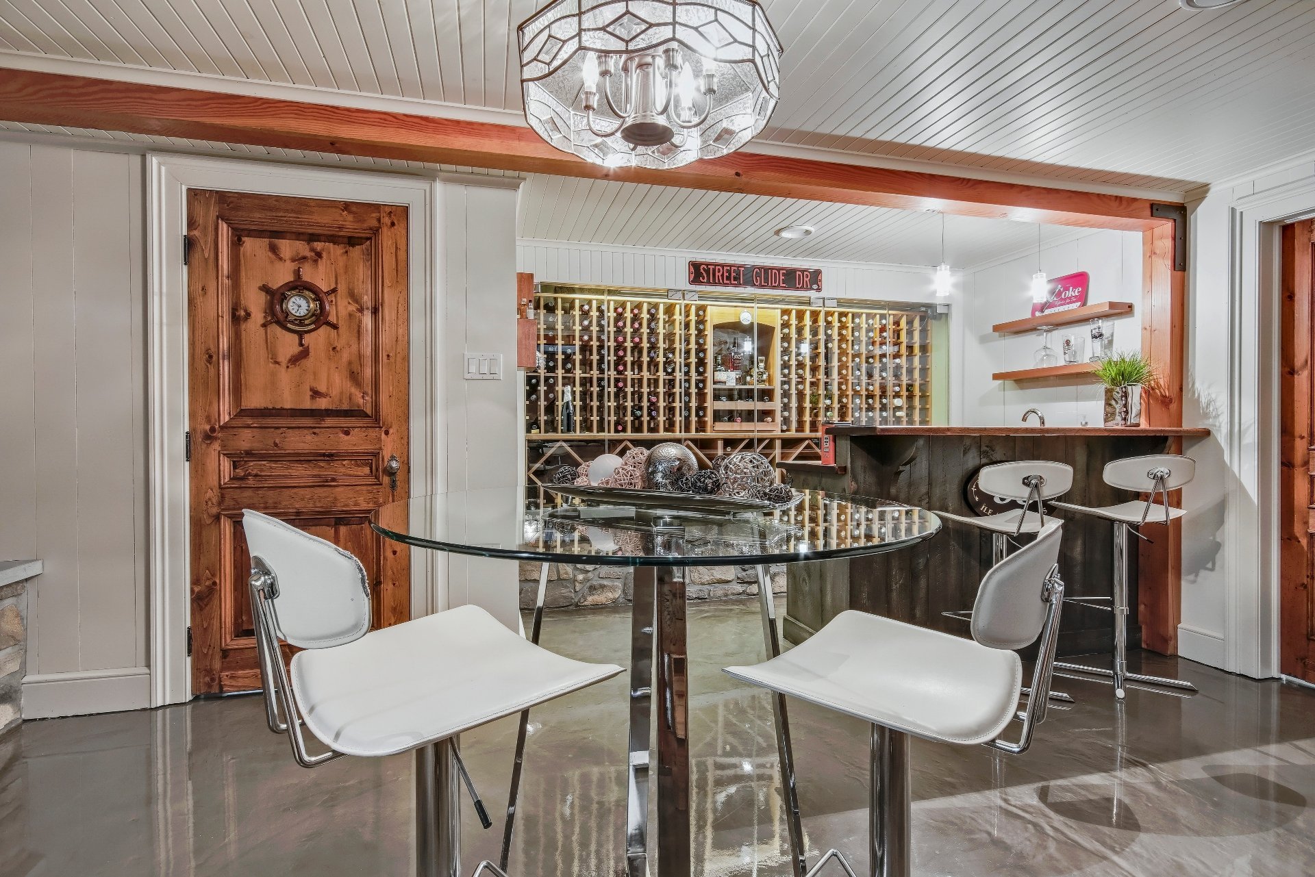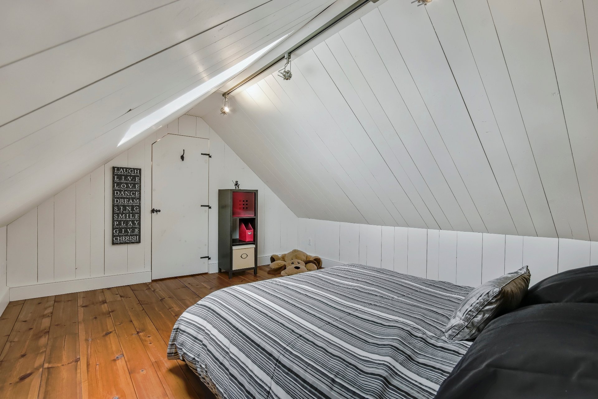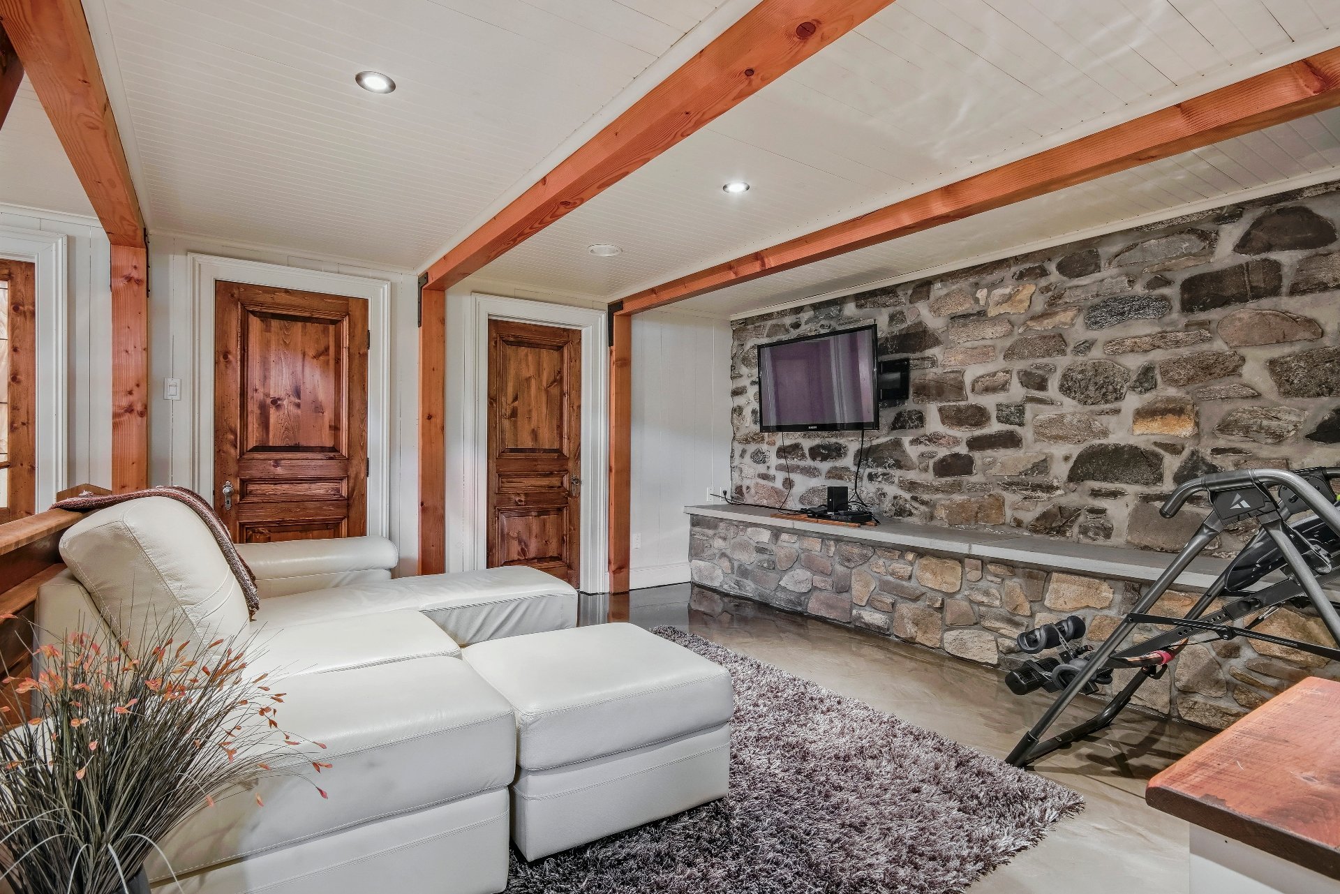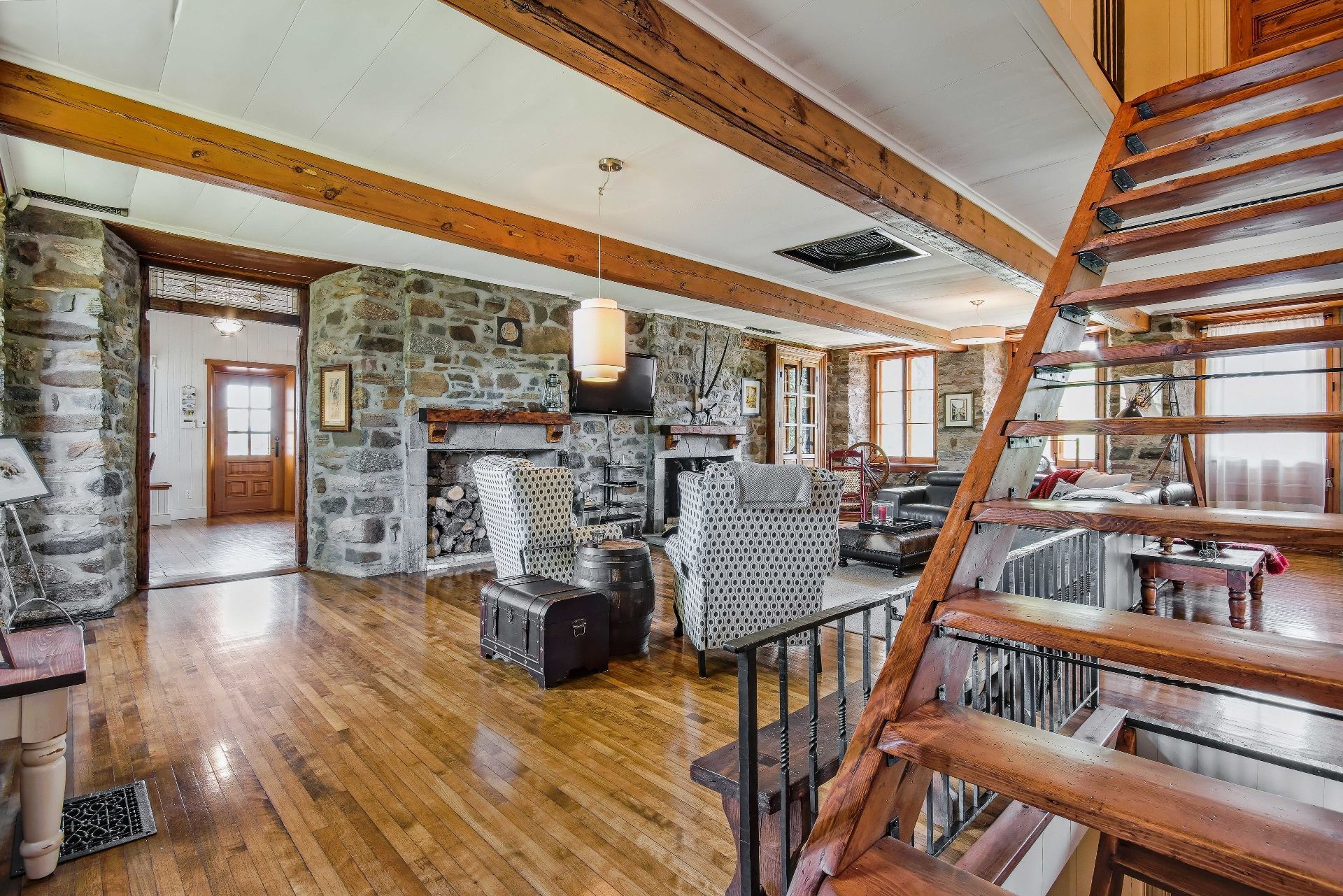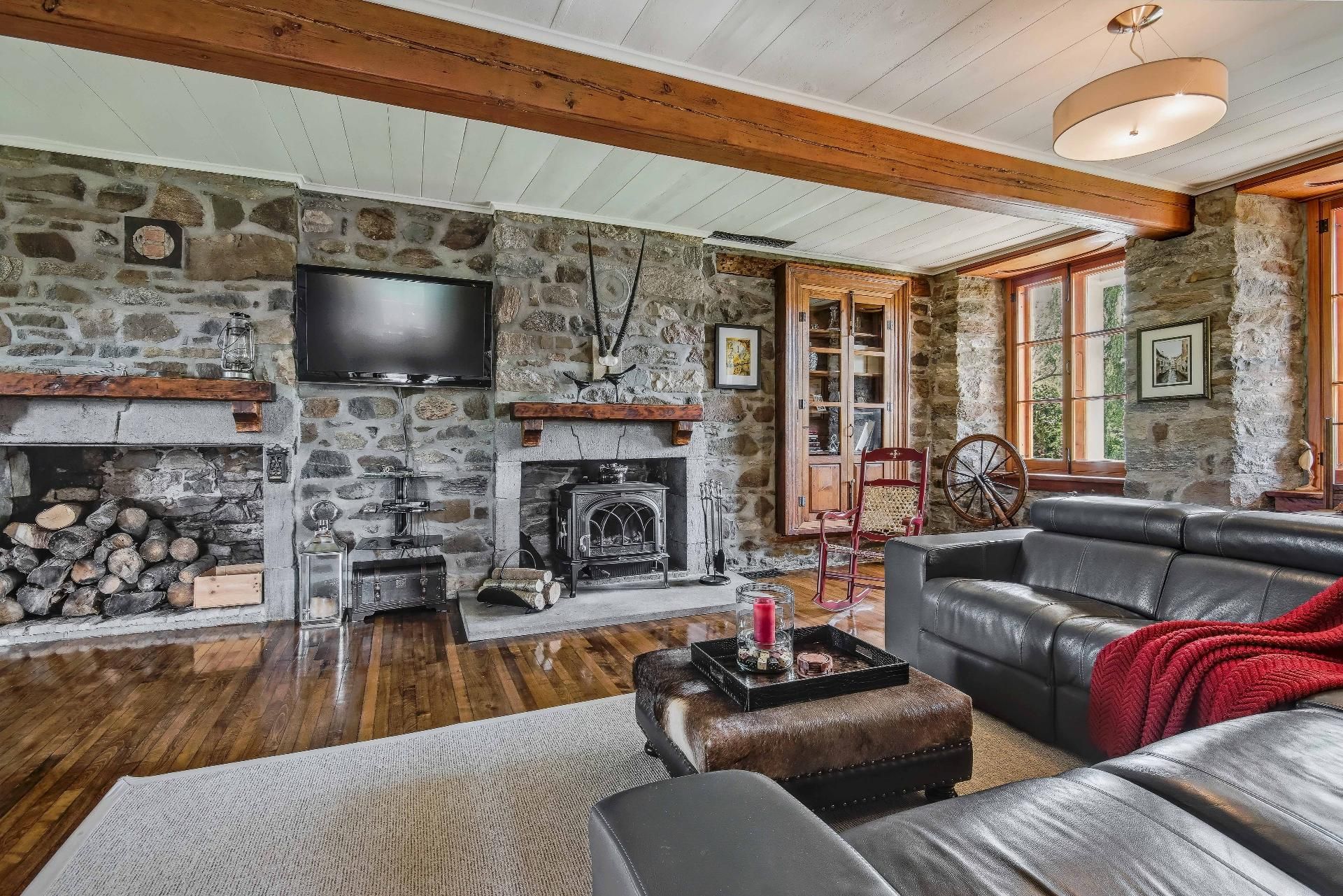À l'intérieur, les détails se dévoilent à travers la qualité des travaux de préservation : le bois centenaire des planchers et les moulures ornementales soulignent la finesse architecturale. Le plafond à caissons, revisité avec subtilité, structure les espaces sans jamais les alourdir. Le salon s'ouvre généreusement sur l'extérieur grâce à de larges baies vitrées, harmonisant lumière naturelle et panorama sur le jardin.