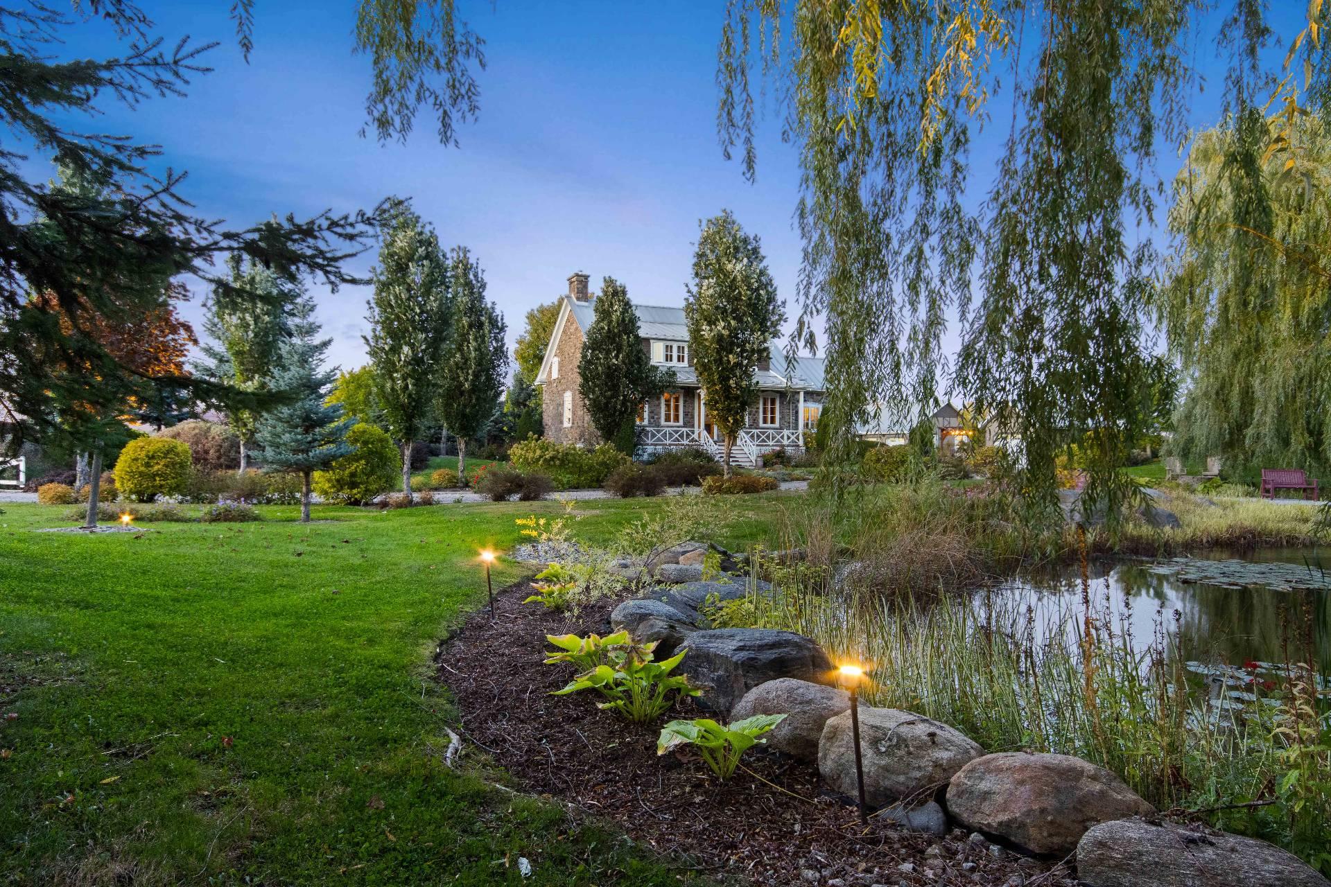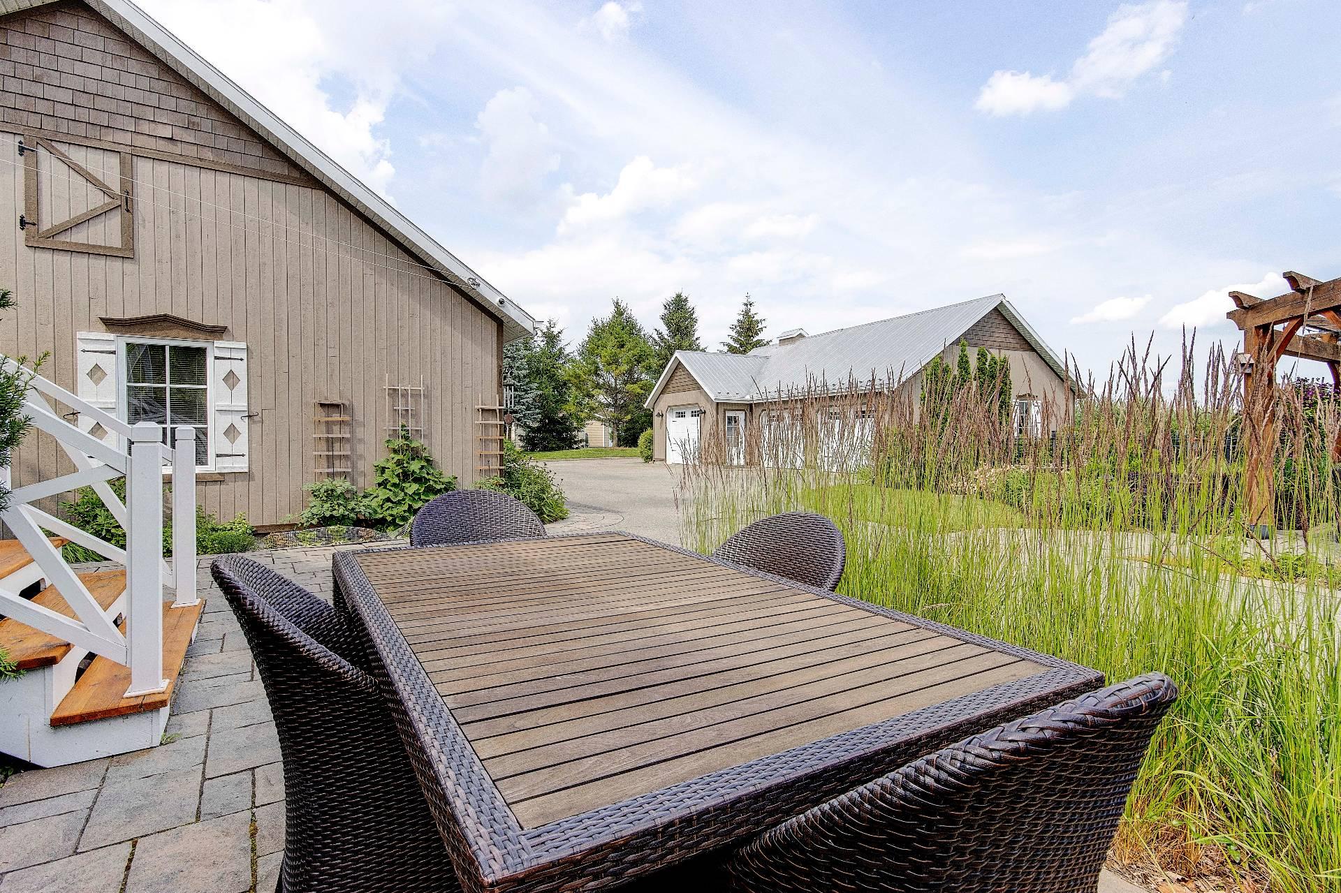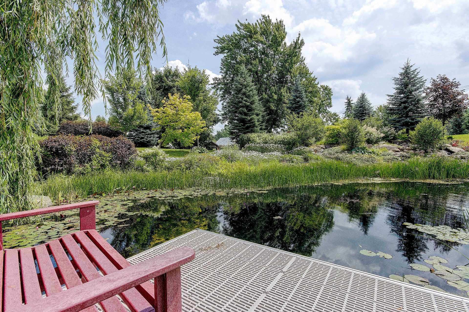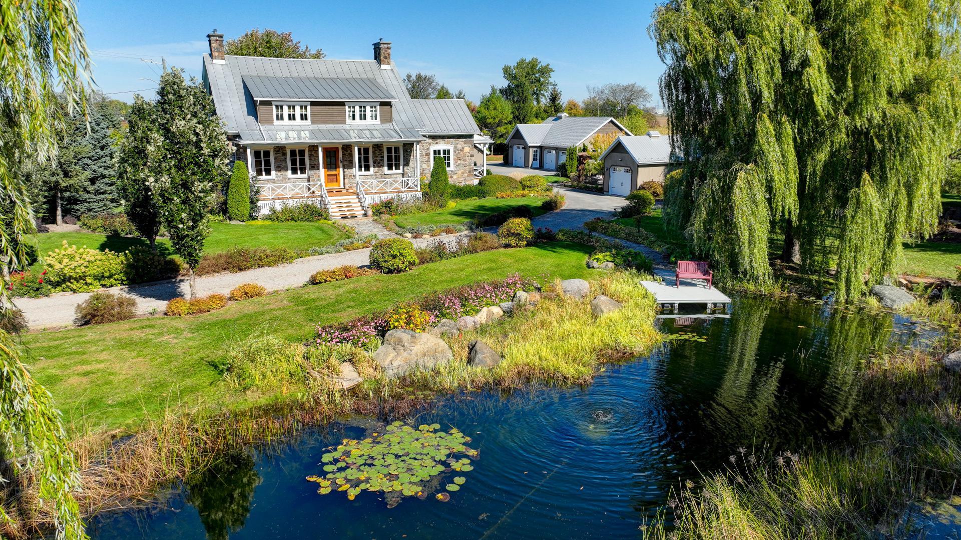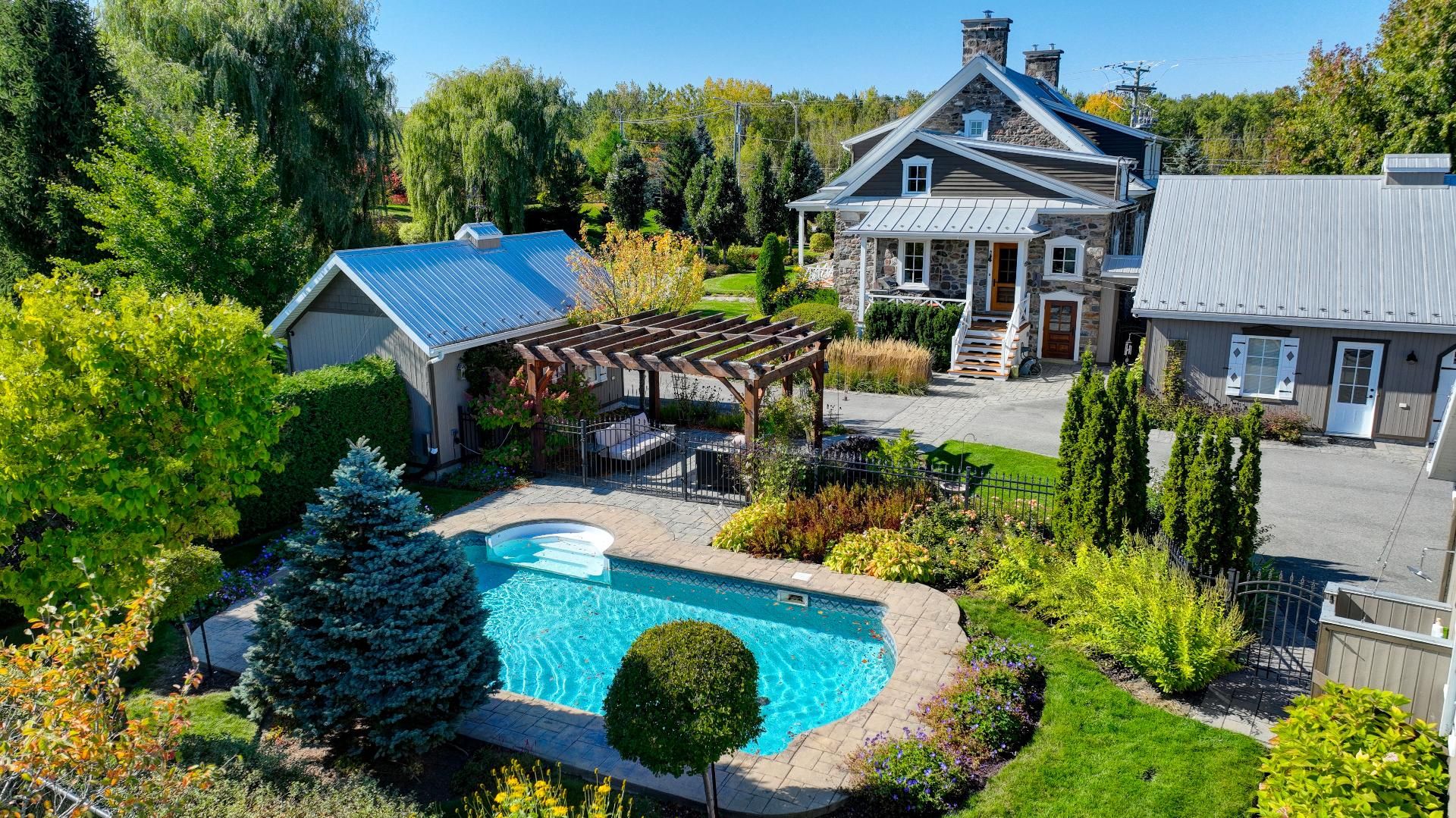 À l'extérieur, le terrain est muni d'un aménagement professionnel et bien pensé. Plusieurs bâtiments accessoires (garage, bureaux et remise). La piscine creusée et chauffée s'étend, entourée d'une invitante terrasse en bois. L'étang, bordé de végétation naturelle, complète ce tableau paysager en reflétant des jeux de lumière changeants.