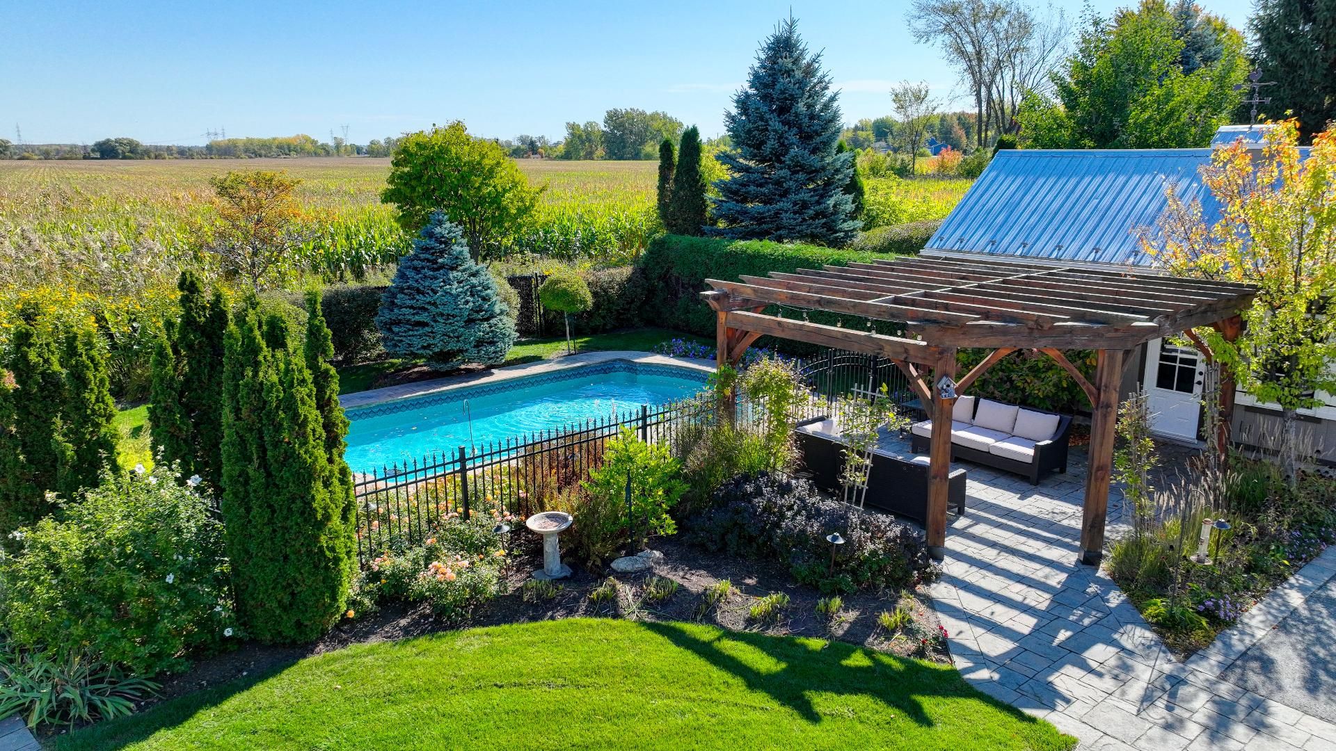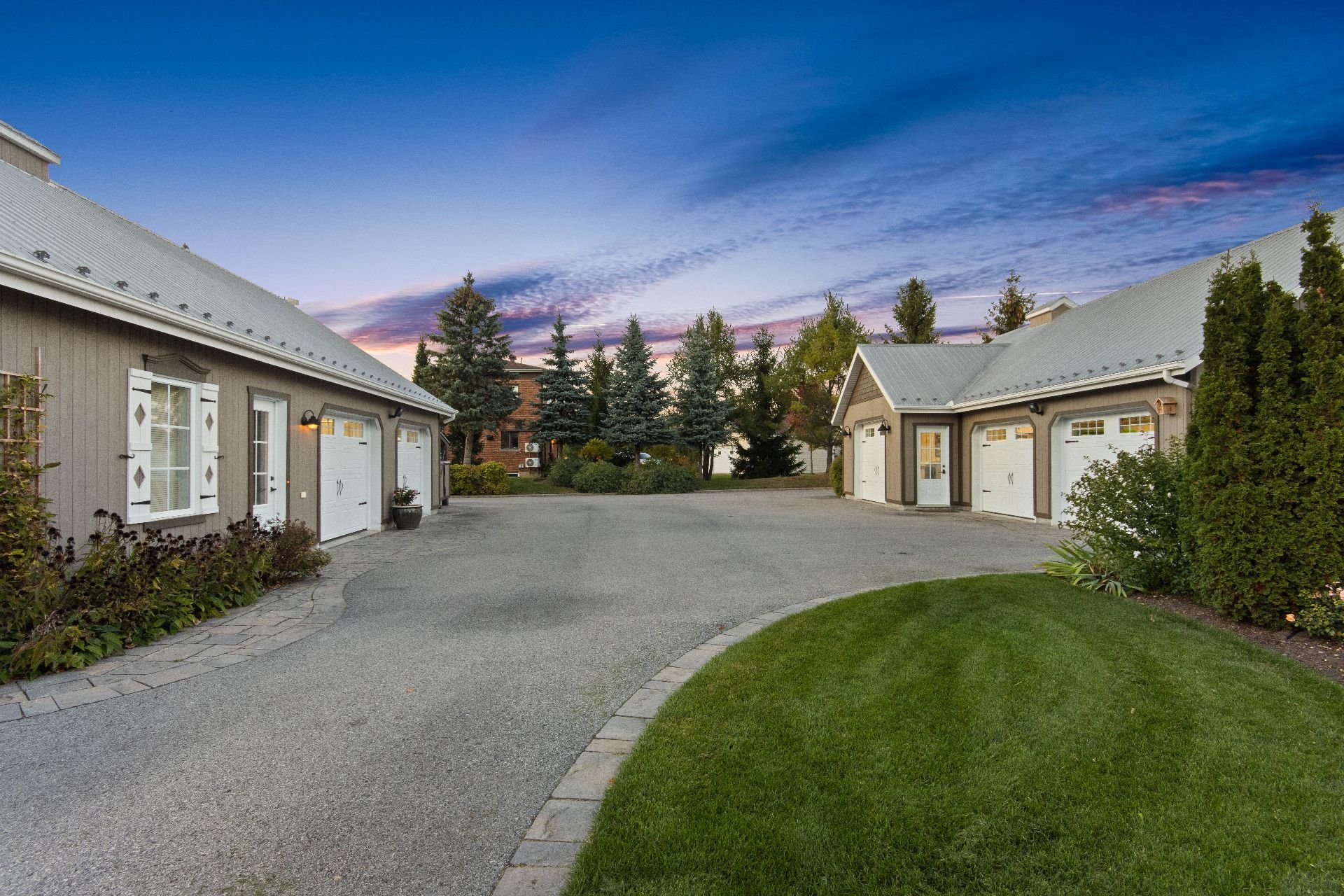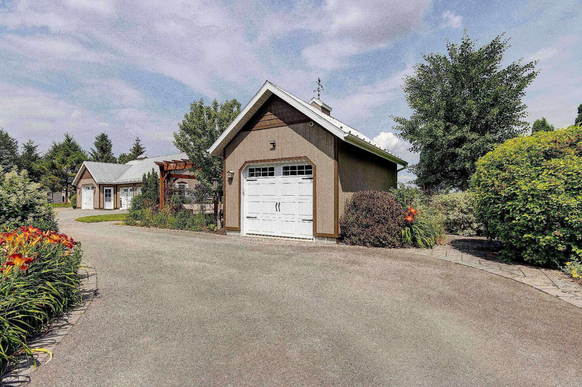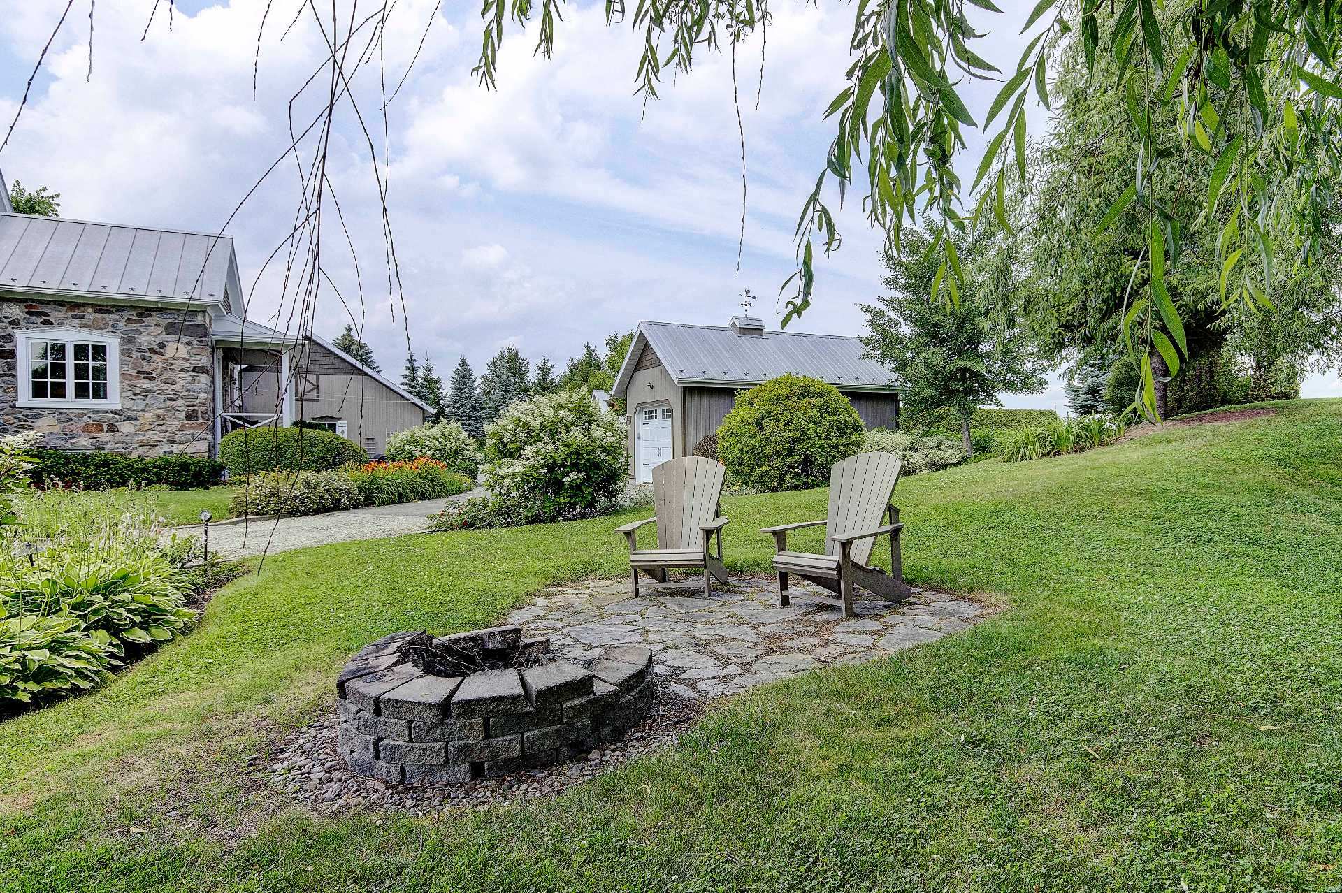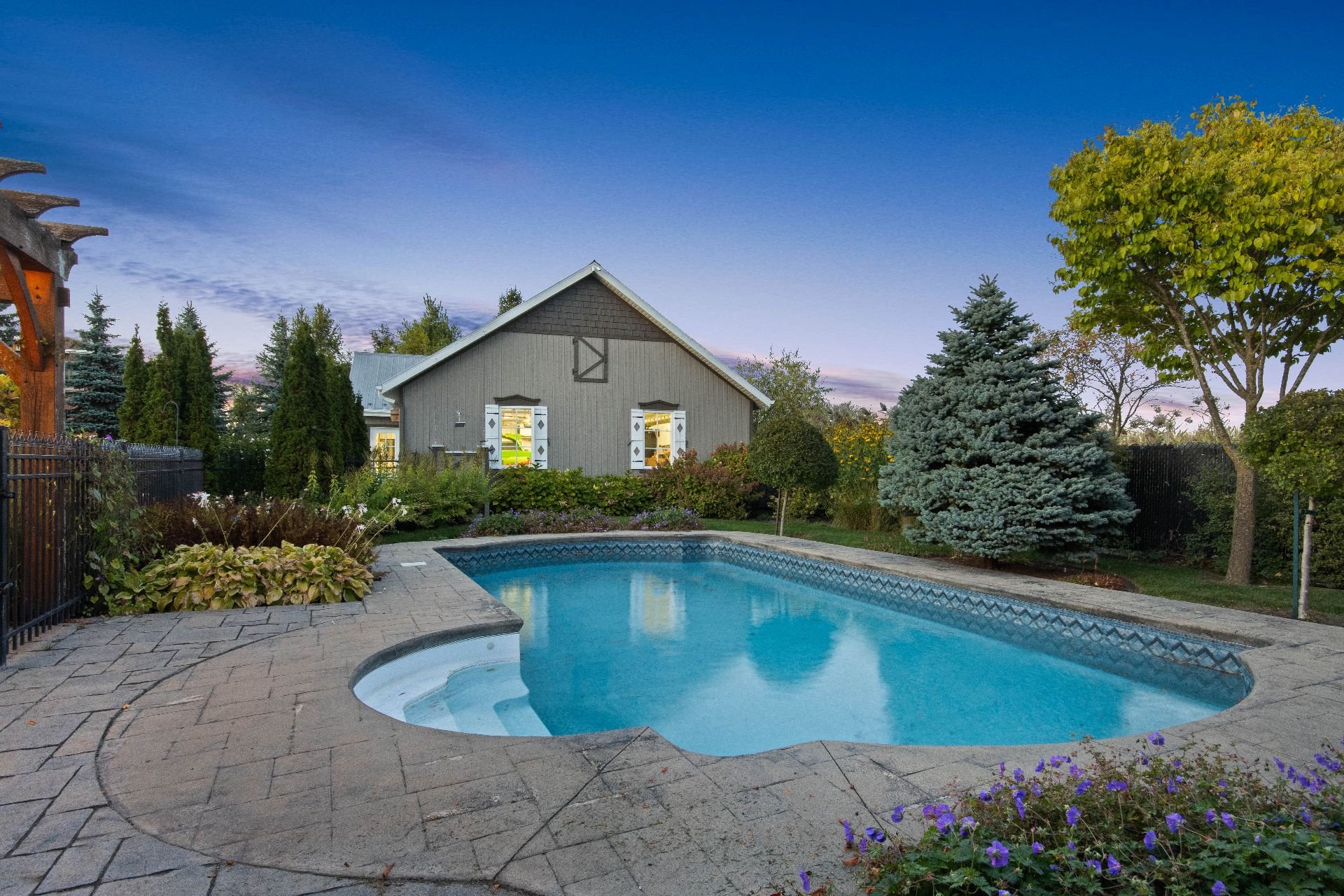 À l'extérieur, le terrain est muni d'un aménagement professionnel et bien pensé. Plusieurs bâtiments accessoires (garage, bureaux et remise). La piscine creusée et chauffée s'étend, entourée d'une invitante terrasse en bois. L'étang, bordé de végétation naturelle, complète ce tableau paysager en reflétant des jeux de lumière changeants.