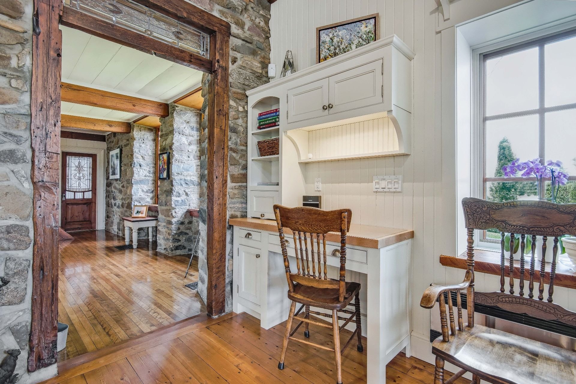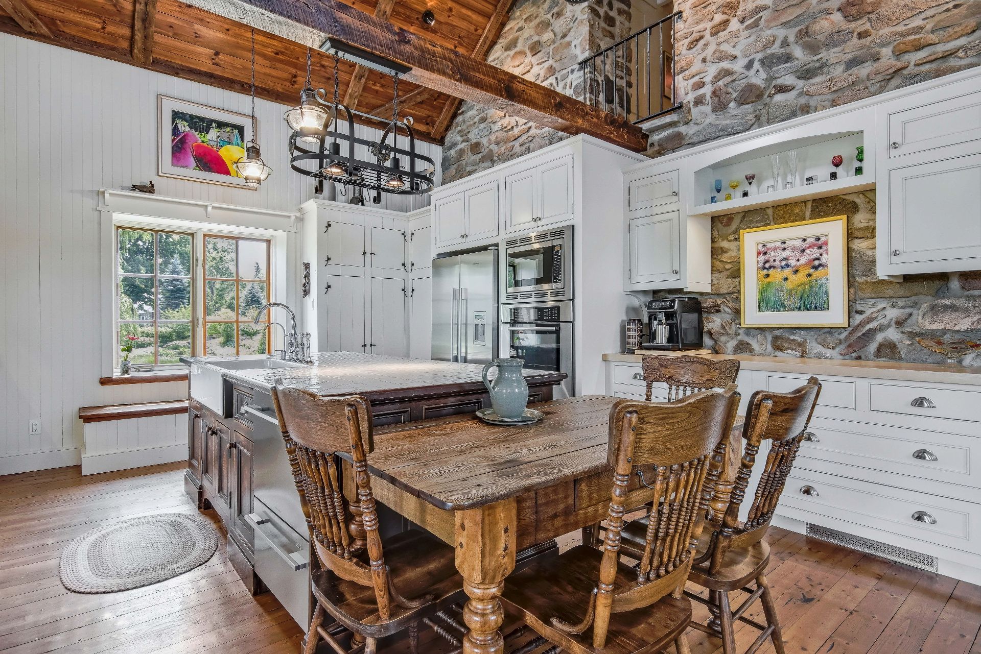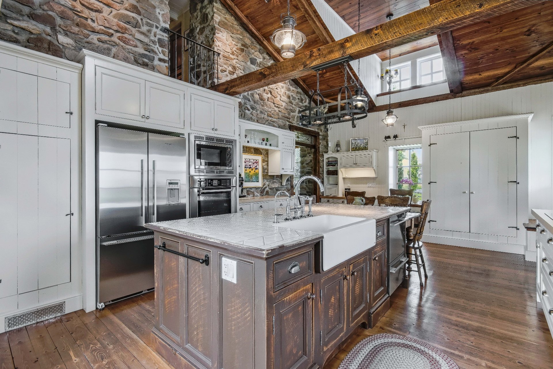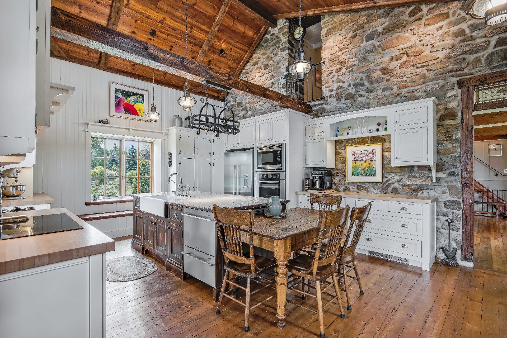 La cuisine, au design épuré, s'intègre avec élégance dans le décor ancien grâce à des touches de tradition : garde-corps ouvragés, luminaires en laiton patiné et comptoir en quartz posé au coeur d'un îlot accueillant. Chaque détail -- poignées, robinetterie, rangements discrets -- témoigne d'un souci d'esthétique et de fonctionnalité.
