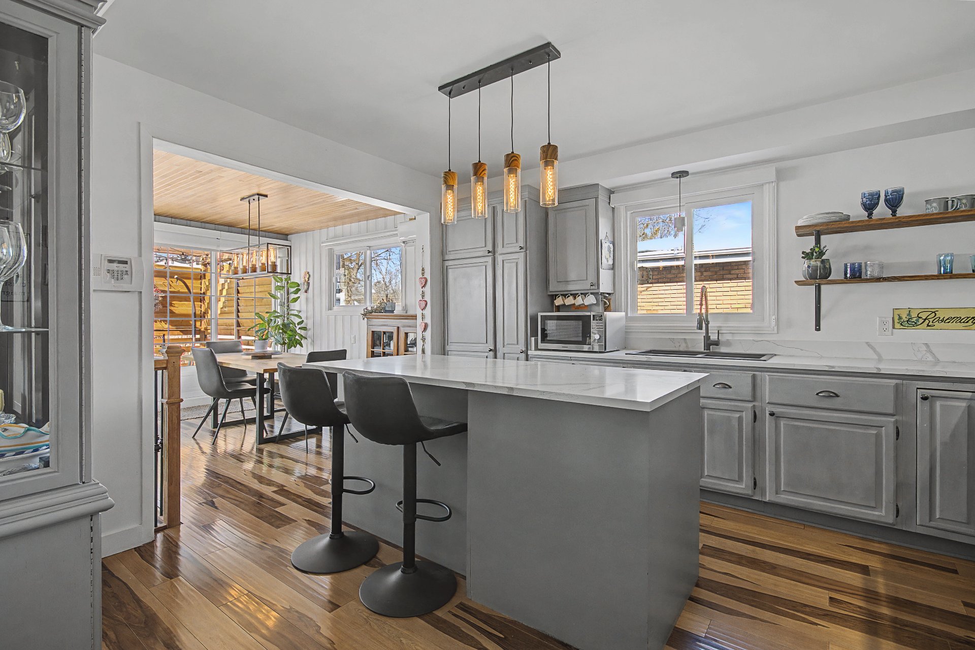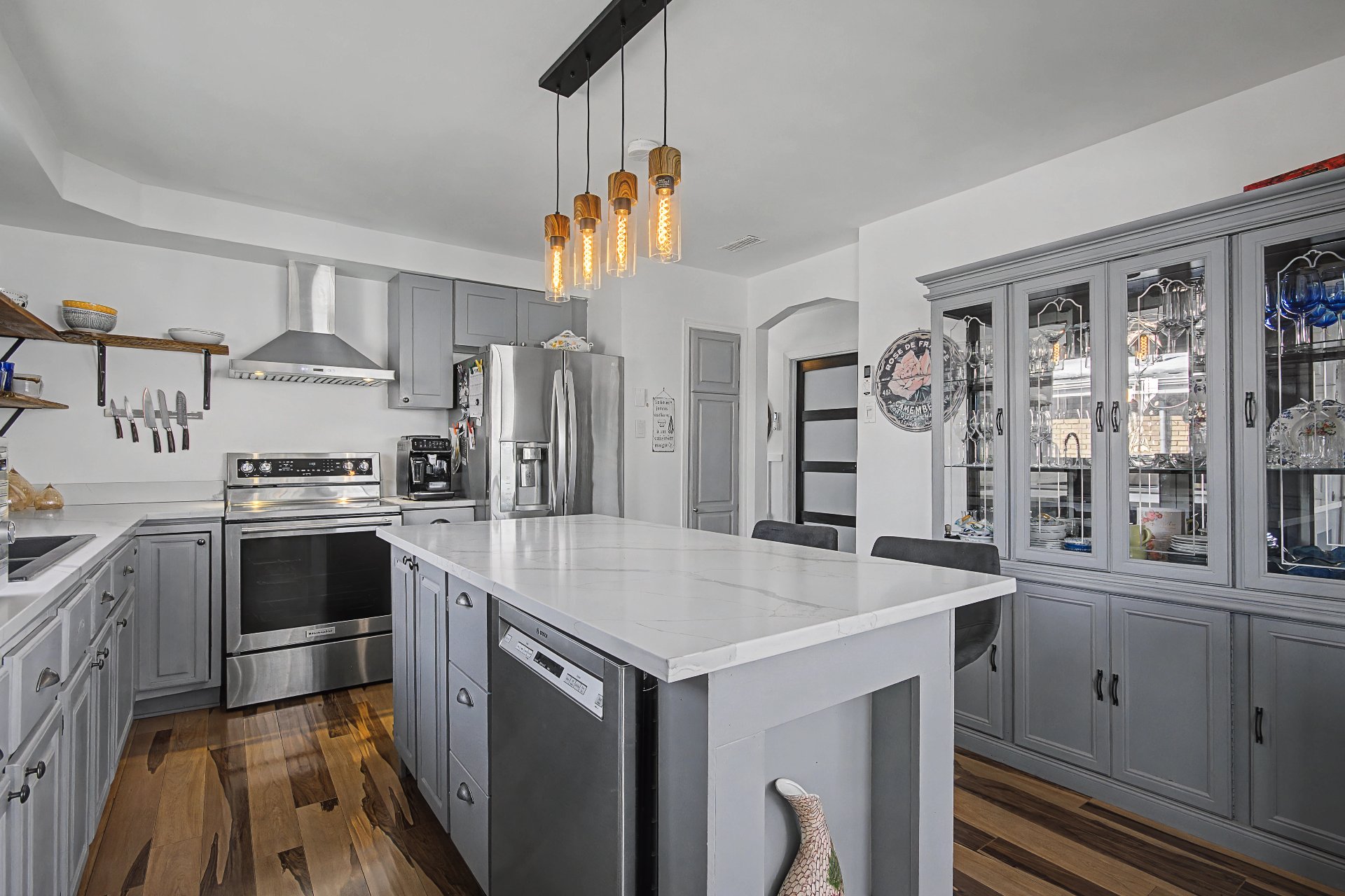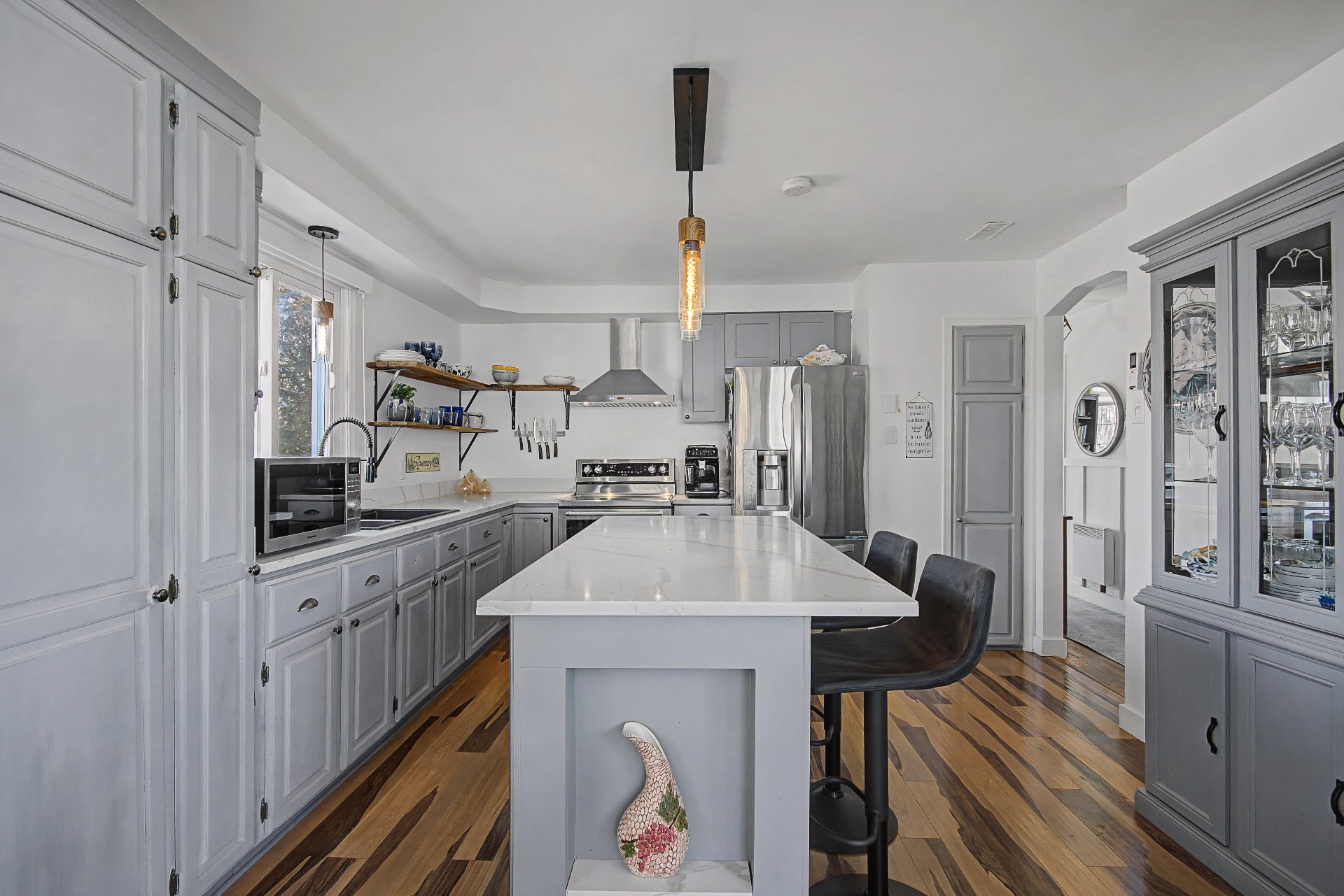 Lave-vaisselle, meubles de cuisine, tous les stores incluant les stores électriques (une garantie demeure en vigueur), tous les luminaires, hotte de poêle, balayeuse centrale, ainsi que le foyer électrique du salon.