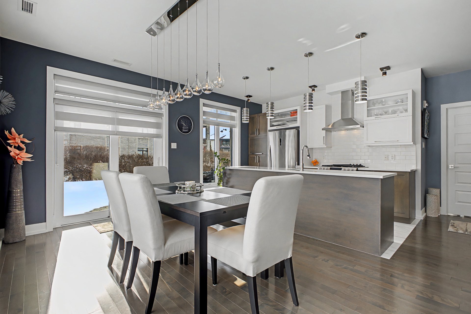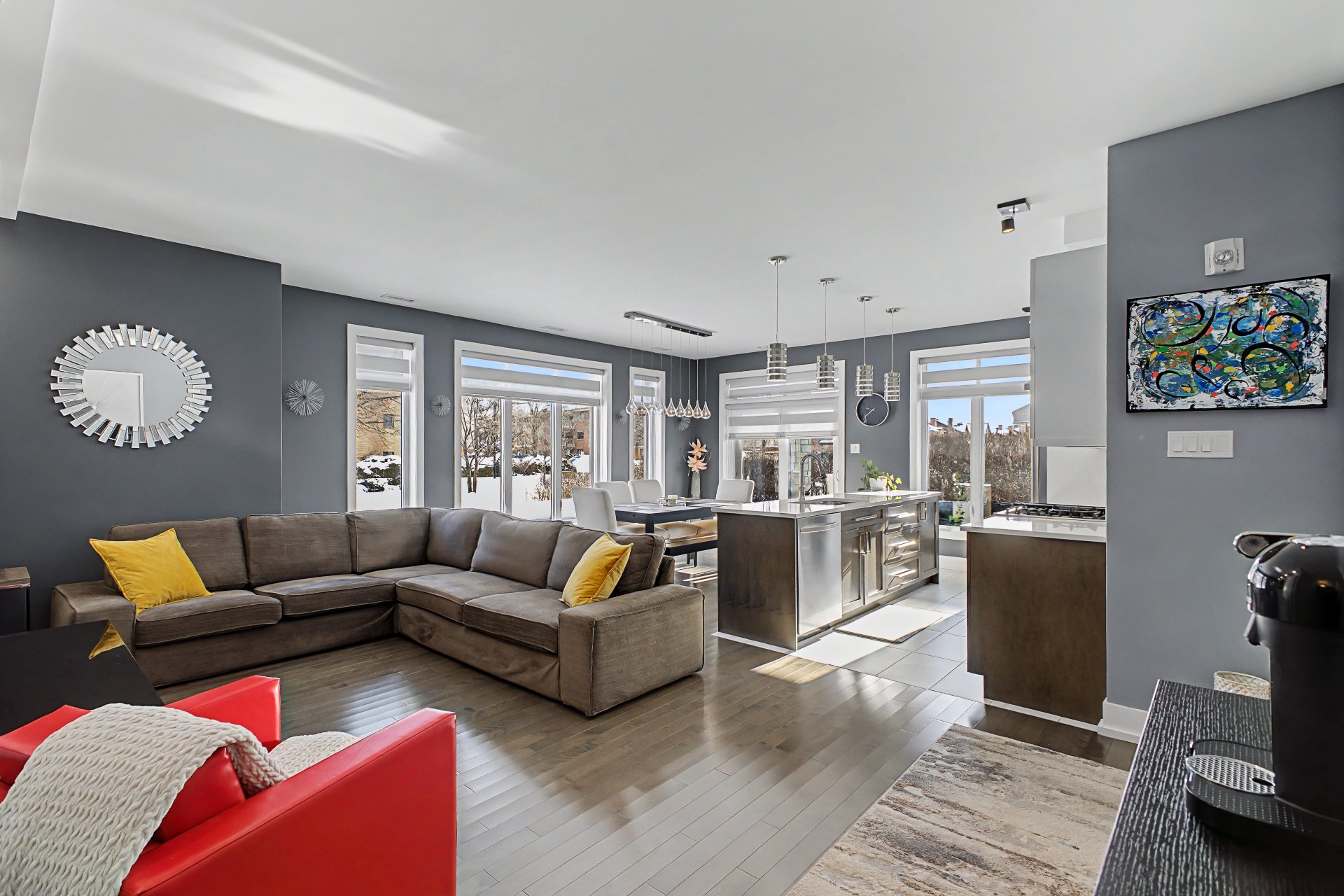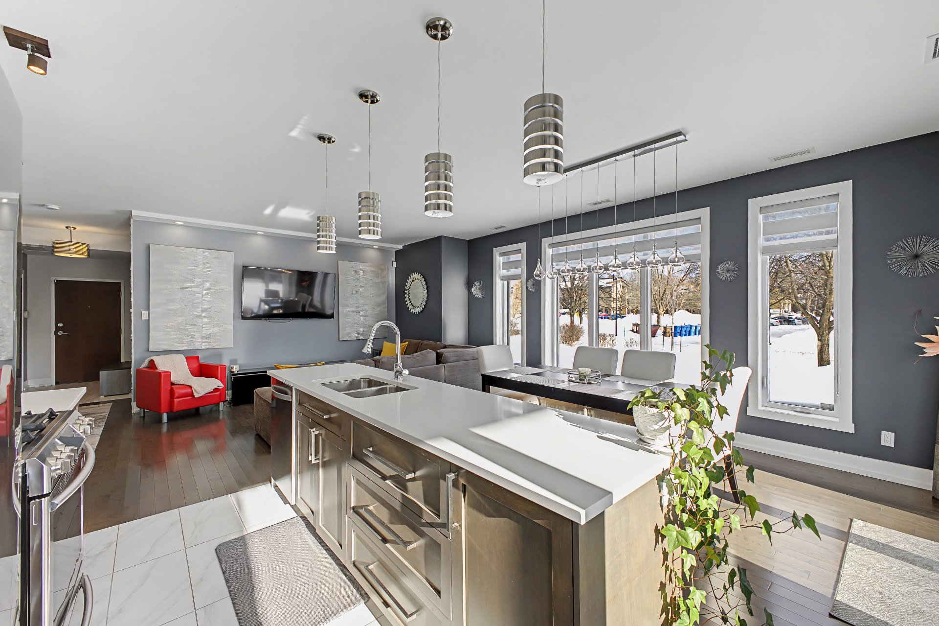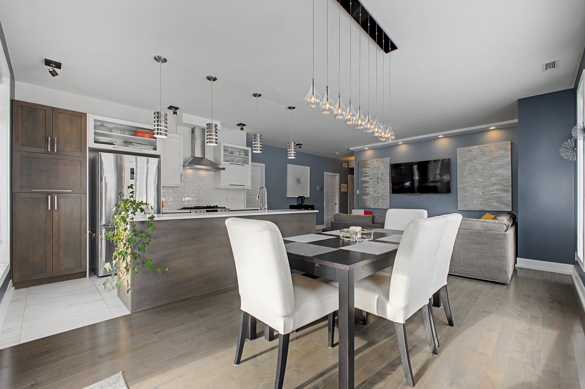 Tous les électroménagers, incluant le lave-vaisselle, la laveuse et la sécheuse, ainsi que les stores, rideaux, fixtures d'éclairage et la hotte de poêle, table de cuisine et le sofa du salon.
