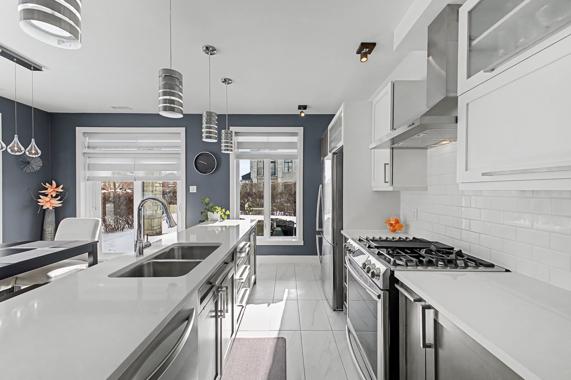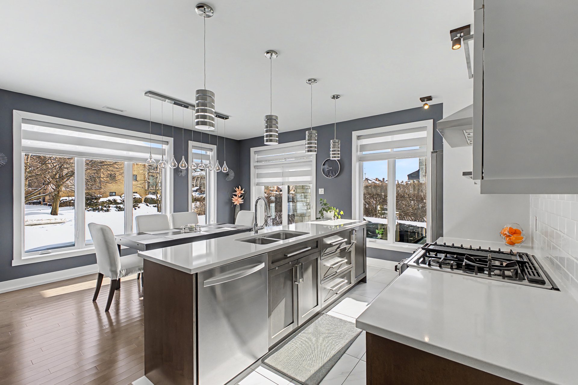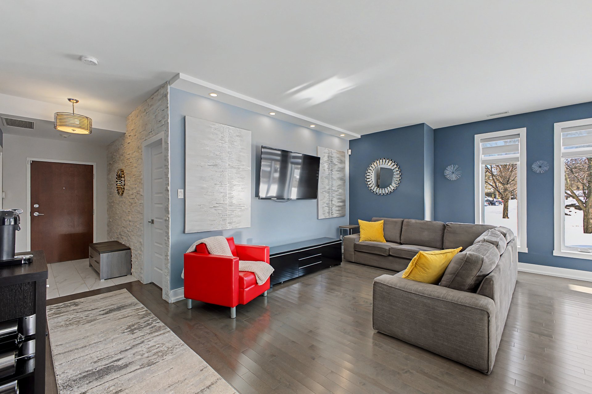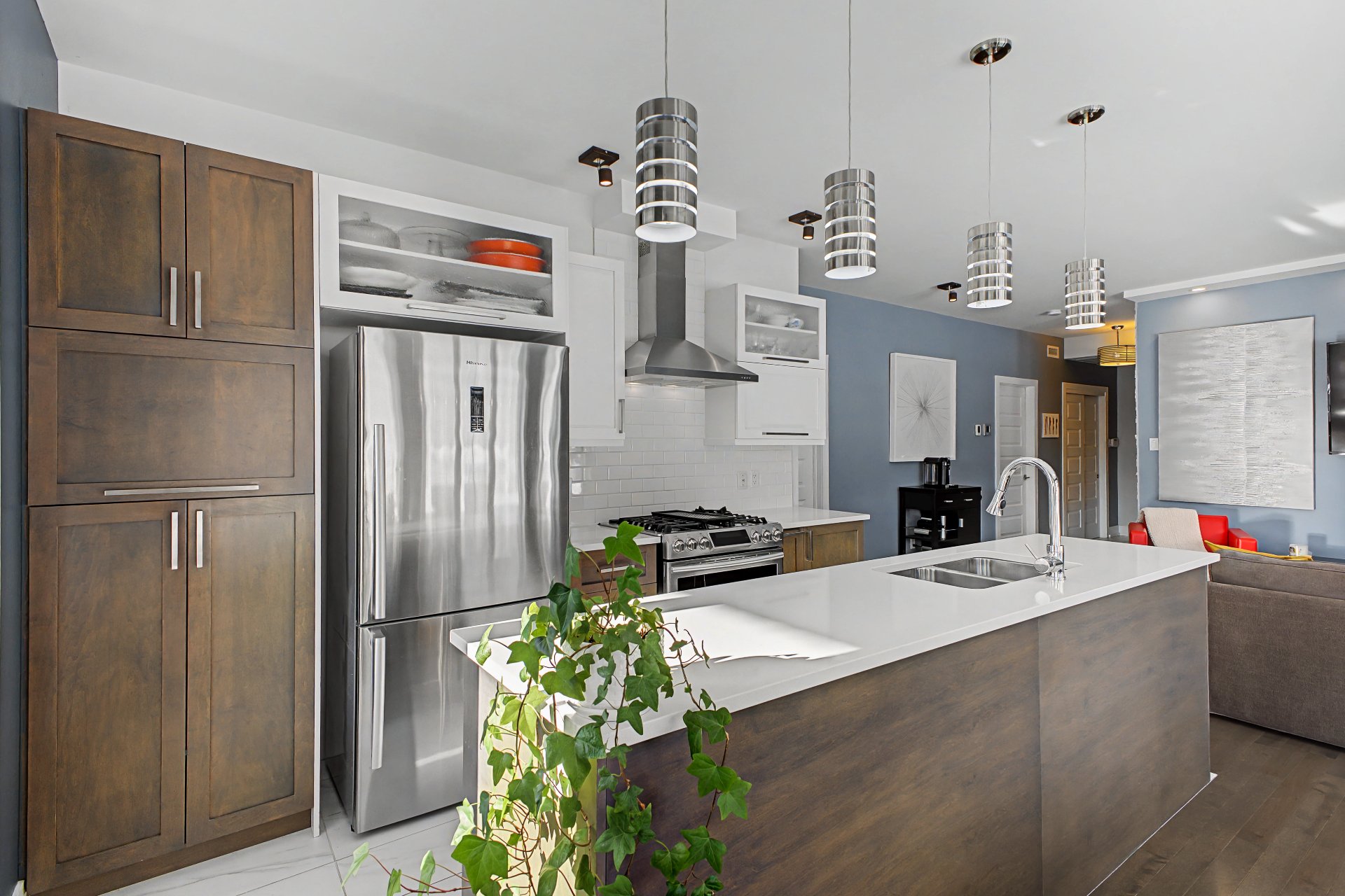 Tous les électroménagers, incluant le lave-vaisselle, la laveuse et la sécheuse, ainsi que les stores, rideaux, fixtures d'éclairage et la hotte de poêle, table de cuisine et le sofa du salon.