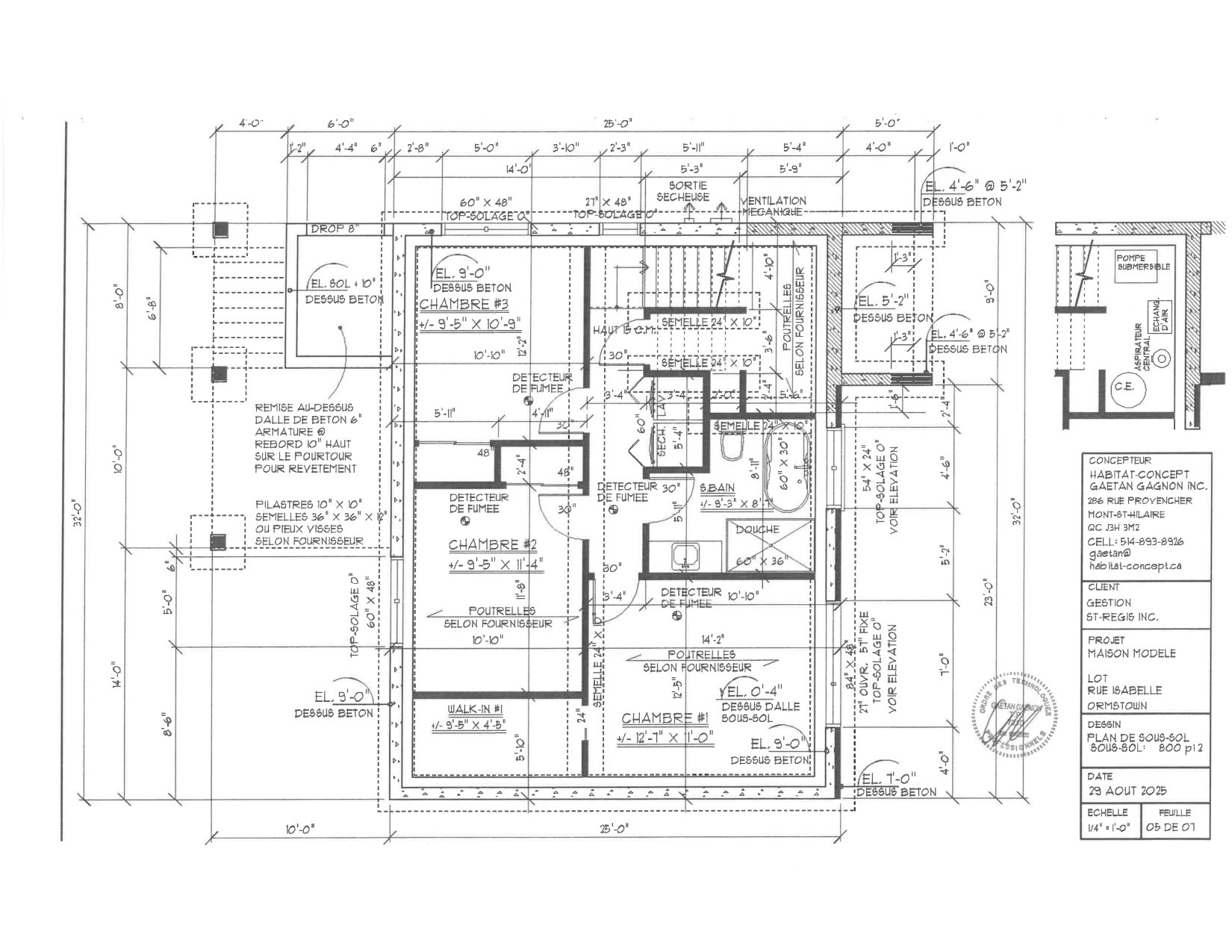 | Penderie (Walk-in) | Sous-sol | 9.5x4.5 P | Linoléum | |