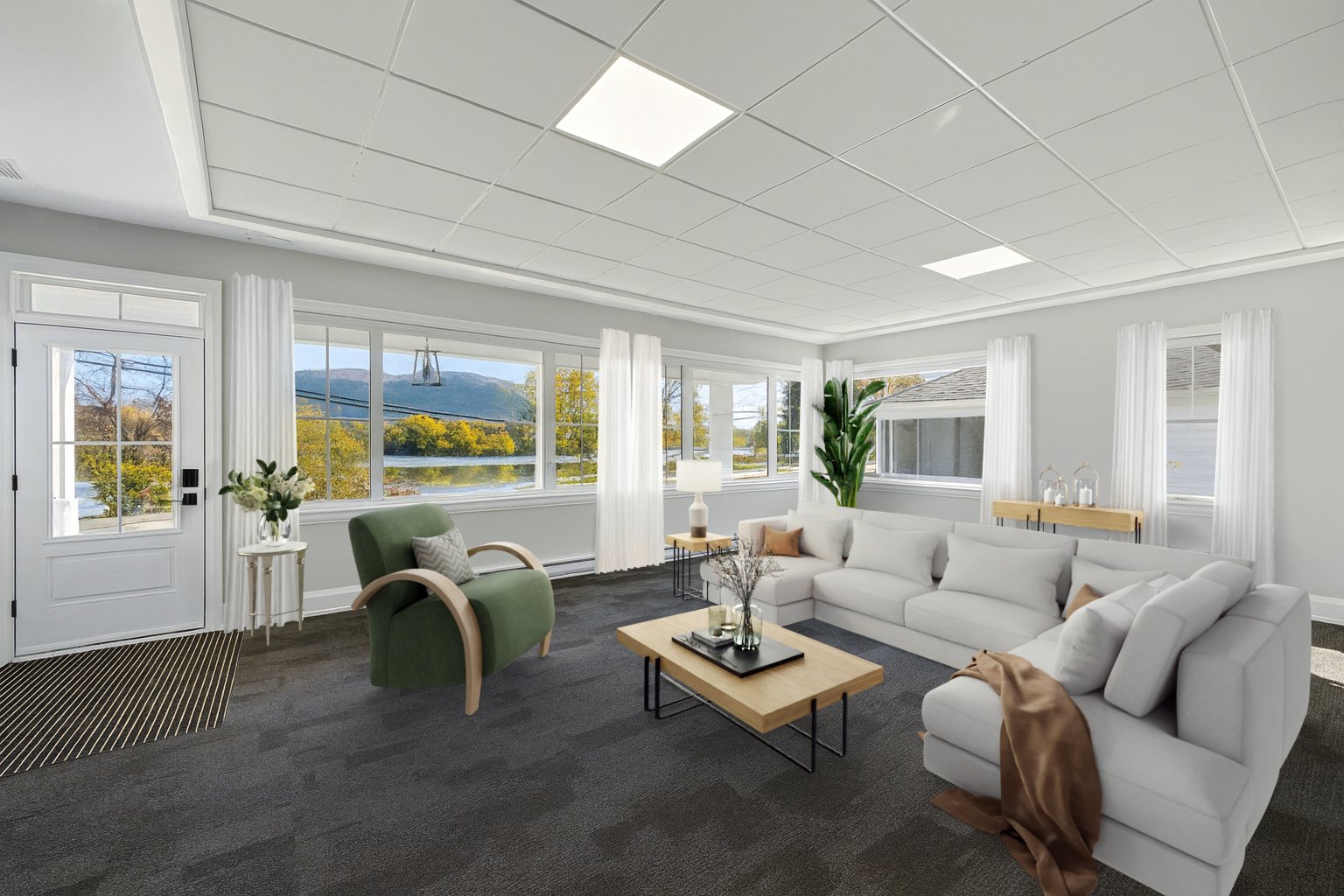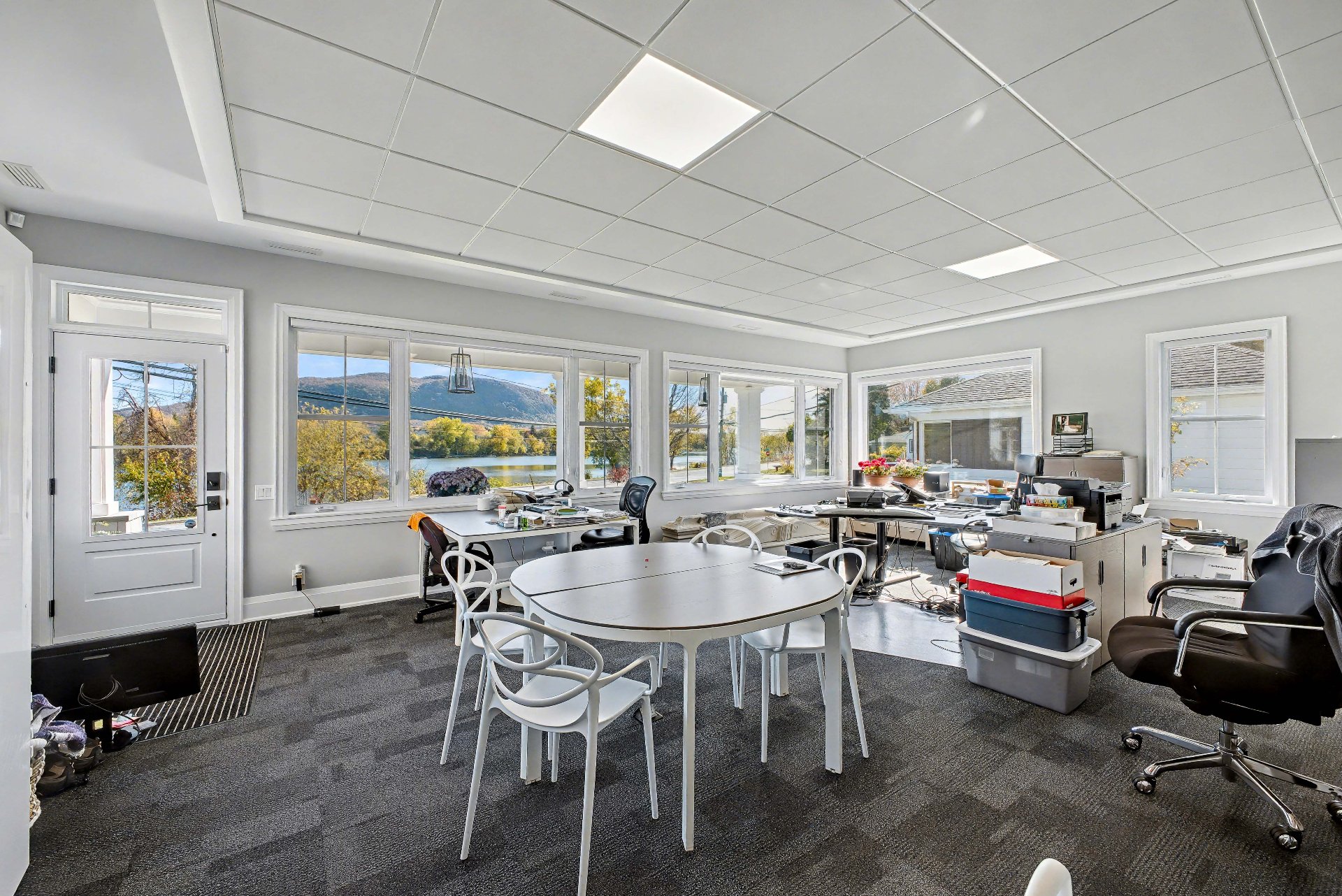 Le rez-de-chaussée, baigné de lumière grâce à sa fenestration abondante, propose une aire de vie ouverte regroupant salon, salle à manger et cuisine avec planchers de céramique chauffants et finitions haut de gamme. Deux espaces bureau dont un mesurant 27p X 19p avec une magnifique vue sur la rivière et la montagne s'y intègrent parfaitement, idéals pour le télétravail. Deux élégantes salle d'eau complète le niveau.