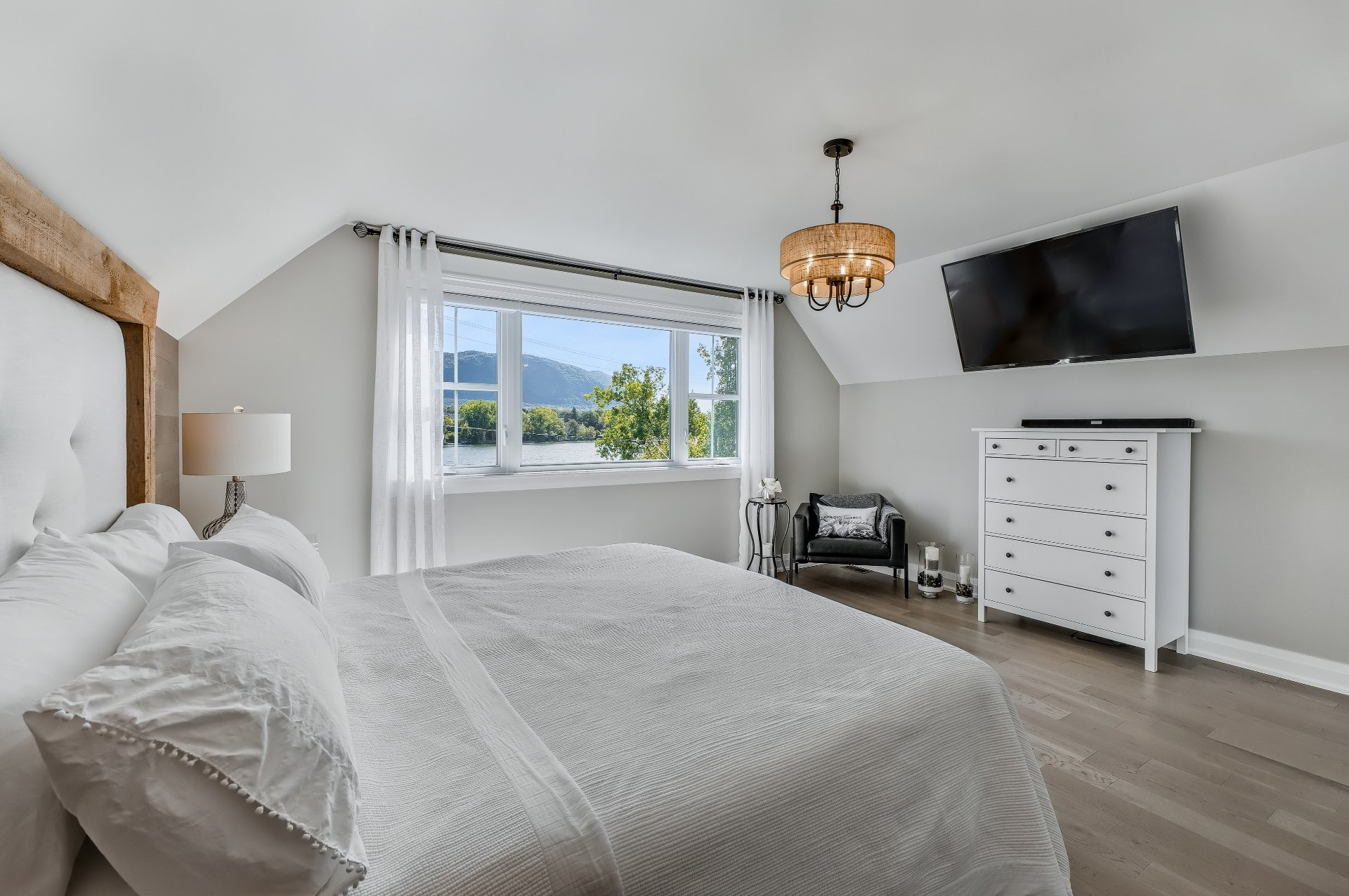 À l'étage, deux chambres aux proportions généreuses se distinguent, dont une somptueuse chambre principale avec vue panoramique sur la rivière et la montagne. Un second salon, lumineux et convivial, vient compléter cet étage, offrant un espace de détente ou de lecture. Une salle de bain complète au design raffiné y ajoute une touche de confort absolu.