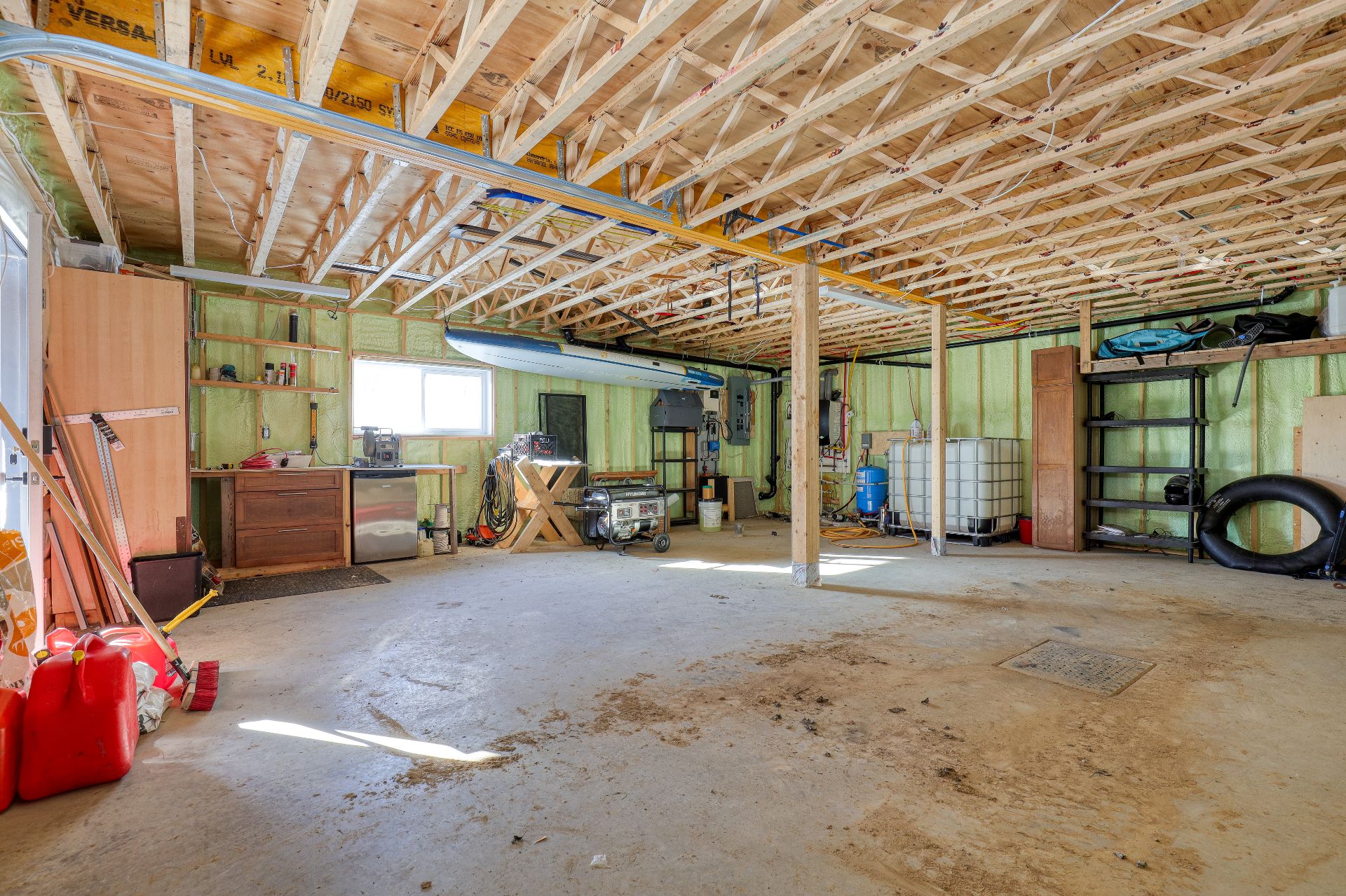 Cuisinière, réfrigérateur, poêle à bois, rack en métal de l'entrée, rack à bois de chauffage, restant du bois de chauffage.