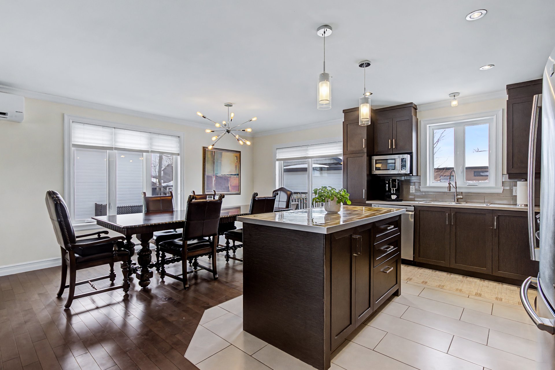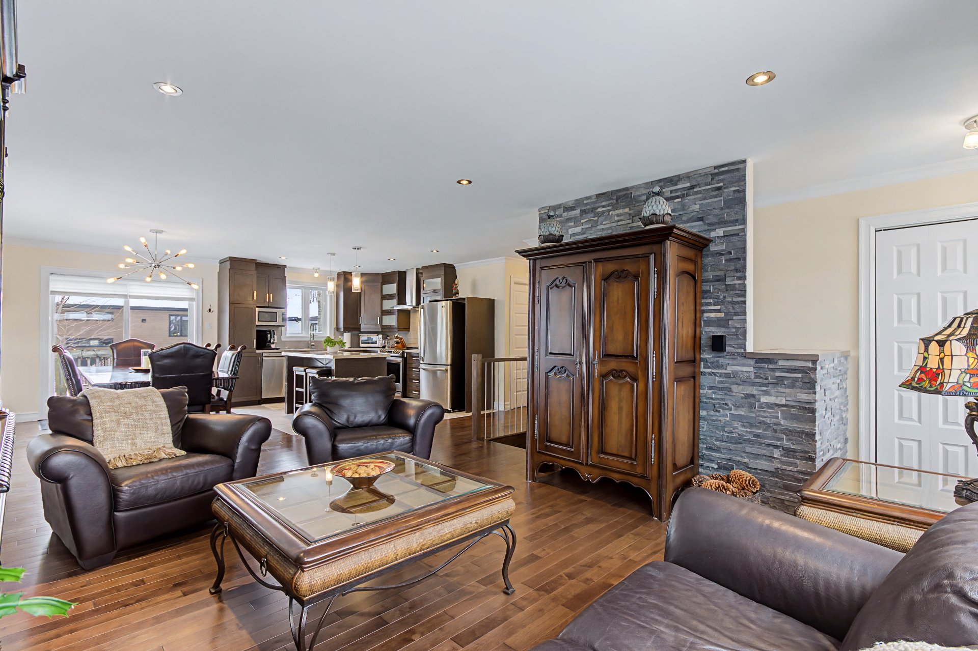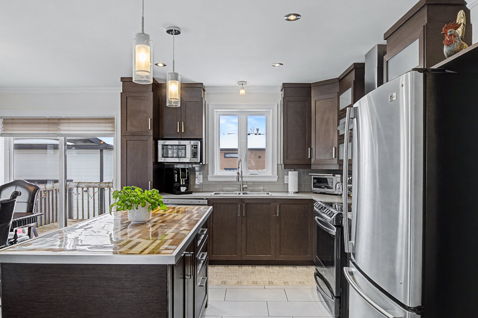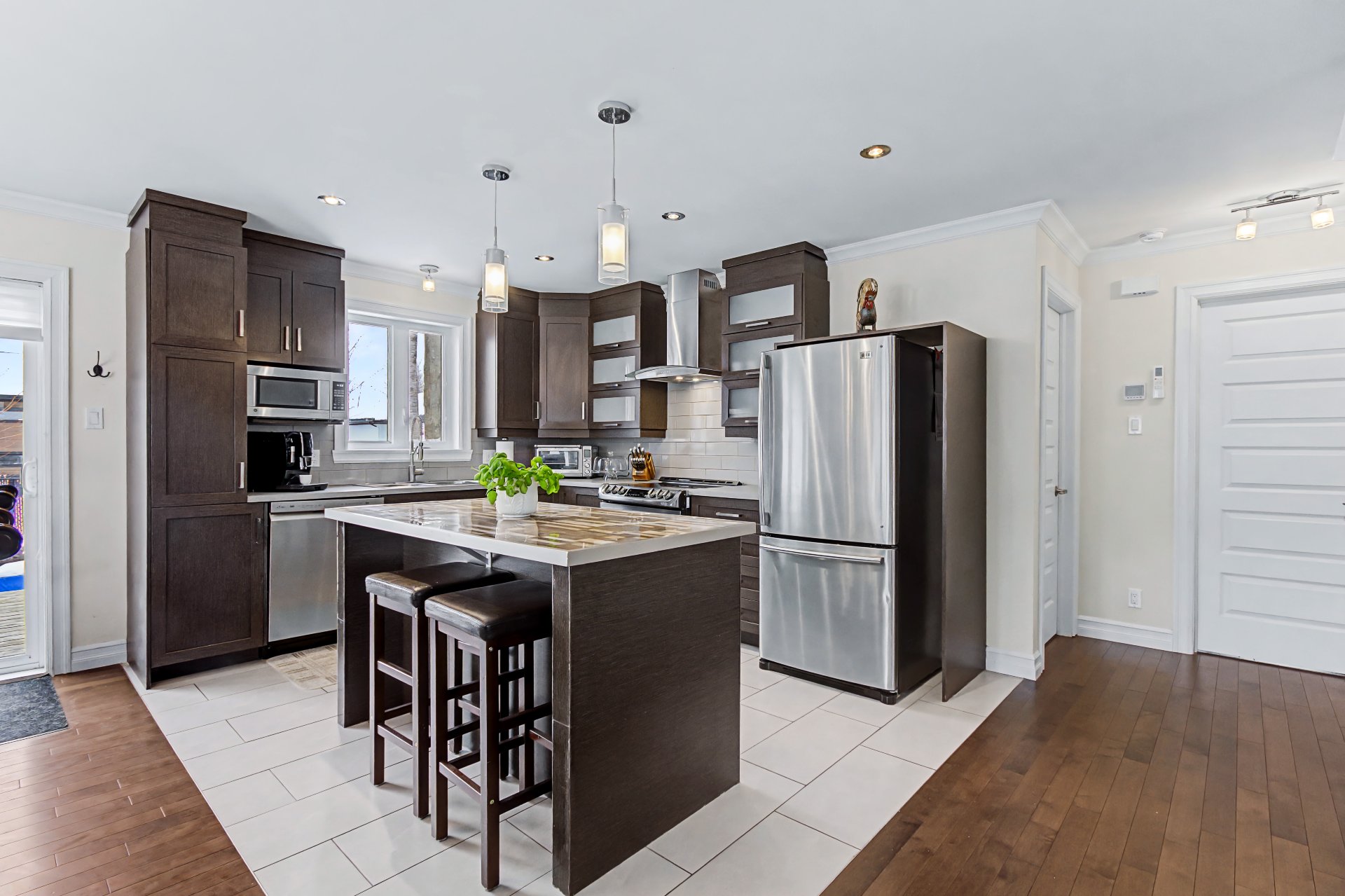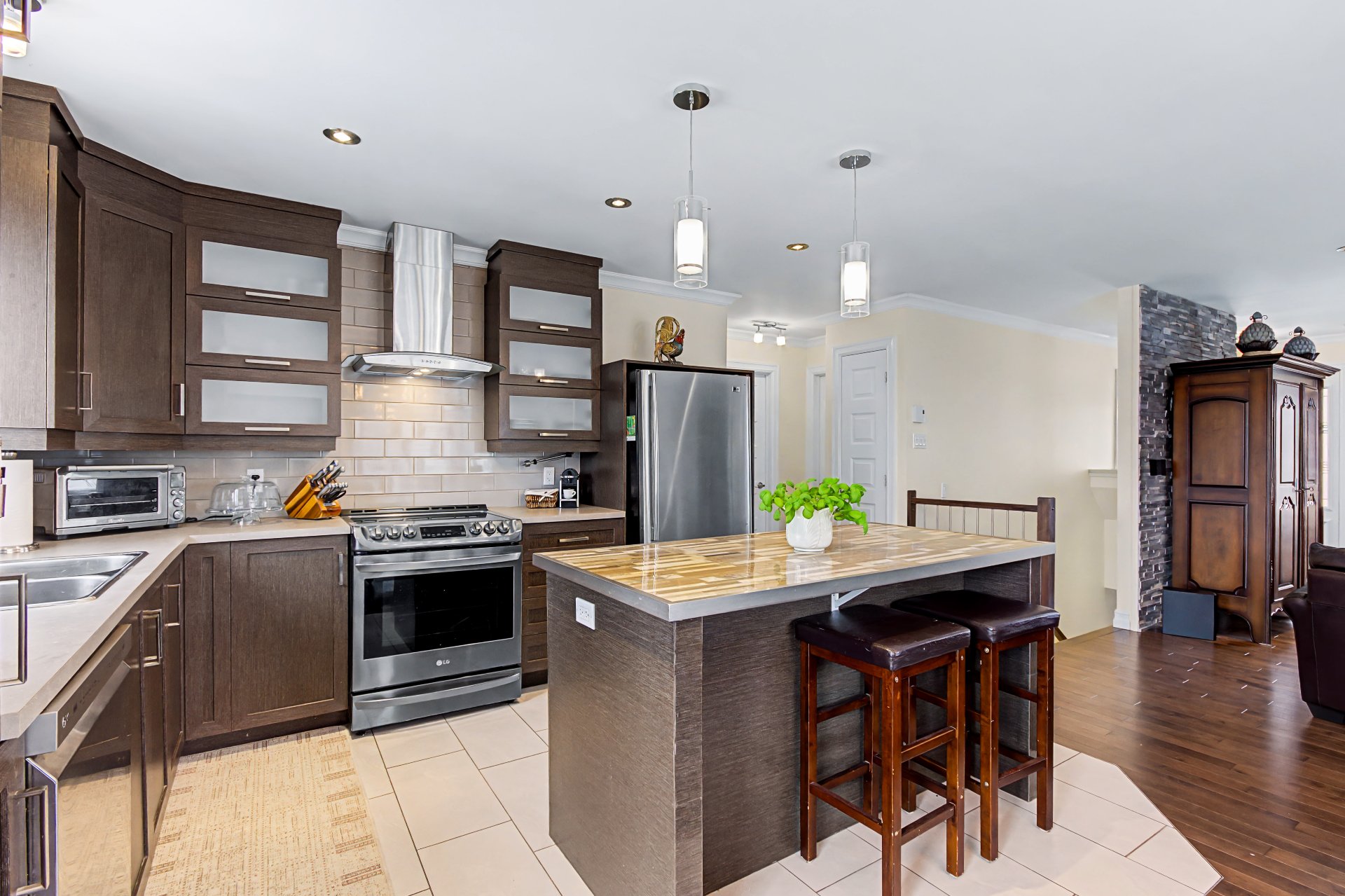 Électro ménagers (cuisinière, réfrigérateur, lave-vaisselle, laveuse, sécheuse, micro-onde), borne électrique, banc de l'îlot.
