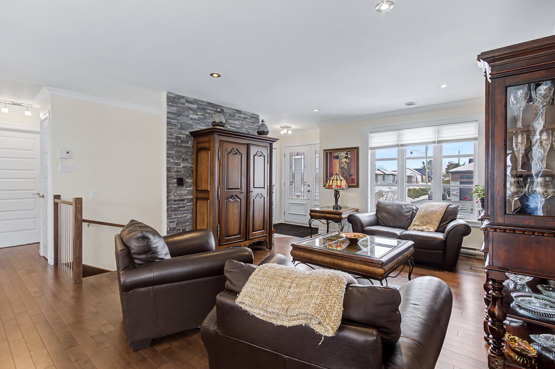 Pôles, rideaux, stores, toiles, thermopompe murale, aspirateur centrale et accessoires, filage pour borne électrique, ouvre porte garage électrique, 4 haut-parleurs salon RDC et son filage, échangeur d'air, foyer aux granules.