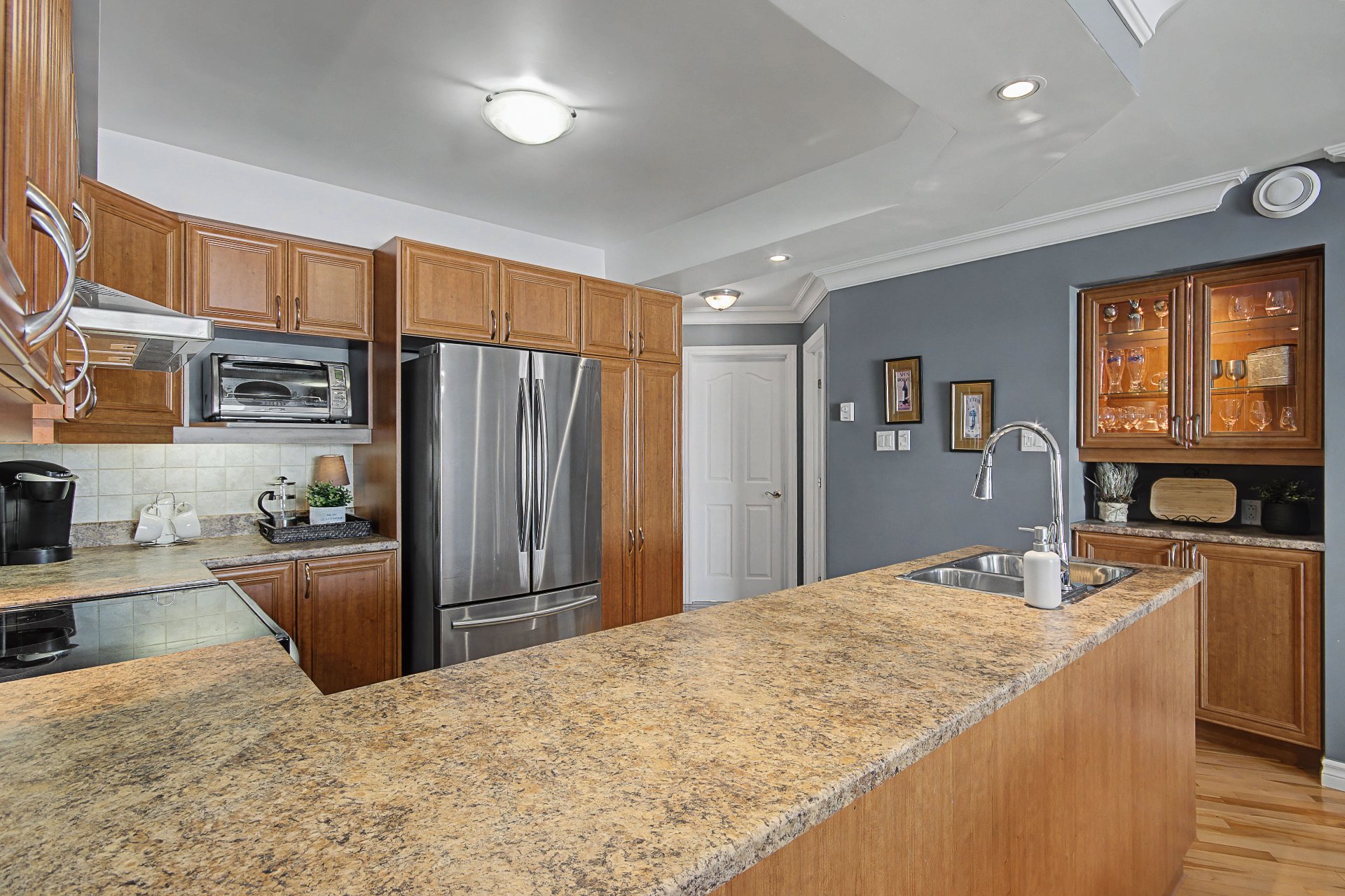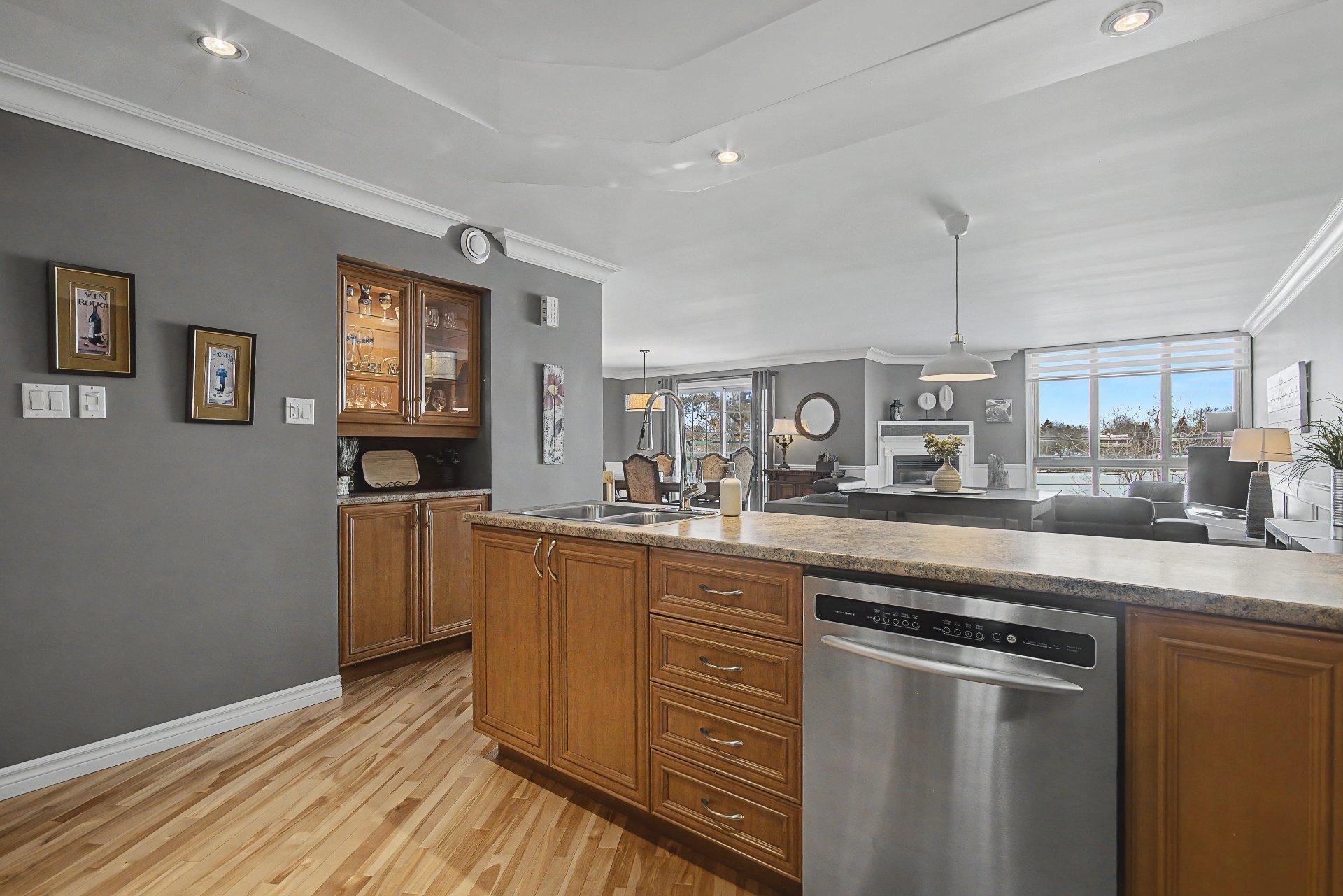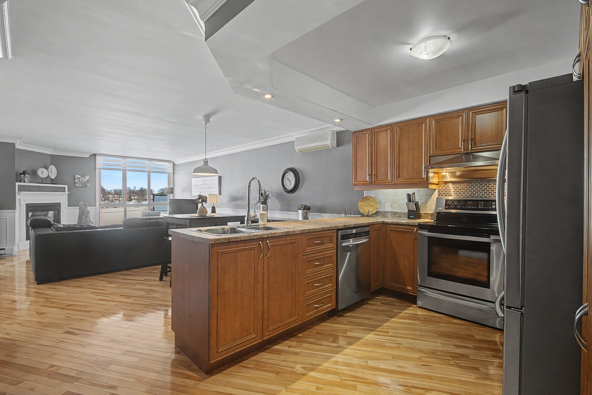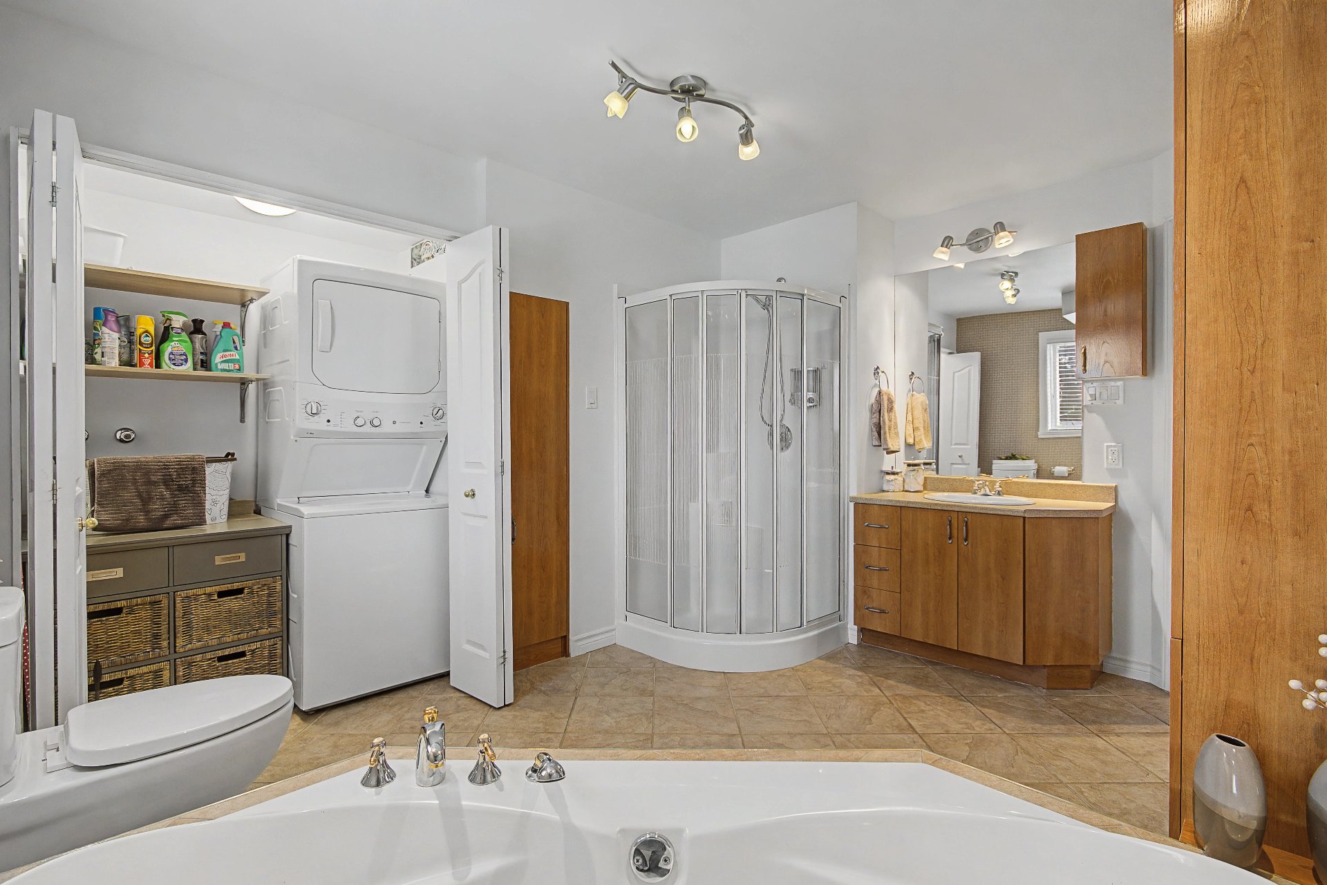 Réfrigérateur, cuisinière, lave-vaisselle, laveuse/sécheuse superposés, stores, fixtures, rideaux, 4 armoires de rangement dans le garage, congélateur au sous-sol, ouvre-porte garage électrique, balayeuse centrale et accessoires, bac de recyclage + bac à ordures et bac à composte.