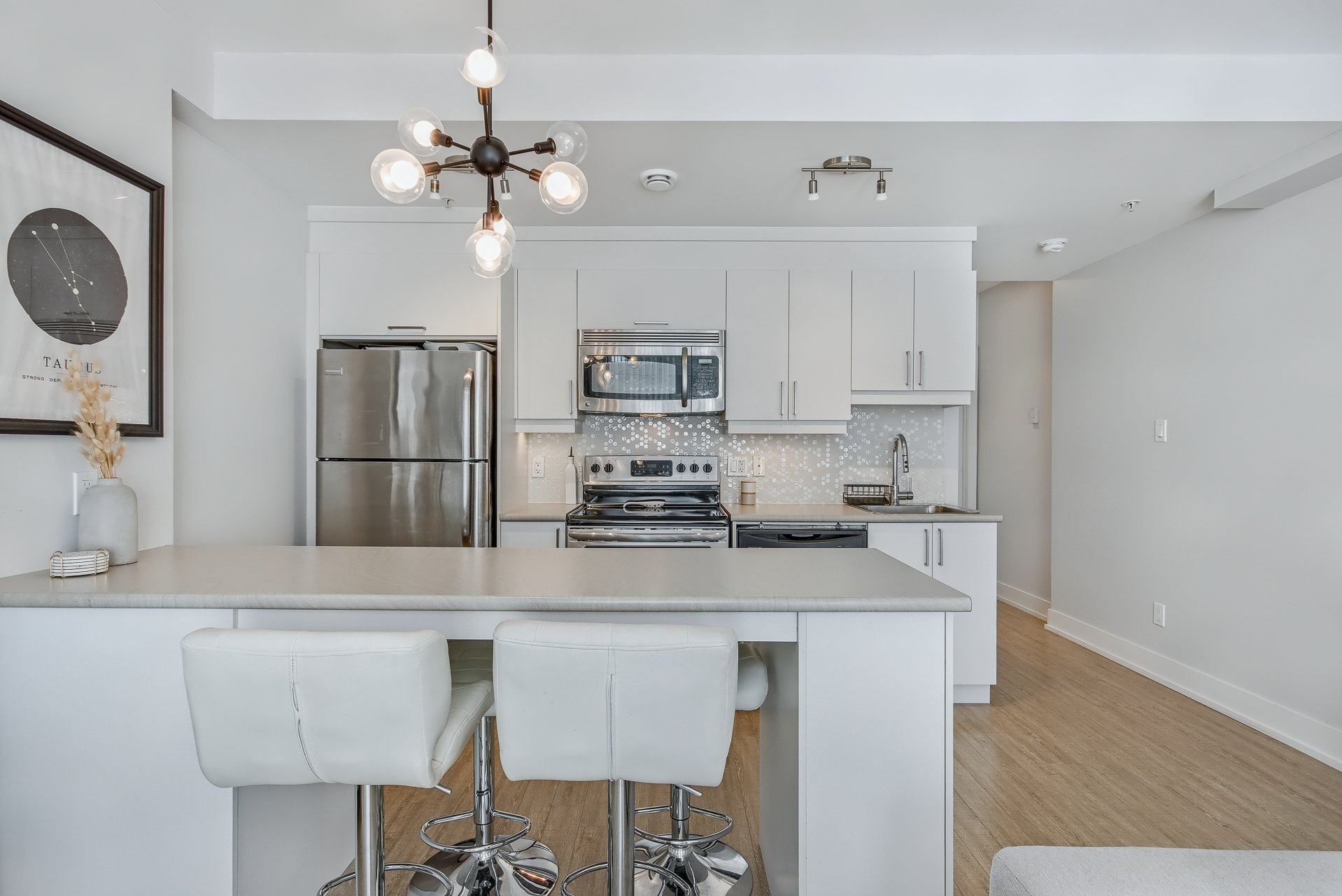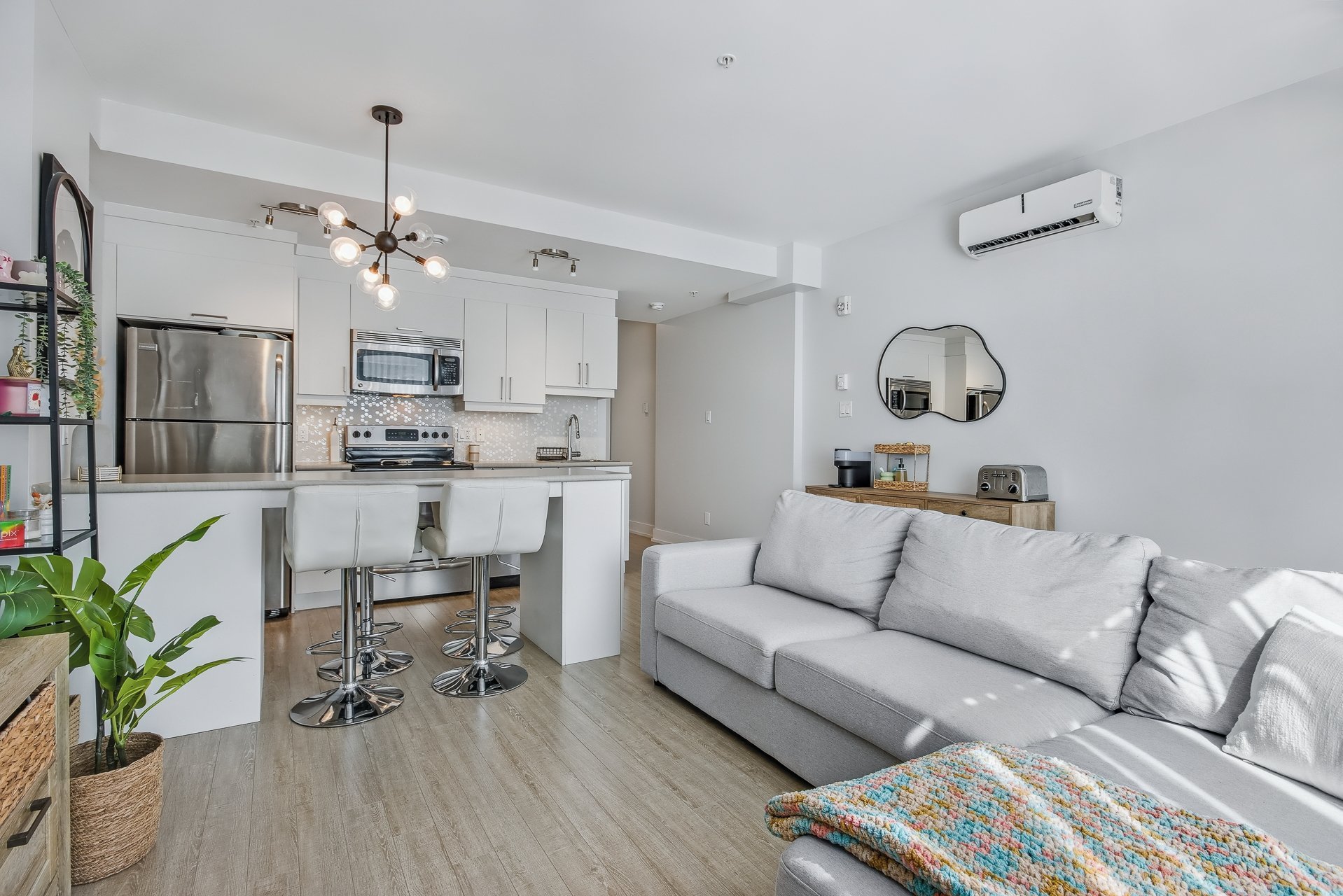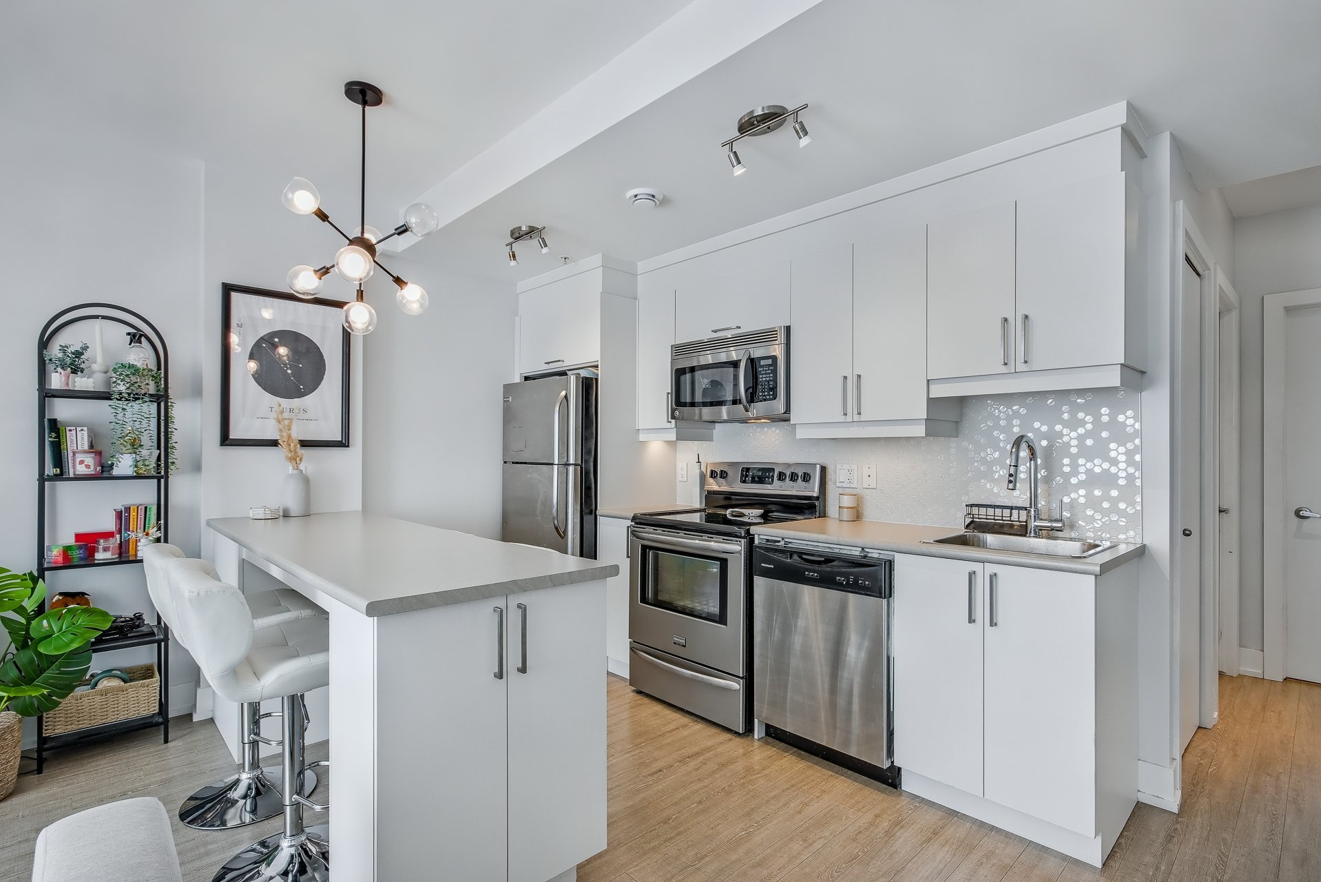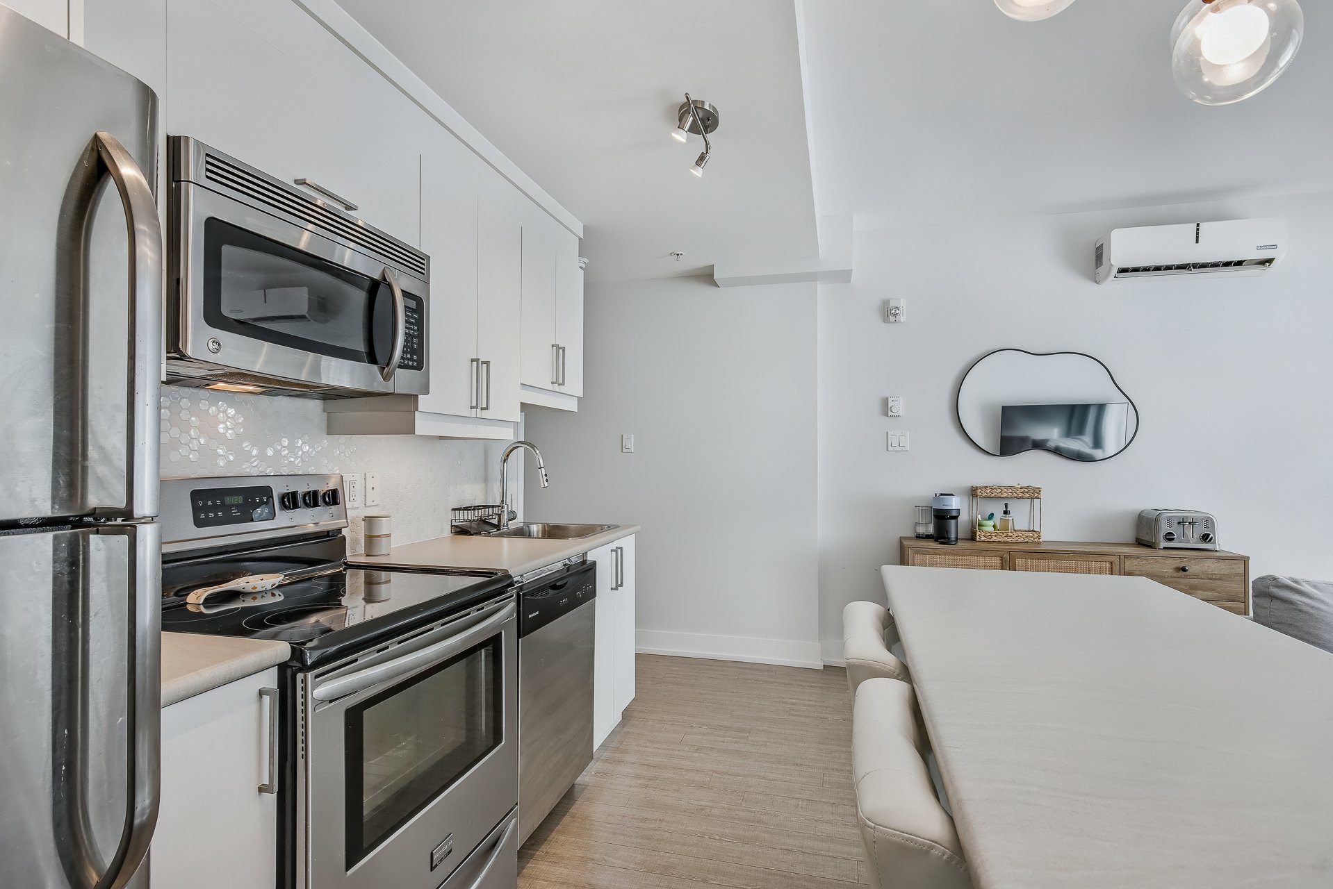 Luminaires, pôles, rideaux (sauf ceux de la chambre), lave-vaisselle, cuisinière, réfrigérateur, laveuse/sécheuse intégrée tout en un, micro-ondes à hotte intégrée, climatiseur mural et sa manette, échangeur d'air, porte serviettes salle de bain, rangement sur mesure du garde-robe de la chambre, miroir de la salle de bain.