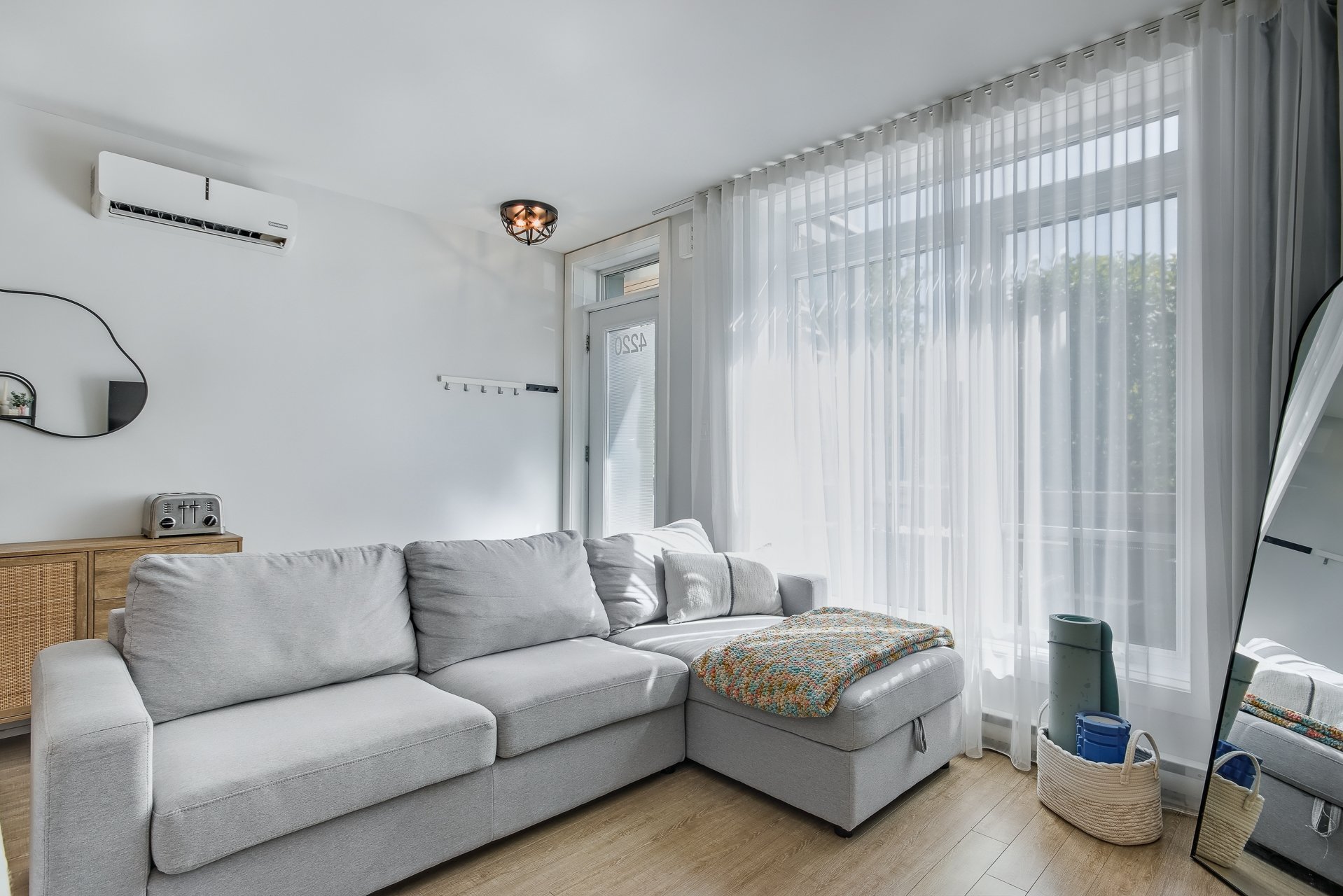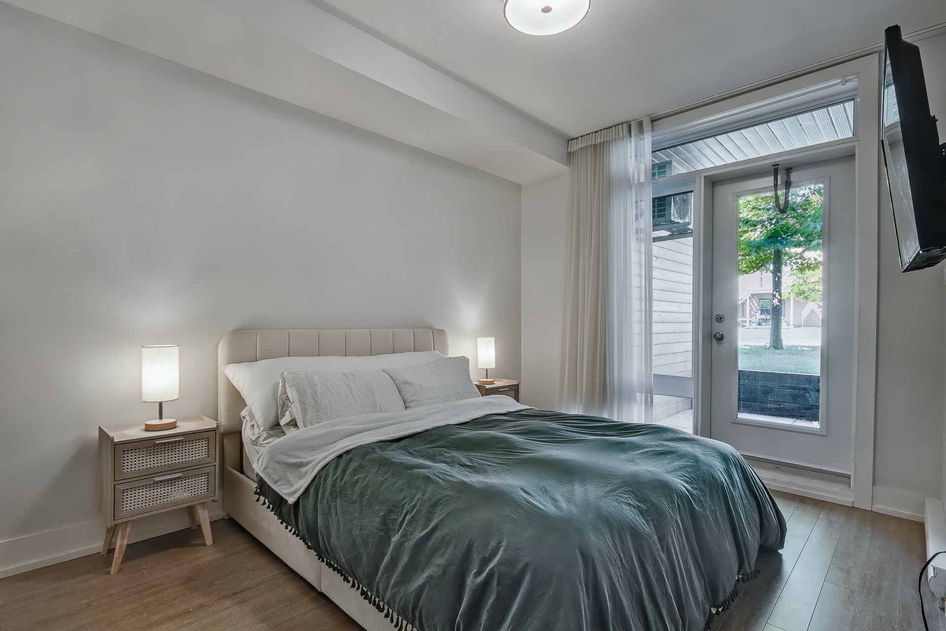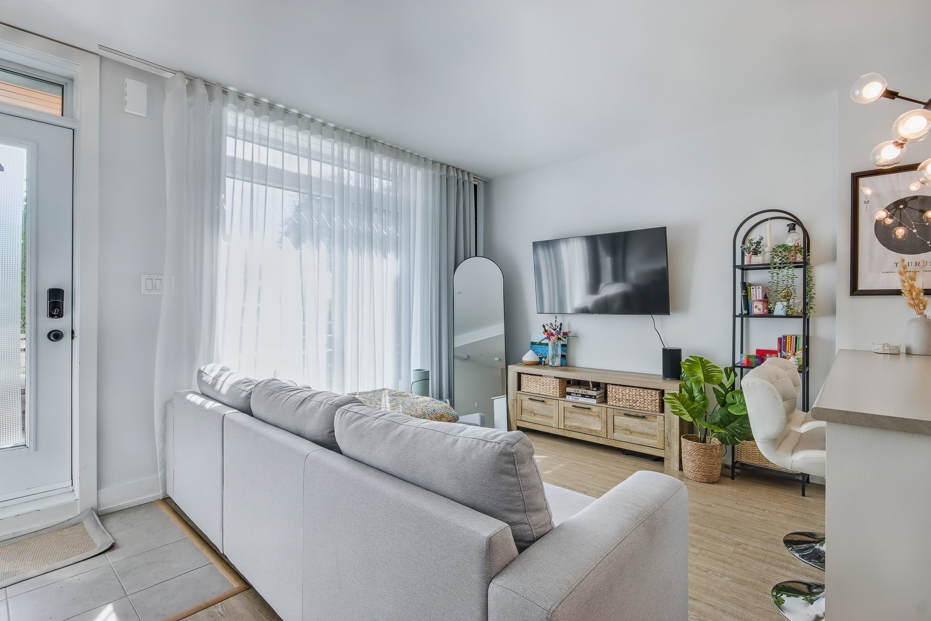Luminaires, pôles, rideaux (sauf ceux de la chambre), lave-vaisselle, cuisinière, réfrigérateur, laveuse/sécheuse intégrée tout en un, micro-ondes à hotte intégrée, climatiseur mural et sa manette, échangeur d'air, porte serviettes salle de bain, rangement sur mesure du garde-robe de la chambre, miroir de la salle de bain.