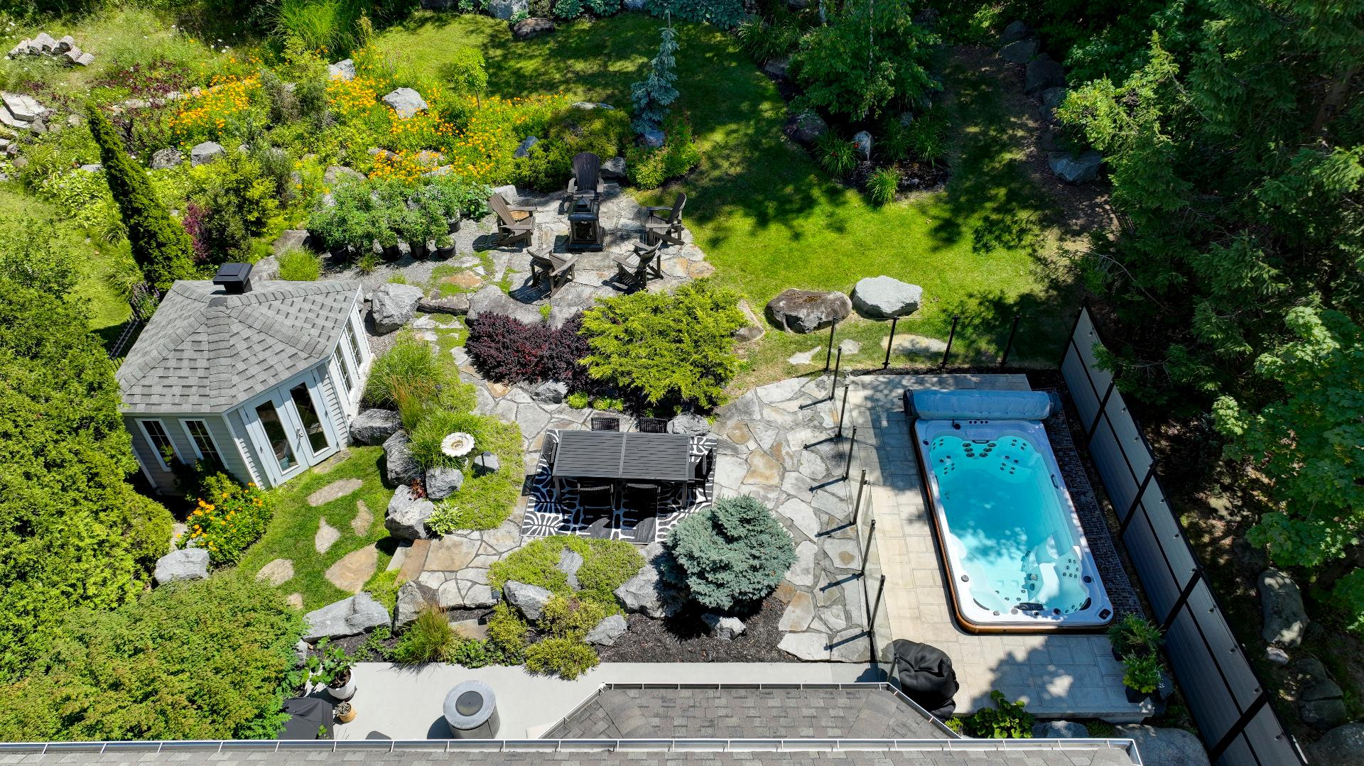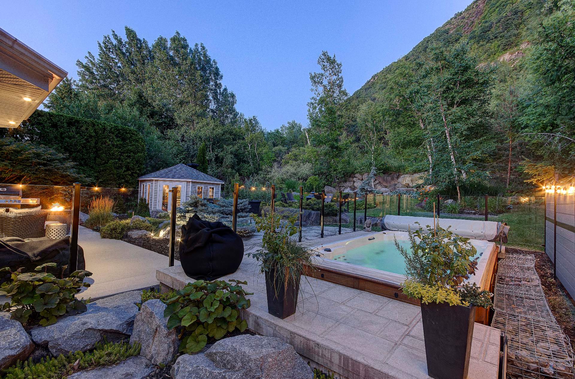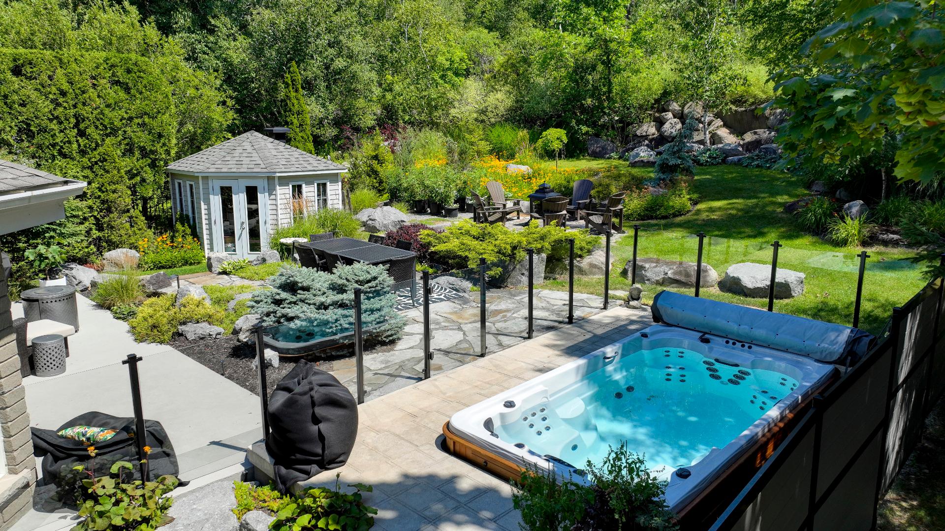 À l'extérieur, la cour aménagée avec spa de nage au sel de marque Arctic Spa, foyer extérieur, coin repas et végétation mature complète parfaitement ce cadre de vie exceptionnel.