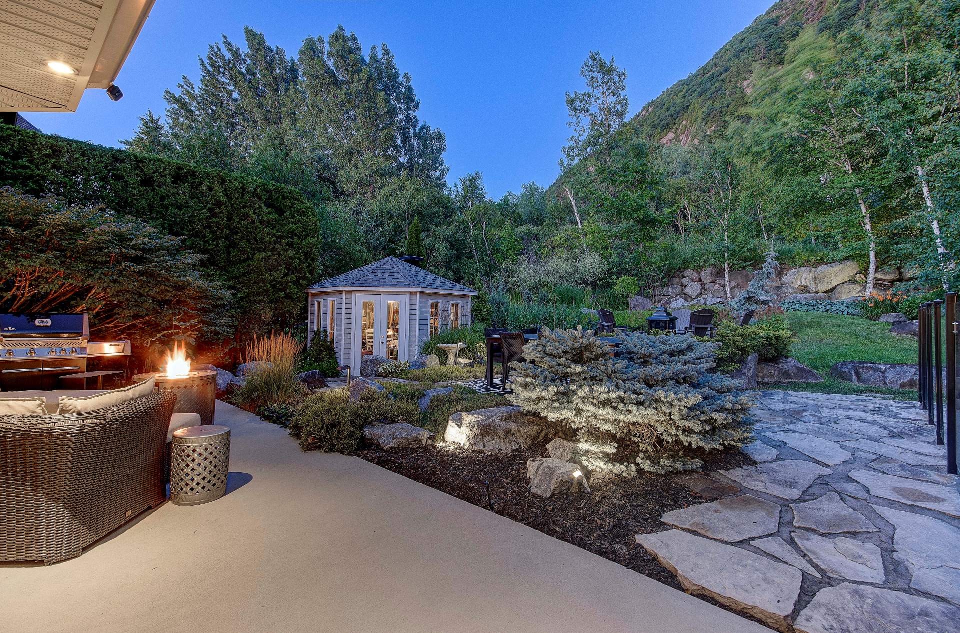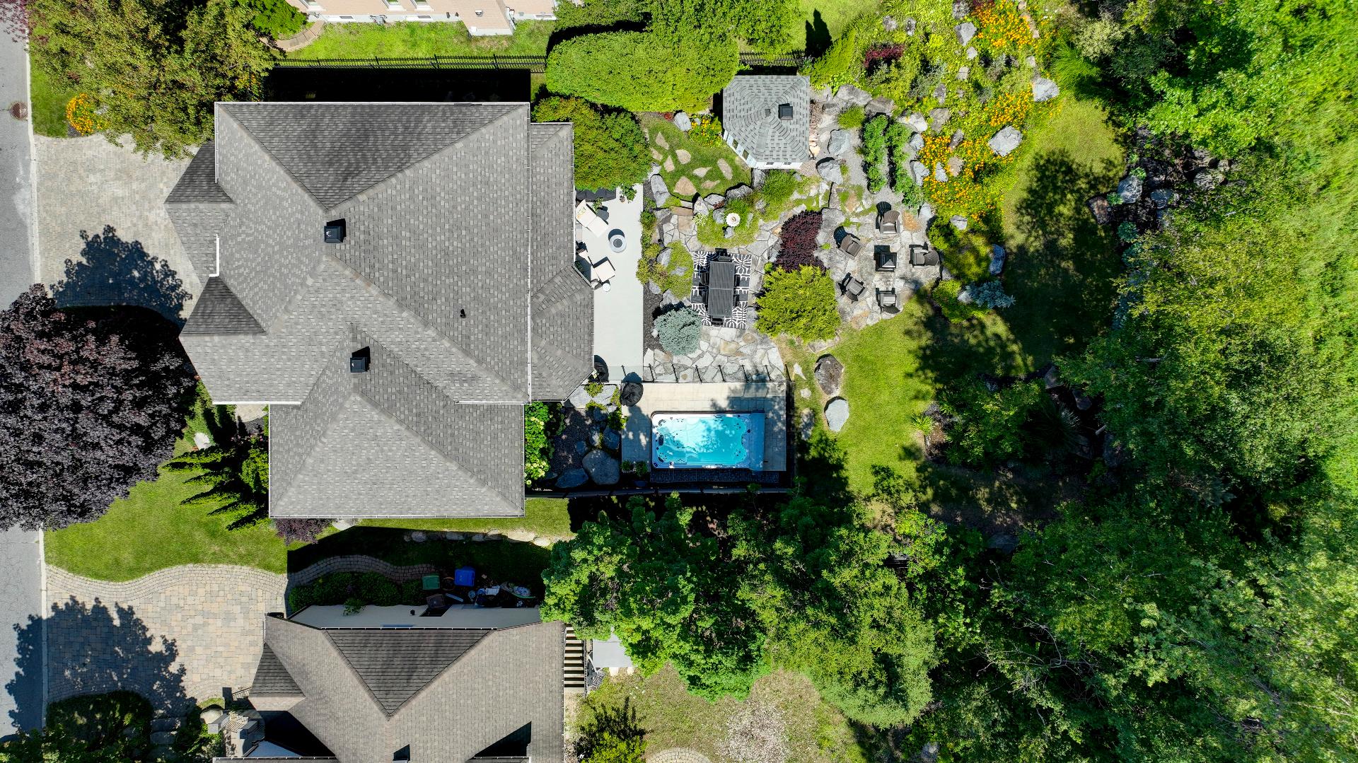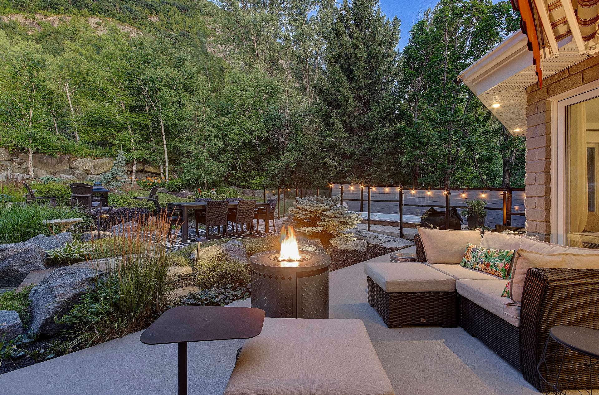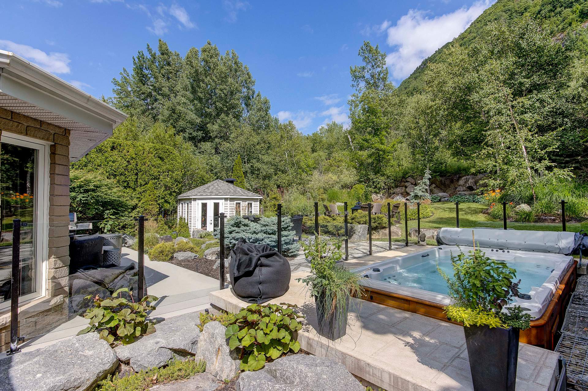 À l'extérieur, la cour aménagée avec spa de nage au sel de marque Arctic Spa, foyer extérieur, coin repas et végétation mature complète parfaitement ce cadre de vie exceptionnel.