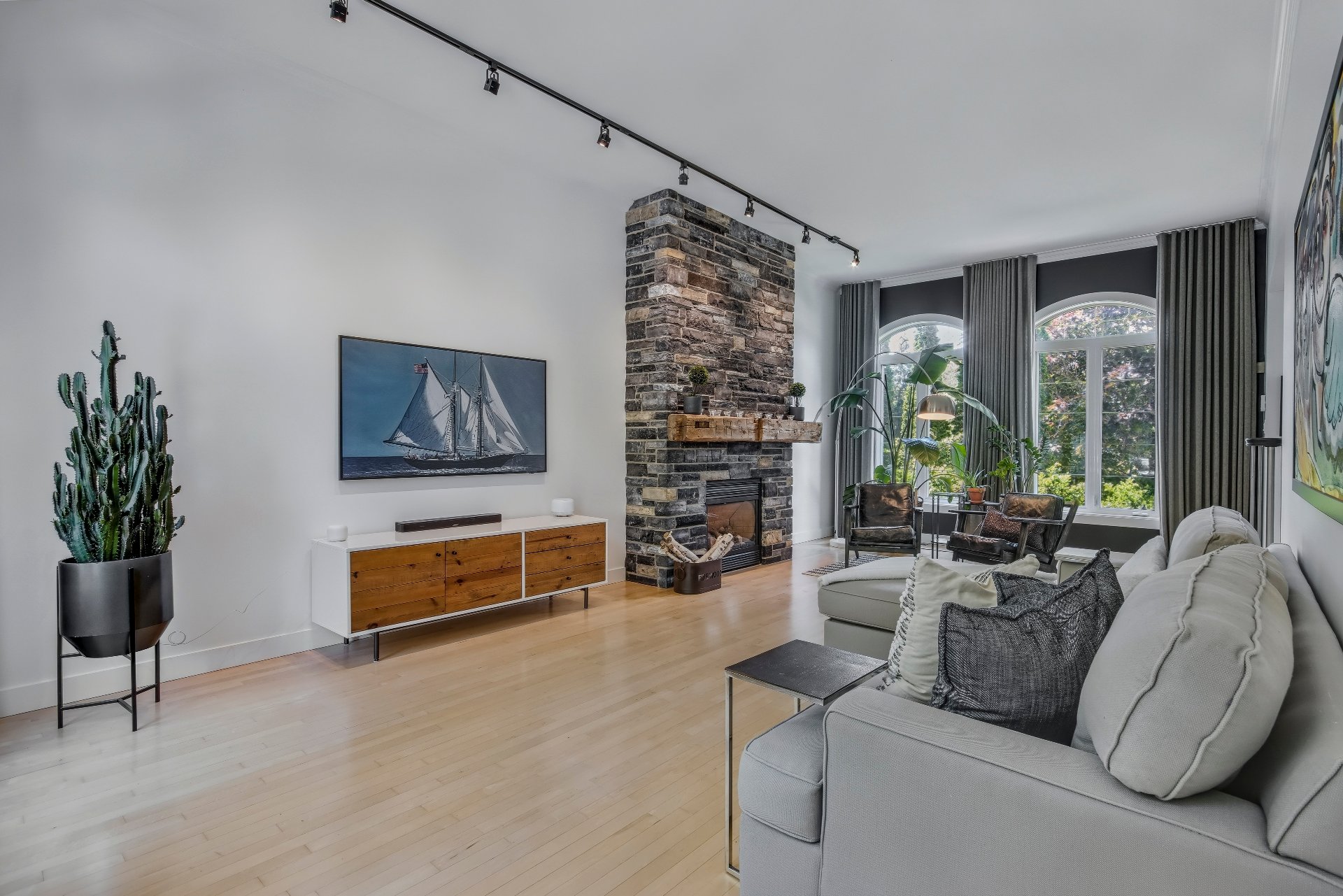 Le rez-de-chaussée propose un espace lumineux aux finitions soignées, avec salon et salle à manger agrémentés chacun de deux foyers au gaz. La cuisine, à la fois conviviale et élégante, s'ouvre sur la cour et dispose d'un vaste îlot central.