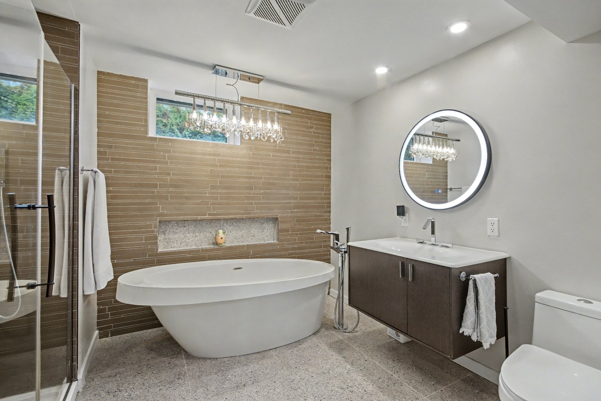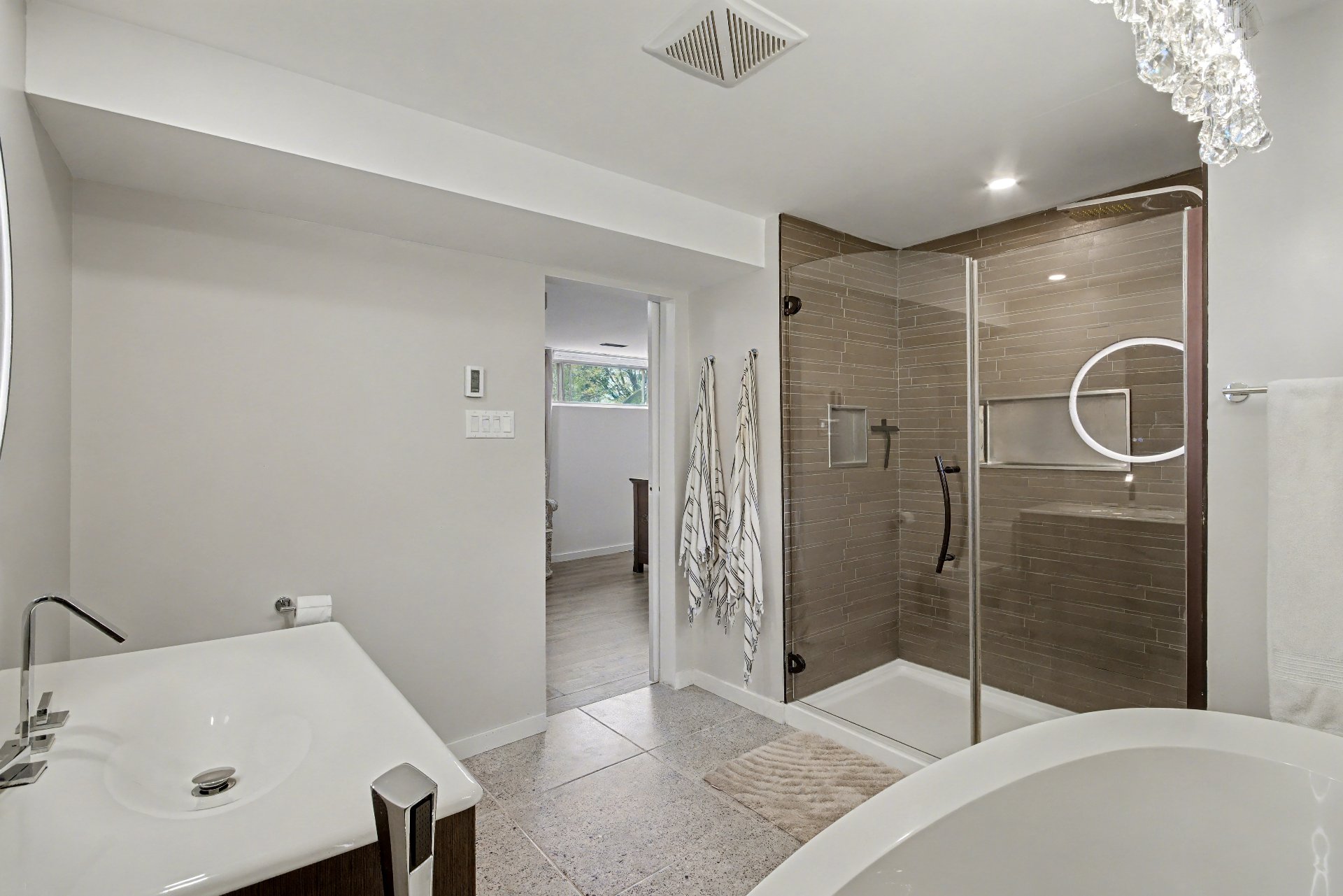-Ajout d'une salle de bain complète au sous-sol (Bain en pierre Vanico Maronix, plancher chauffant, miroir chauffant avec lumière intégrée, douche encastrée de 5 pieds avec panneau de massage, vanité Kohler)