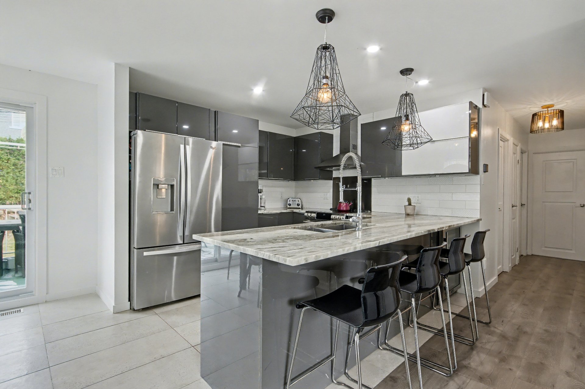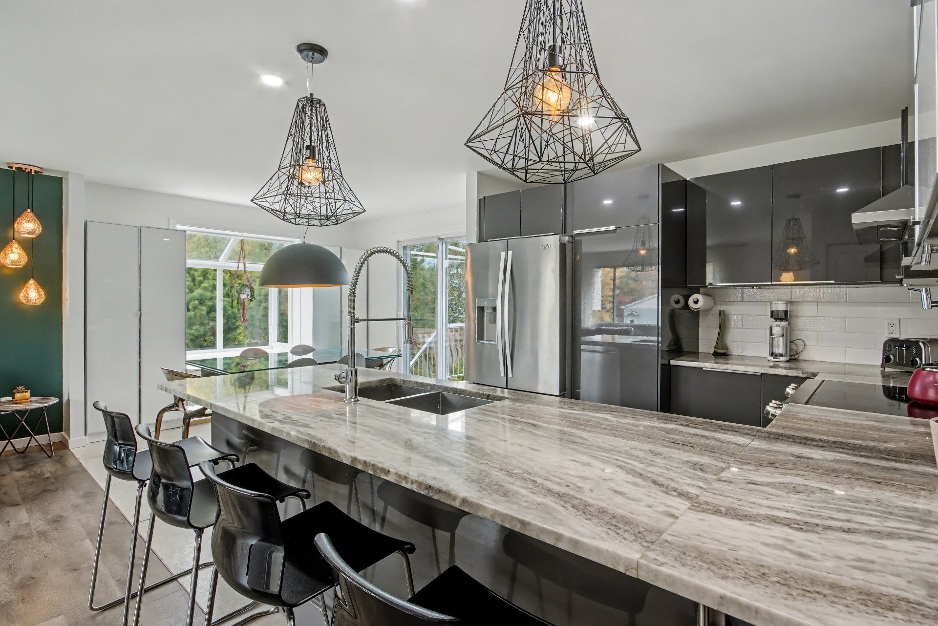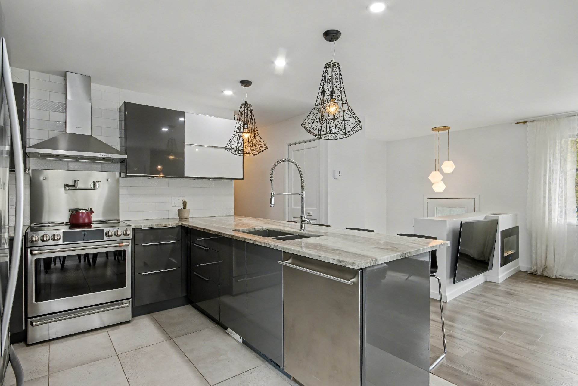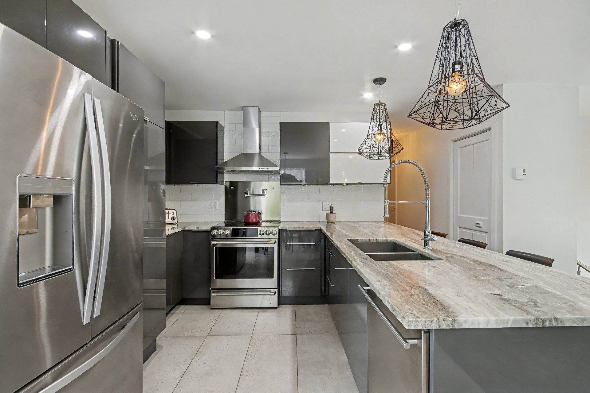 -Cuisine : Céramique, nouveaux cabinets, comptoir de granite de Tanzanie, dosseret, robinet de remplissage de marmite près du four,