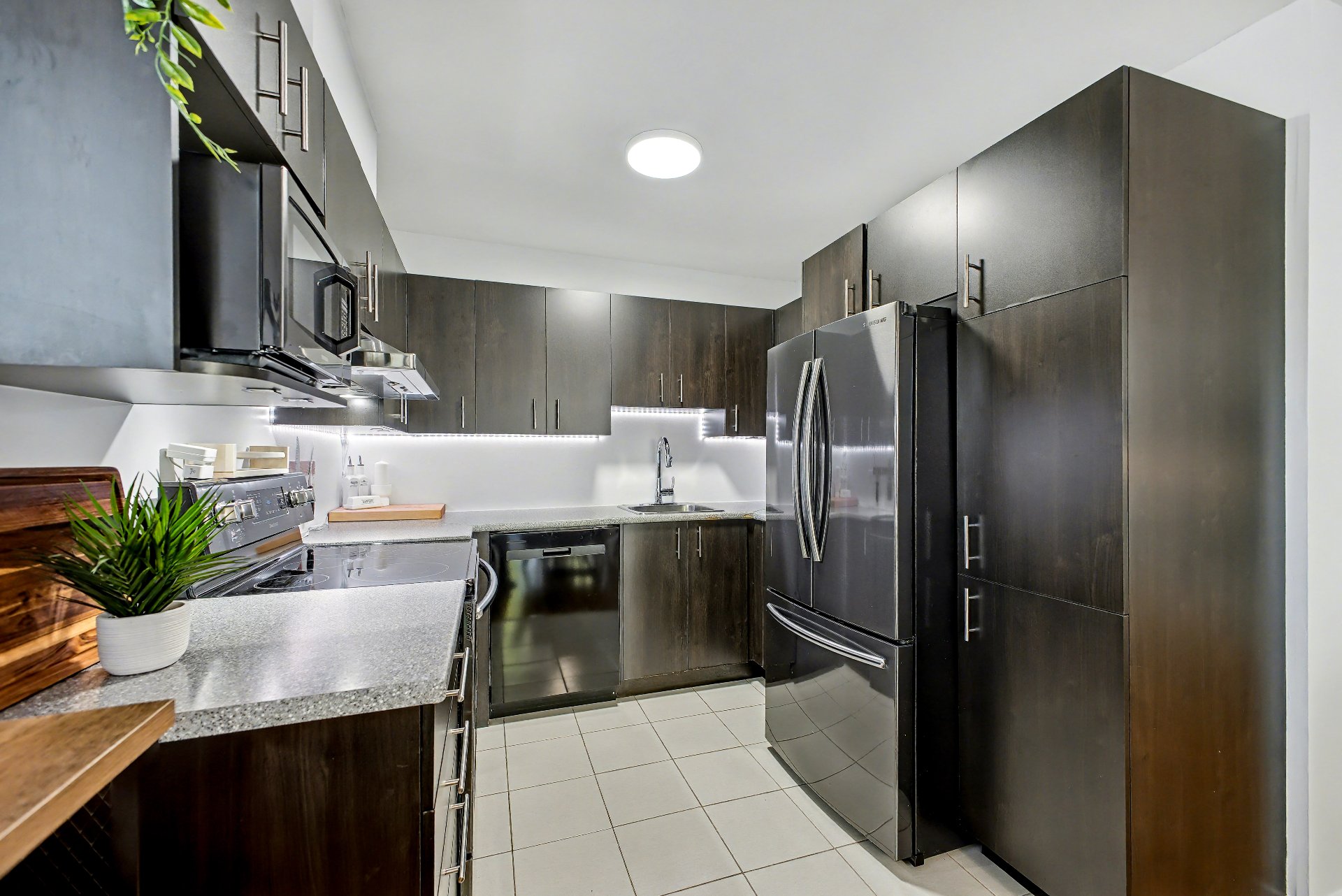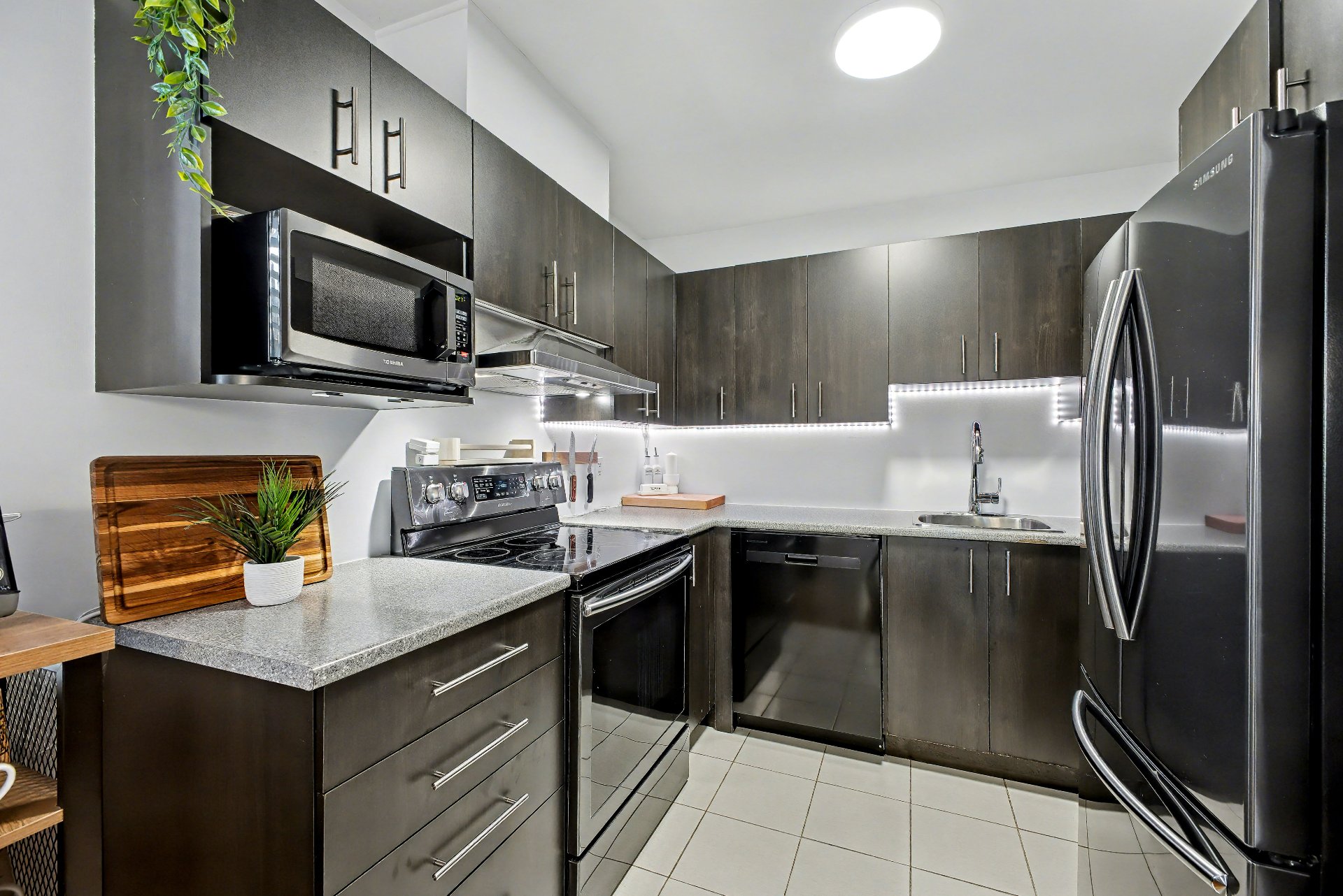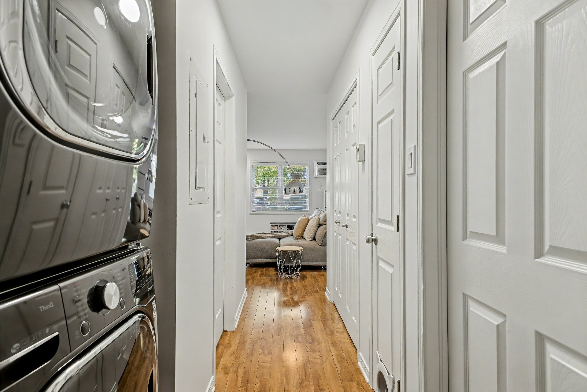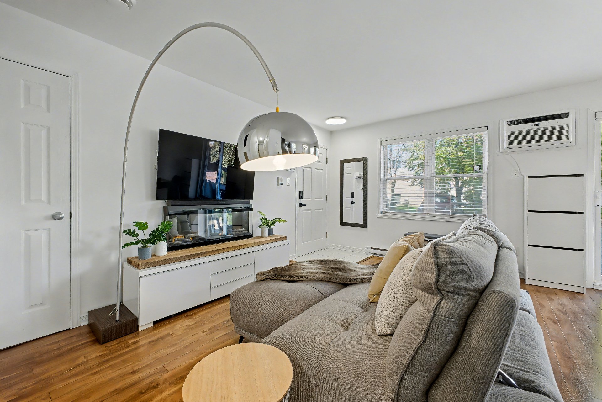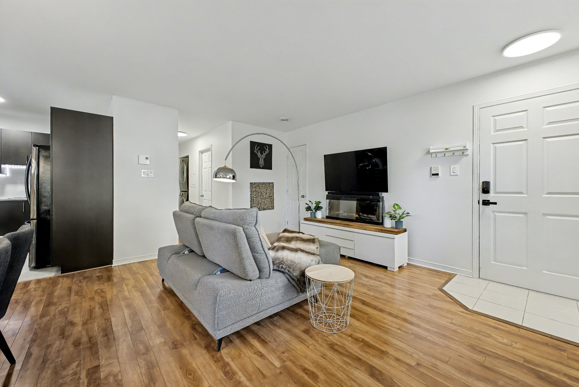 Luminaires, pôles, toiles de fenêtres, miroir de salle de bain, support à télévision, air climatisé mural, crochets à serviette, meuble au-dessus de la toilette, meuble blanc à côté de la vanité de la salle de bain, échangeur d'air, chauffe-eau, tablettes noires dans la douche et le bain, 4 thermostats, support à clés de l'entrée, serrure de porte électronique, 8 lumières à détecteur de mouvement à batterie.