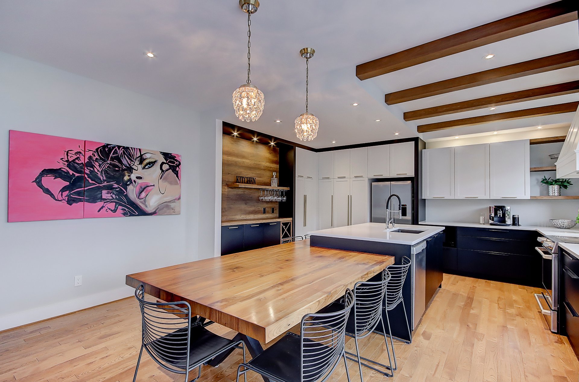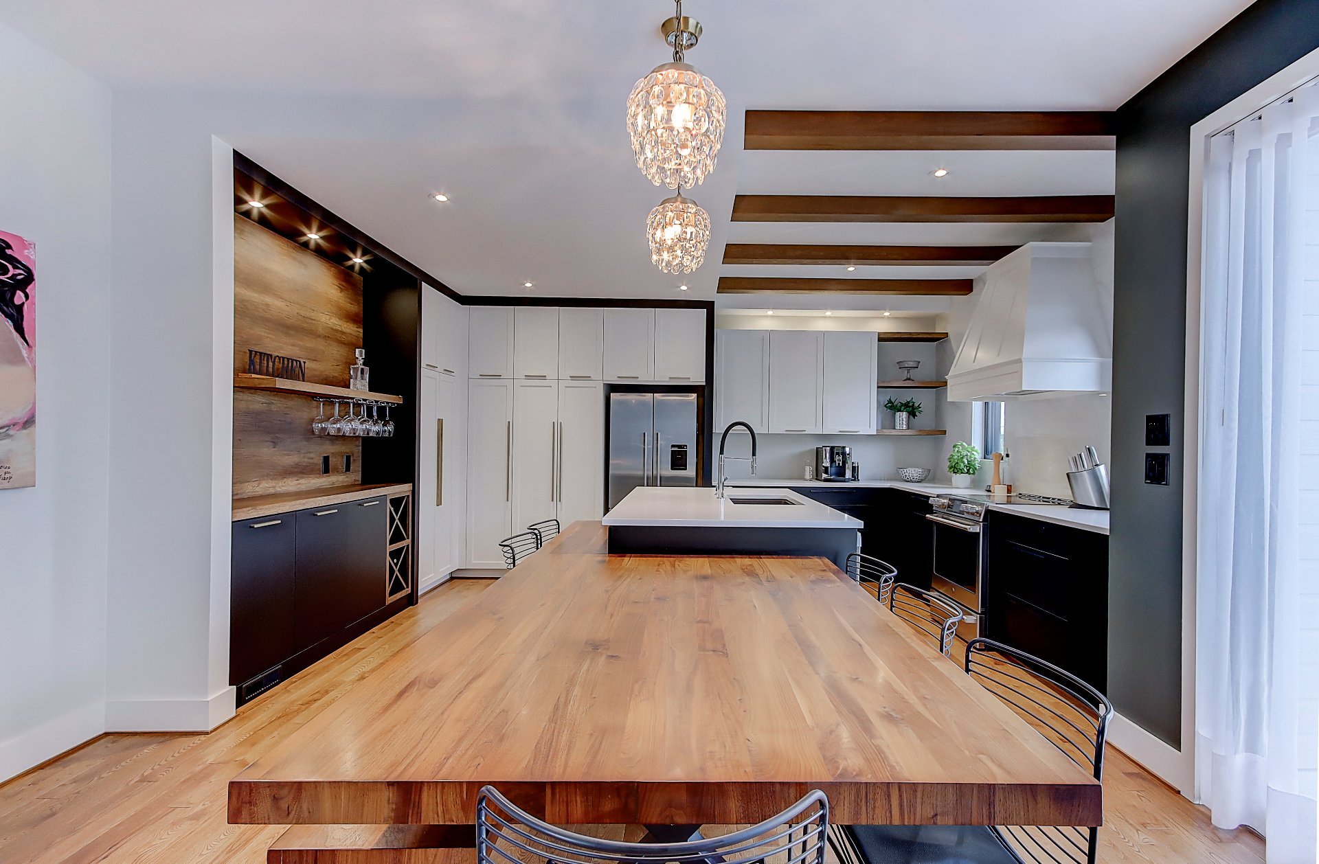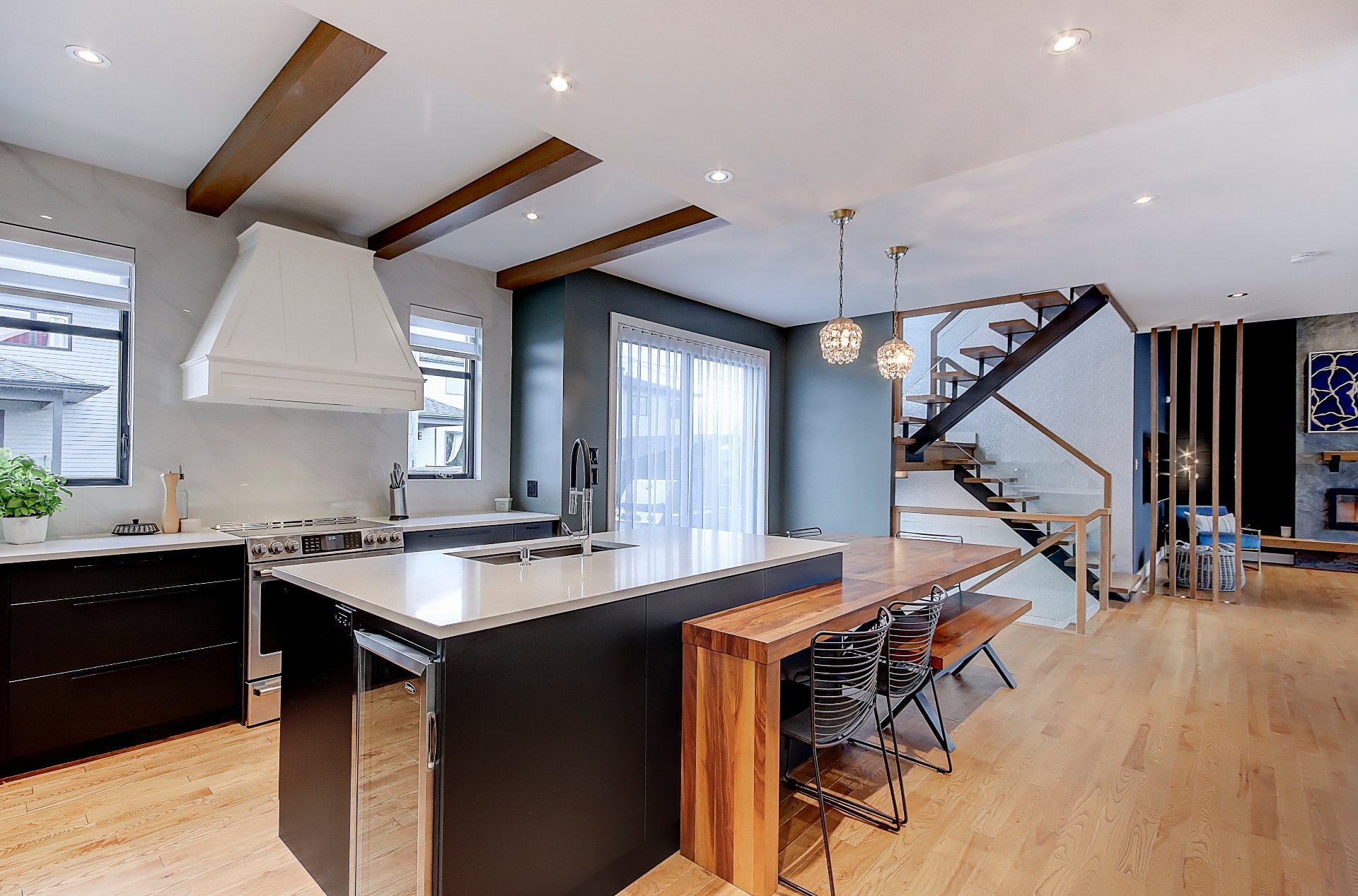 *Cuisine spacieuse avec plafond de 9', comptoir en quartz et table intégrée en noyer