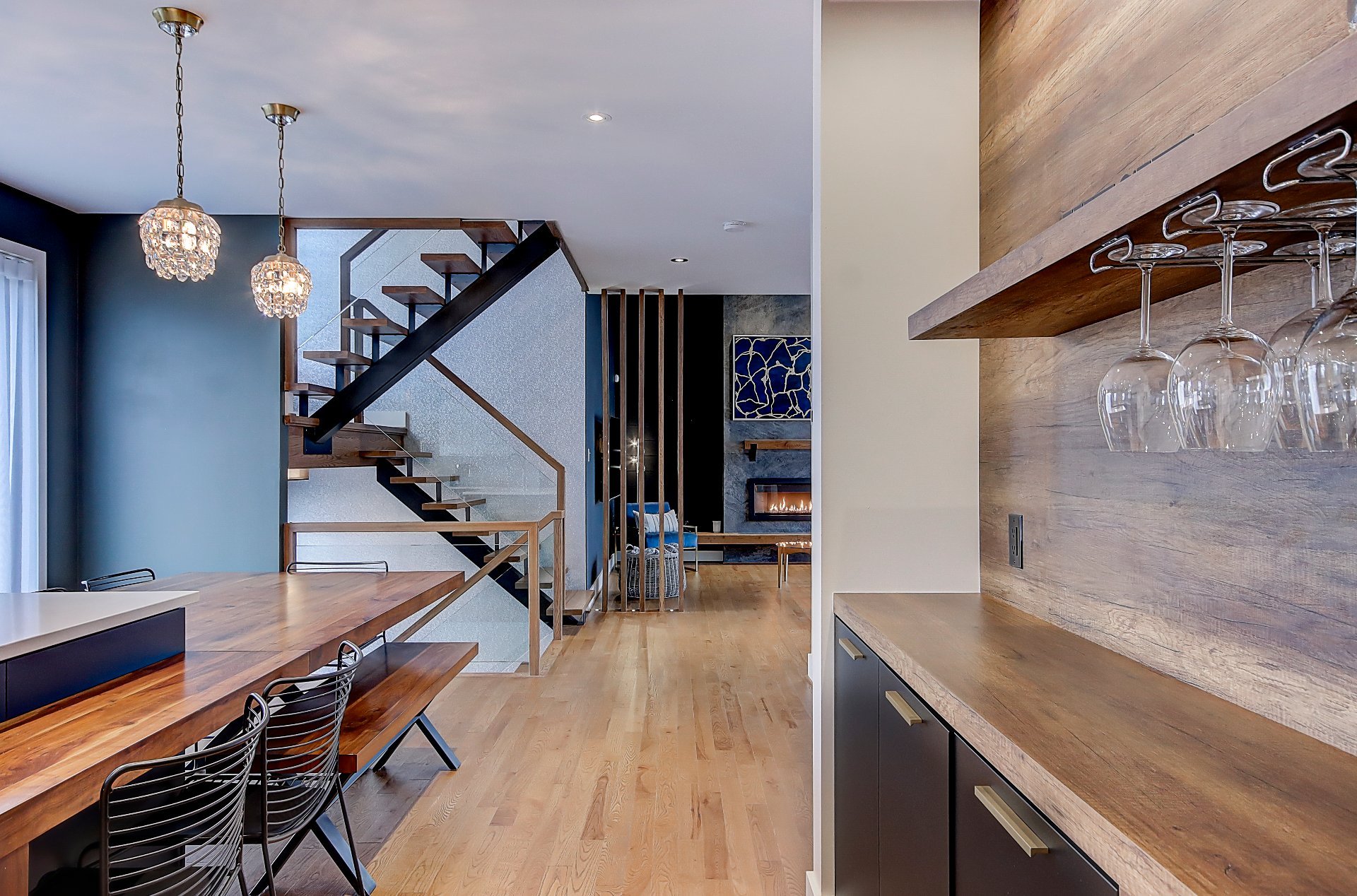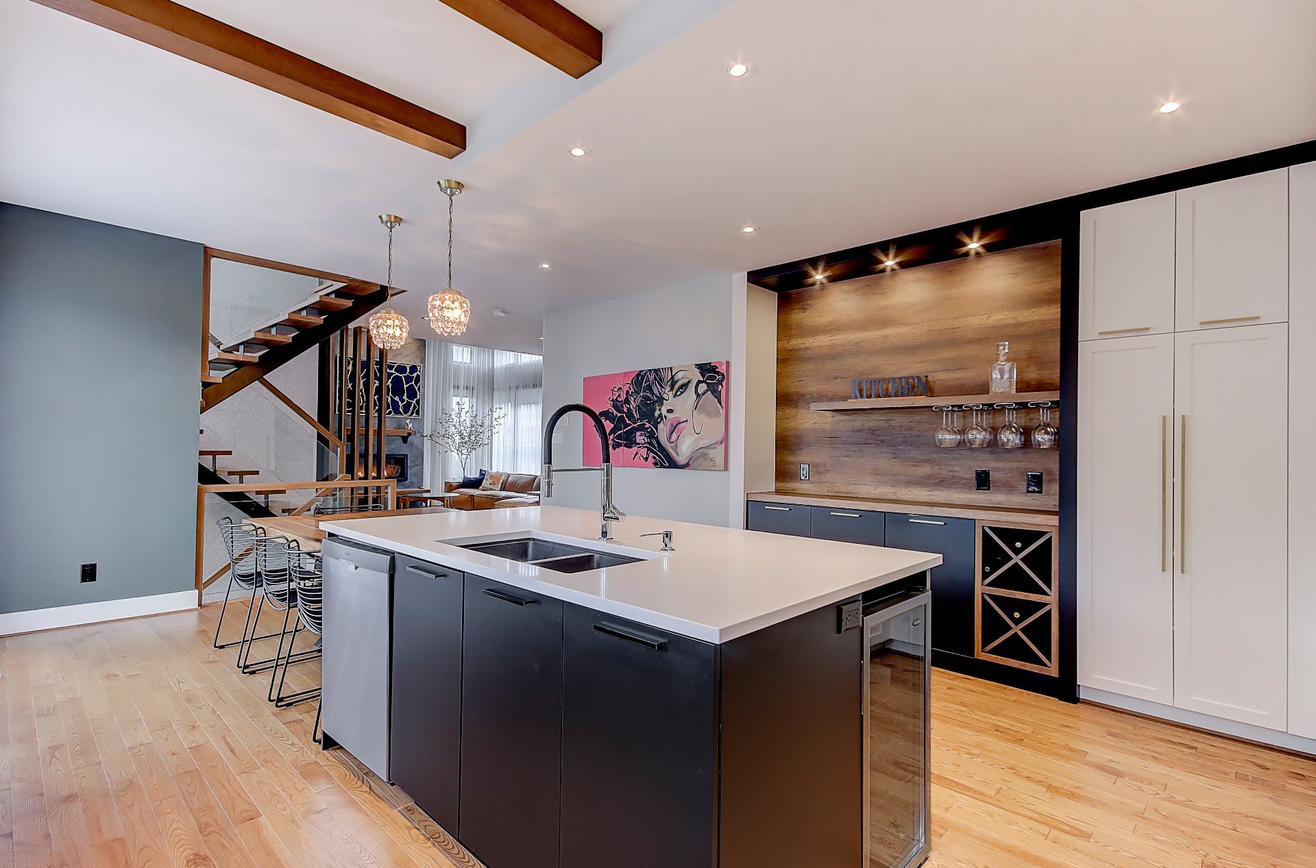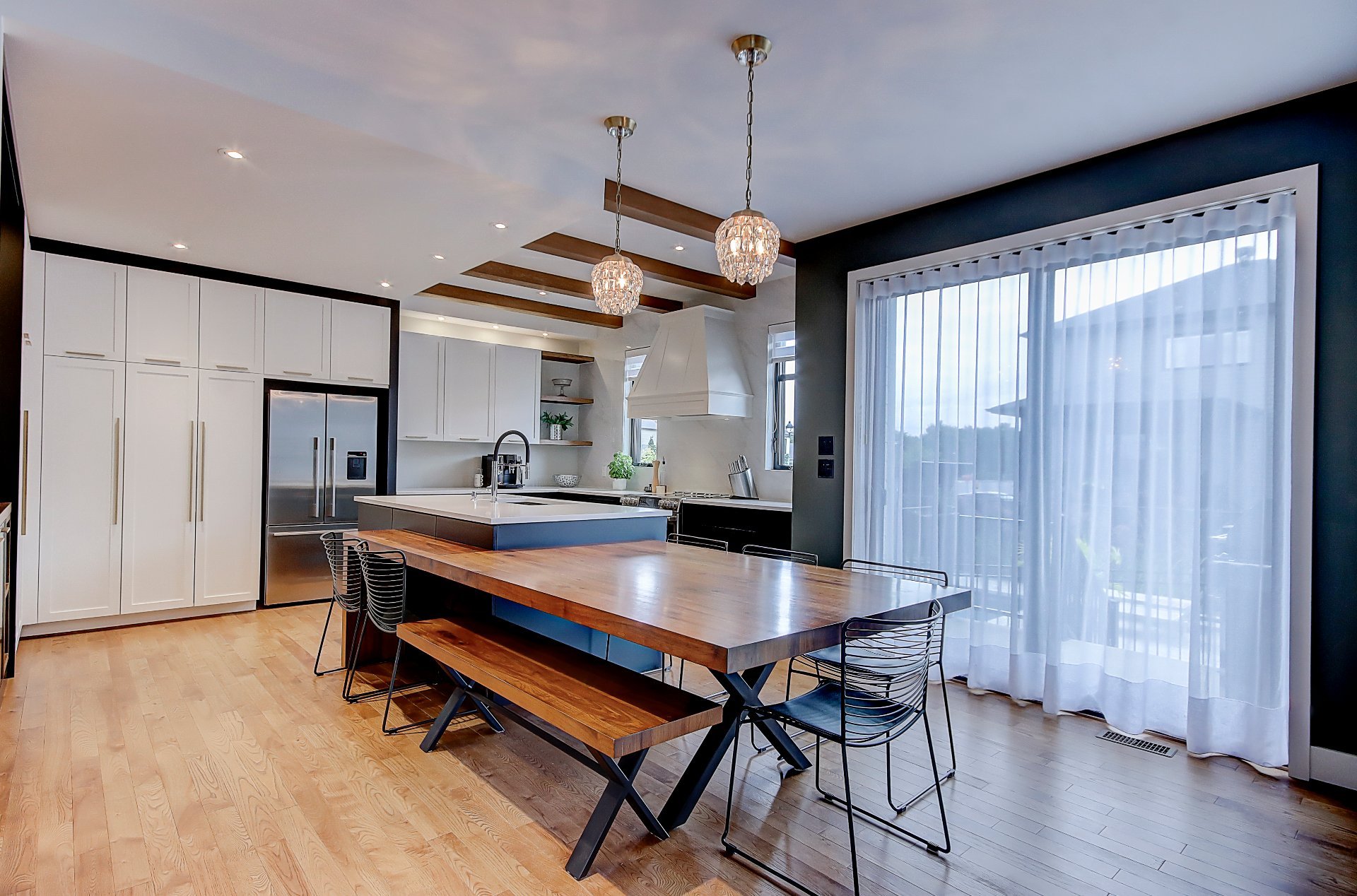 *Cuisine spacieuse avec plafond de 9', comptoir en quartz et table intégrée en noyer